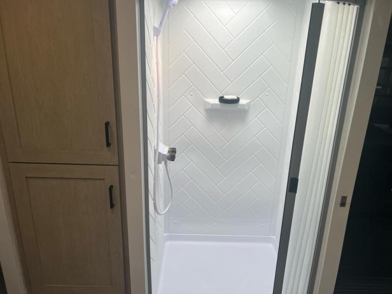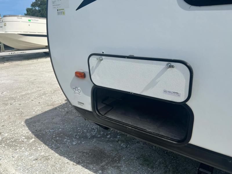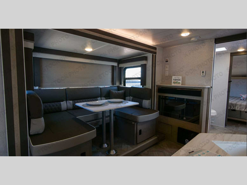 This travel trailer is packed full of features, but is still lightweight coming in at just over 5,000 lbs.! You will feel right at home in the front master bedroom with a custom king bed that has closets on either side, CPAP storage, and a walk-in closet to keep your clothes looking their best. The walk-through bathroom has a walk-in shower with fiberglass surround and a skylight above for added natural lighting as you get ready. The U-shaped dinette slide has a panoramic window for you to enjoy your beautiful scenery as you eat dinner, and there is a fireplace at the entertainment center for a relaxing evening indoors. There is a pass-through storage area to store your outdoor camping gear, and a 16' power awning and exterior speakers to crank up the tunes!