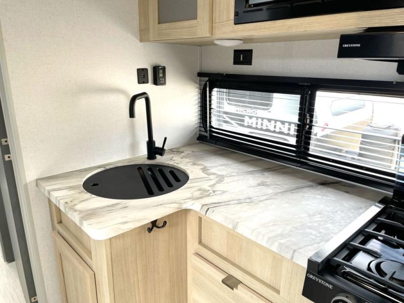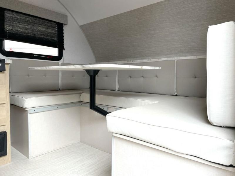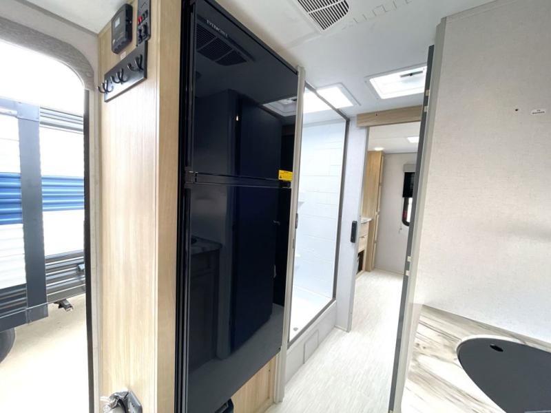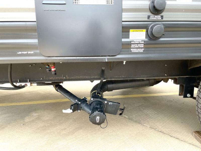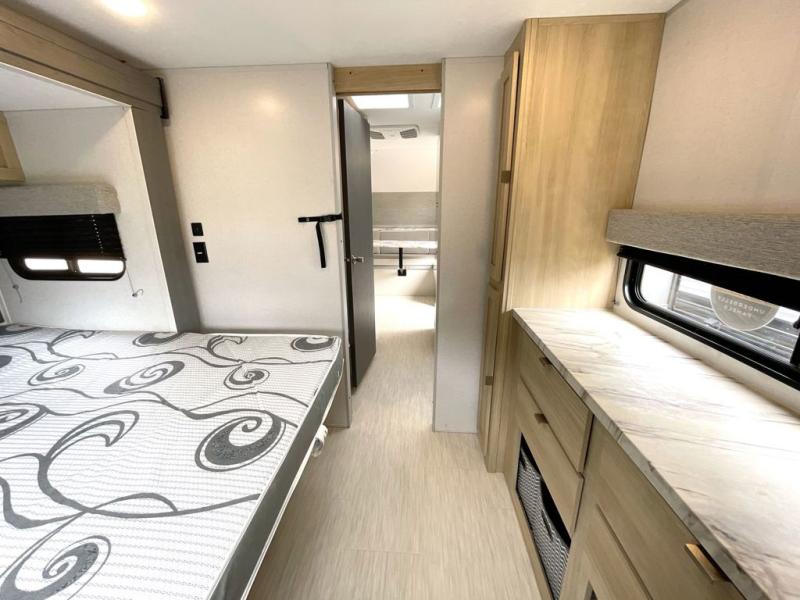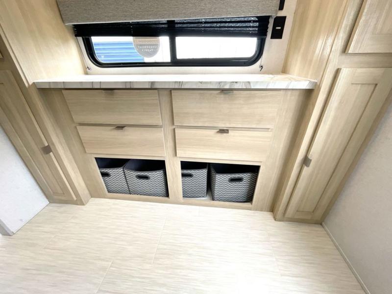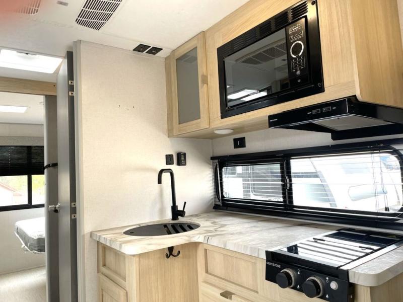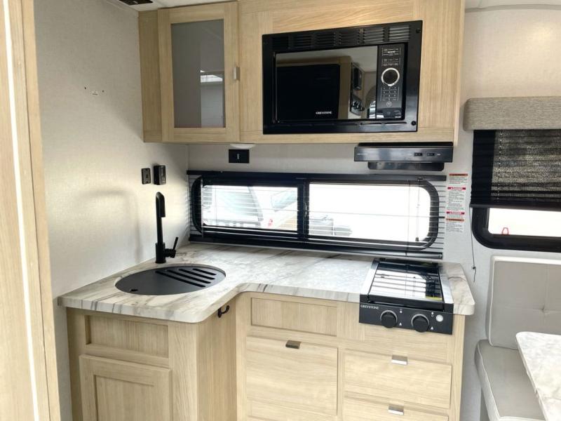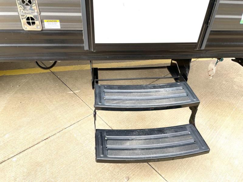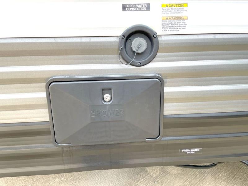 This travel trailer is perfect for couples who want to explore the great outdoors together! There is a rear private bedroom with a queen bed slide for more interior space, a dresser and wardrobes on either side of it for your clothes. Plus, it enters right into the split style bathroom which will come in handy when one person wants to freshen up in the shower while another uses the private toilet and sink. You can prepare your best home cooked meals with the two burner cooktop then enjoy it at the front U-shaped dinette which can also transform into an extra sleeping space. Enjoy making pancakes on the outdoor kitchen under the 15' power awning!