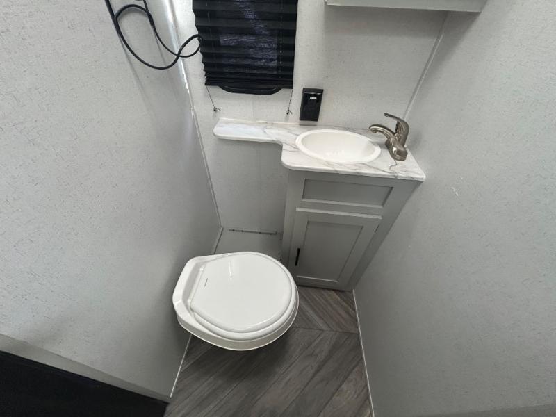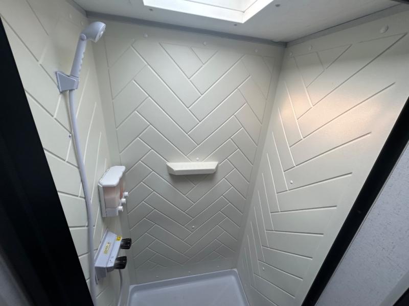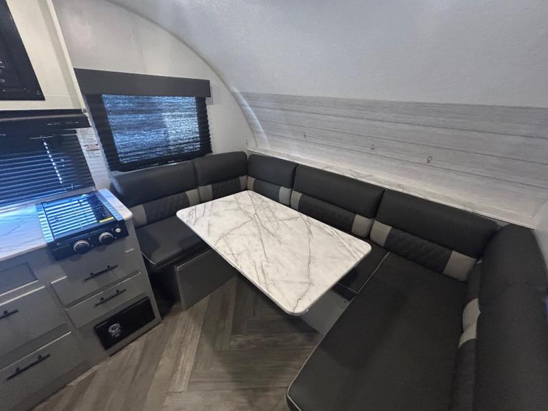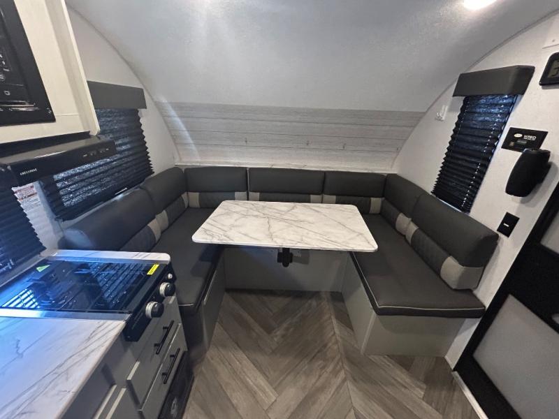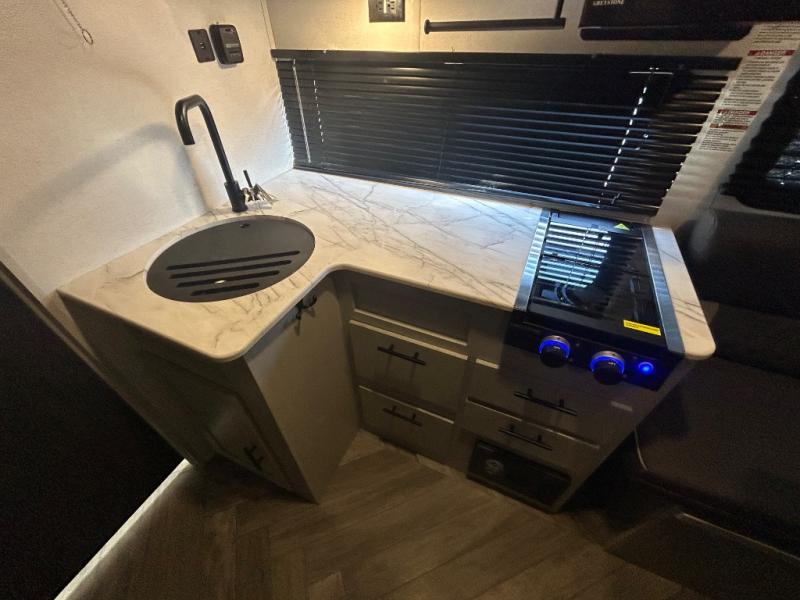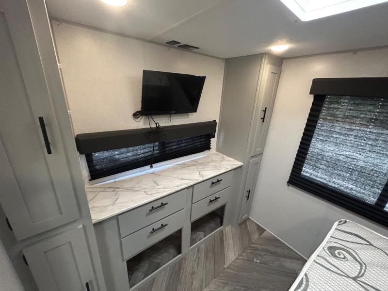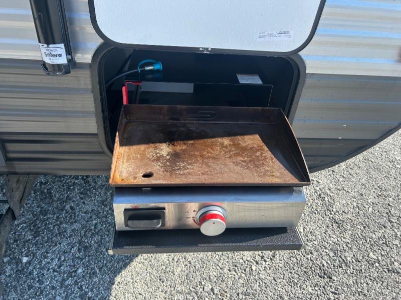 This travel trailer is perfect for couples who want to explore the great outdoors together! There is a rear private bedroom with a queen bed slide for more interior space, a dresser and wardrobes on either side of it for your clothes. Plus, it enters right into the split style bathroom which will come in handy when one person wants to freshen up in the shower while another uses the private toilet and sink. You can prepare your best home cooked meals with the two burner cooktop then enjoy it at the front U-shaped dinette which can also transform into an extra sleeping space. Enjoy making pancakes on the outdoor kitchen under the 15' power awning!