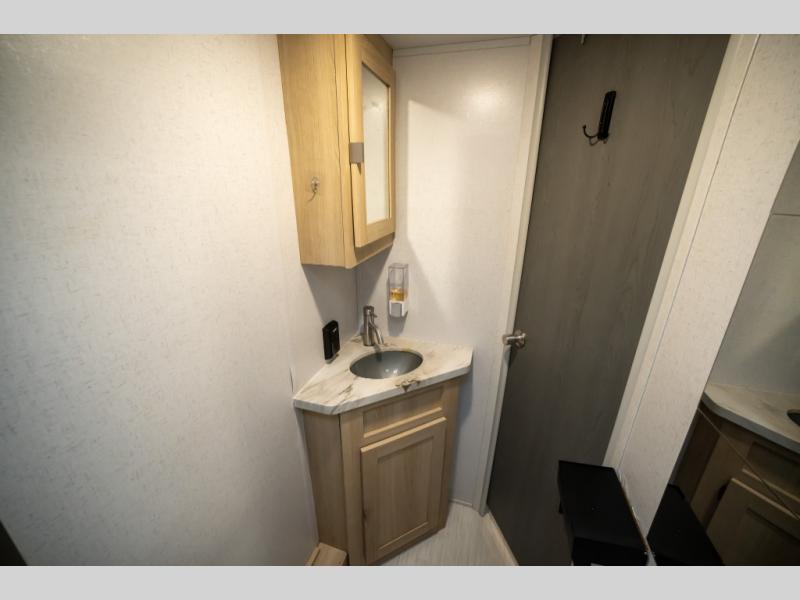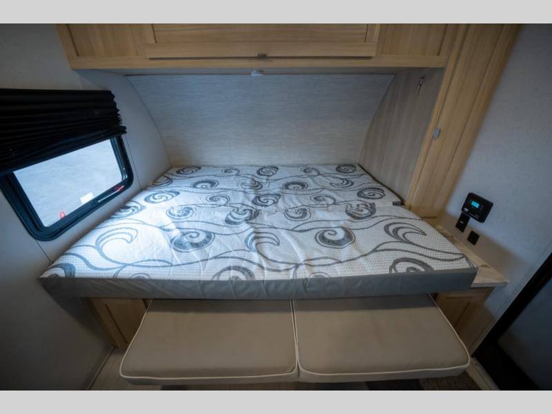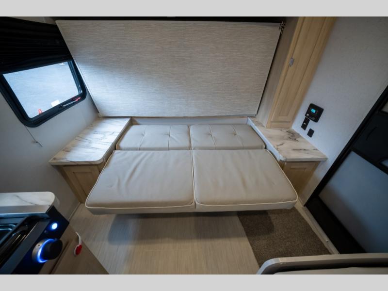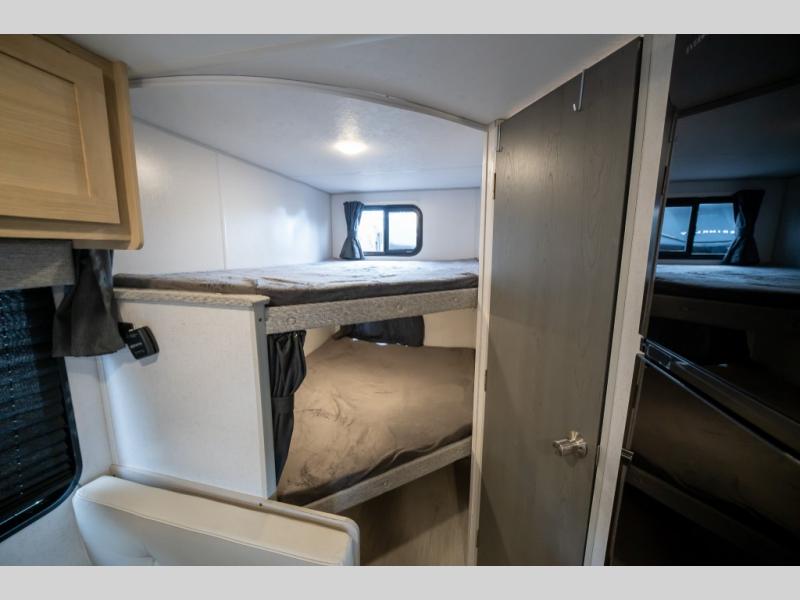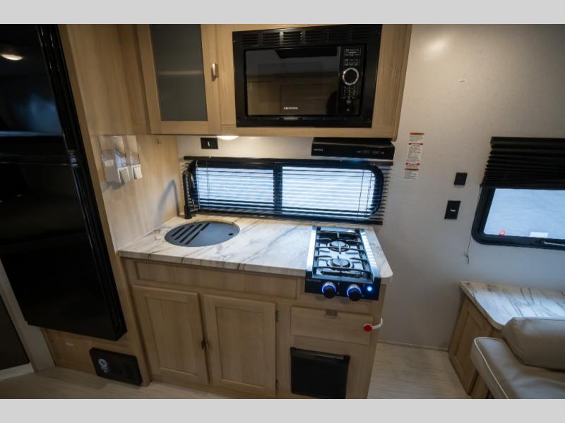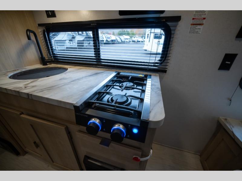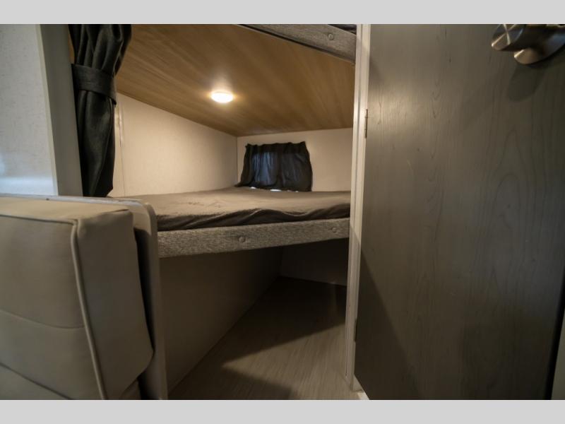 No need will go unmet with this travel trailer! It features a front Murphy bed that will double as seating and sleeping space, double-size bunk beds with storage, plus a booth dinette. You can prepare your best home cooked meals indoors with the two burner cooktop or head to the outside kitchen to fry up some burgers while breathing in some fresh air. You will also appreciate the outside shower and the front exterior full pass-through storage area for all your outdoor gear.
