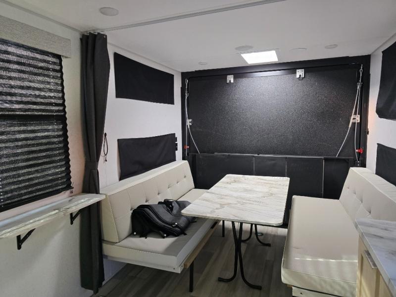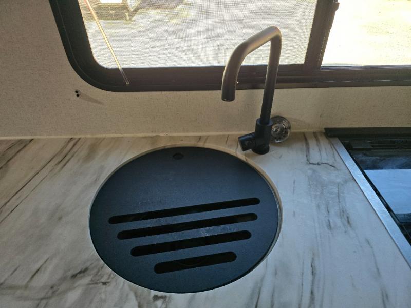 Sleeping for four, 13' of toy parking space, and a raised rear ramp patio deck can only mean one thing, a whole lot of fun! Grab your gear and a couple of friends and head out for a camping weekend in the playground of your choice. Bring the quad, bikes, or take the kayaks to the lake and enjoy all sorts of fun. Unload your toys and gear and set up the double 30" x 72" sofas with table between in the garage area for added seating during meals, games time, or just hanging out. The kitchen is fully equipped to keep everyone fueled for all the adventures you can create. A full bath with shower including a skylight for added natural light and headroom makes it easy to get cleaned up. Anyone waiting in line can certainly use the hot/cold shower outside to rinse off. When you are ready to sleep, the front private bedroom will be a welcome retreat and you will also find comfortable sleeping for two more with the 30" x 72" sleeper sofas folded down.