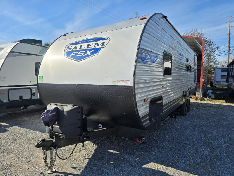 The Forest River Salem FSX travel trailers and toy hauler travel trailers are ultra comfortable and lightweight, perfect for first time or seasoned campers alike! You will love how easy it will be to relax with residential features that will make your space feel just like home, and the durable construction means you can enjoy your RV for years to come. There are a wide variety of floorplans to choose from, including couple's trailers, bunk models, and toy haulers, all with full bath and kitchen amenities and plenty of storage for all your gear!
