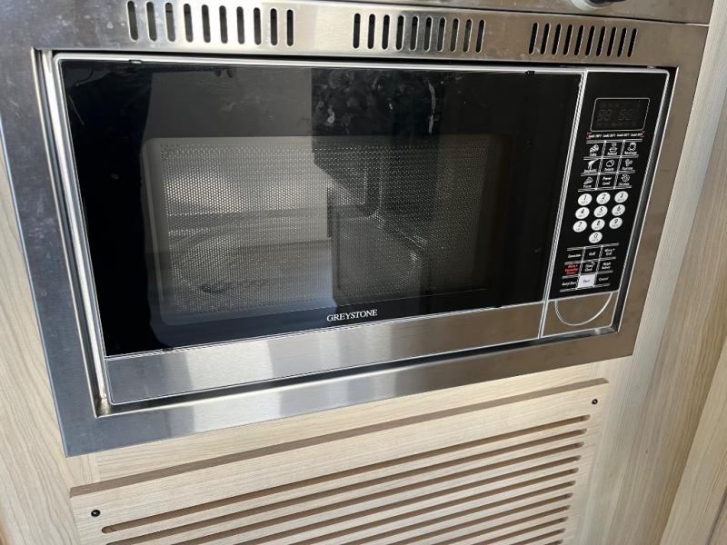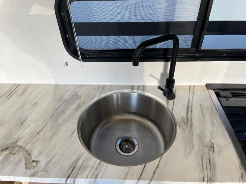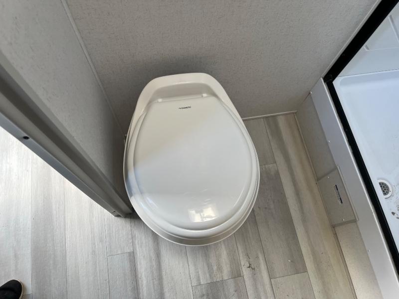 Sleeping for four, 13' of toy parking space, and a raised rear ramp patio deck can only mean one thing, a whole lot of fun! Grab your gear and a couple of friends and head out for a camping weekend in the playground of your choice. Bring the quad, bikes, or take the kayaks to the lake and enjoy all sorts of fun. Unload your toys and gear and set up the double 30" x 72" sofas with table between in the garage area for added seating during meals, games time, or just hanging out. The kitchen is fully equipped to keep everyone fueled for all the adventures you can create. A full bath with shower including a skylight for added natural light and headroom makes it easy to get cleaned up. Anyone waiting in line can certainly use the hot/cold shower outside to rinse off. When you are ready to sleep, the front private bedroom will be a welcome retreat and you will also find comfortable sleeping for two more with the 30" x 72" sleeper sofas folded down.