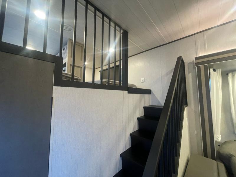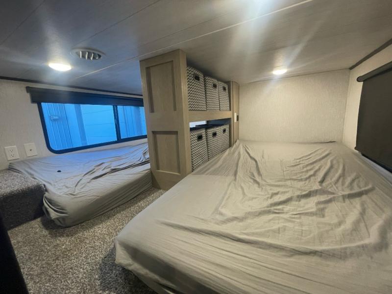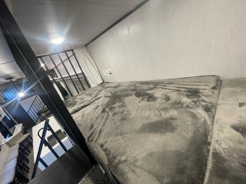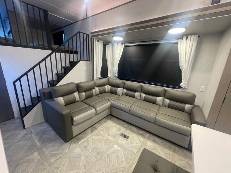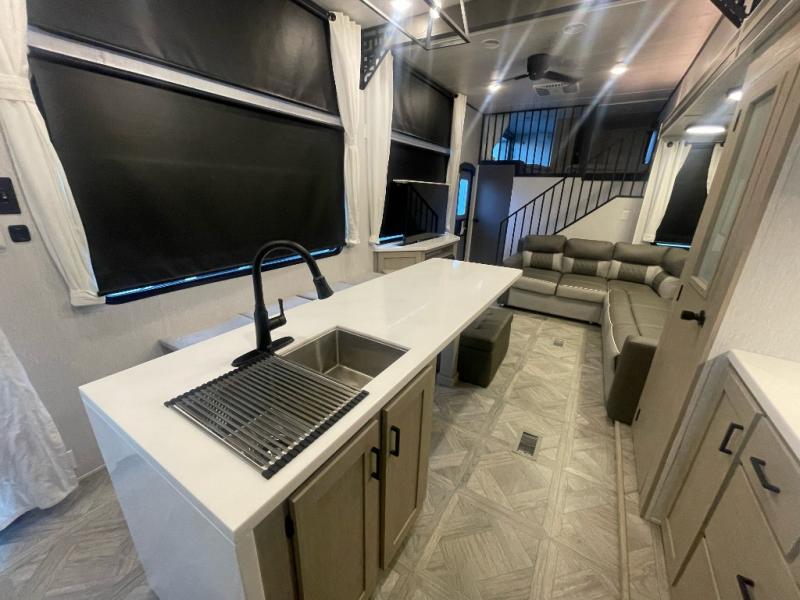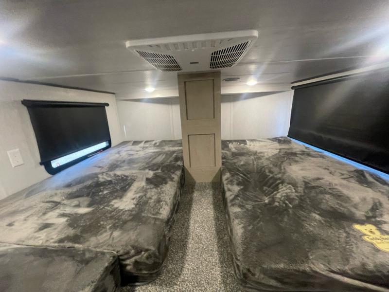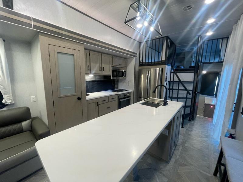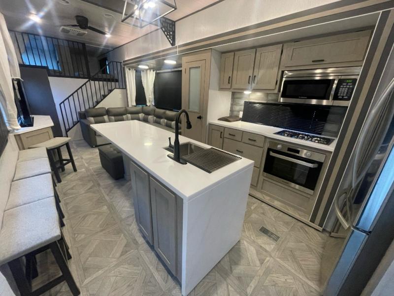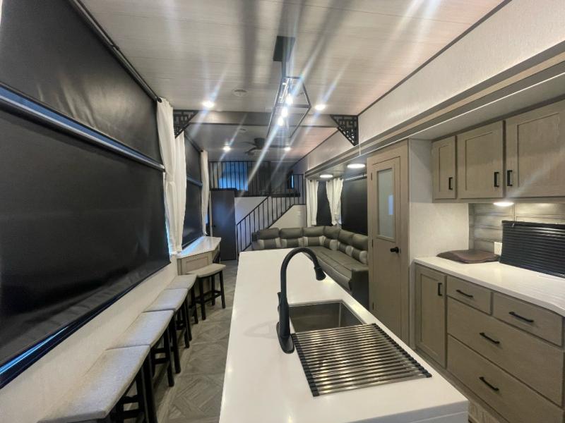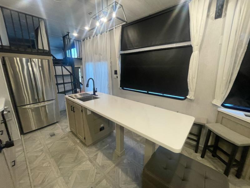 You will feel right at home in this destination trailer! It has not only has one loft in the rear with two 42" x 74" bunk mats, but also a second loft in the front with spiral steps leading up to two bunk mats. The front private bedroom has a custom king bed slide to lay your head on at night with front windows to let in lots of natural lighting and sunshine in the morning. Relax in true comfort at night on the L-shaped sectional sofa across from the entertainment center with a fireplace. The kitchen island provides extra space to prepare delicious meals and comes with four bar stools to enjoy your breakfast each morning. Everyone will stay squeaky clean with a walk-in shower in the rear private bedroom, plus there is an area prepped to add an optional washer and dryer. Head outside through either the patio door or the second entry/exit door each day!