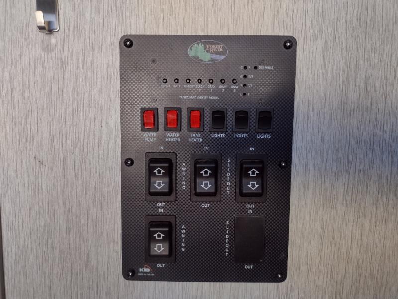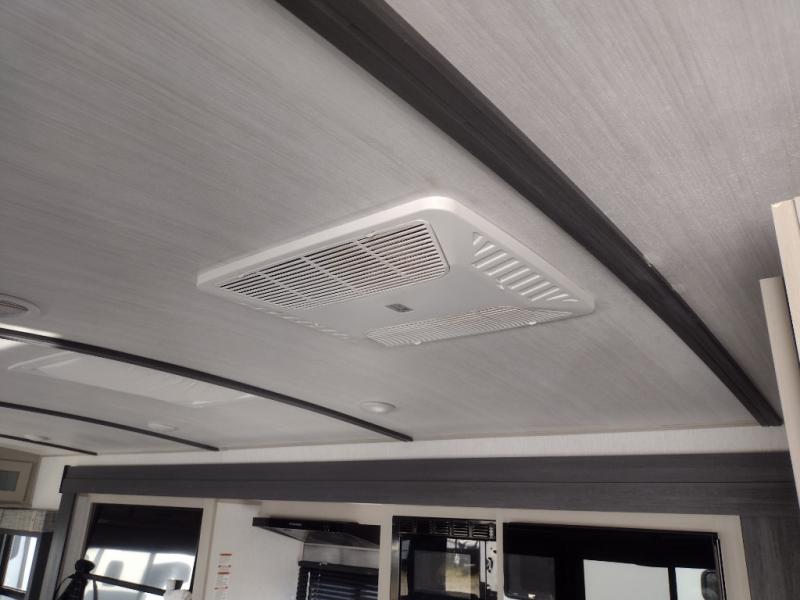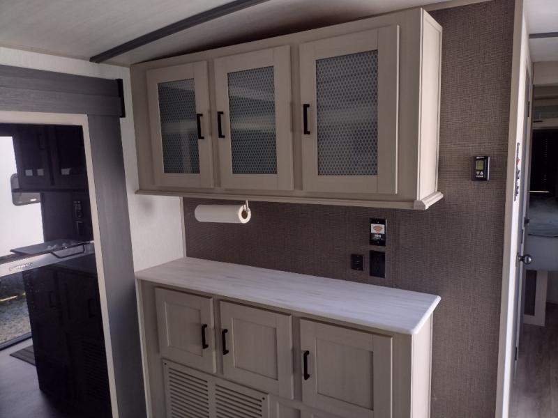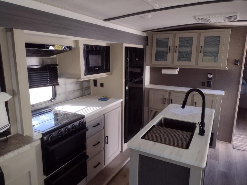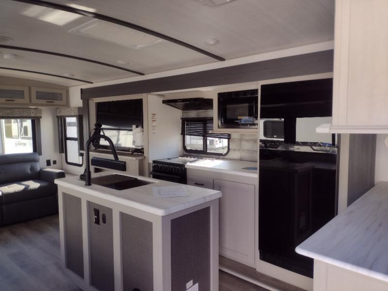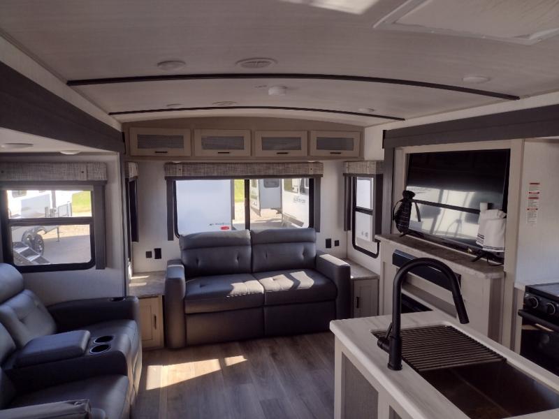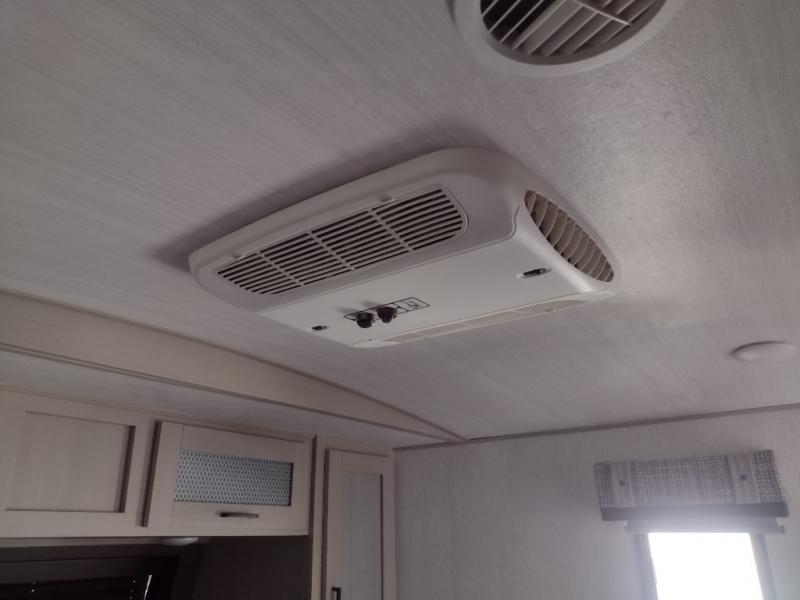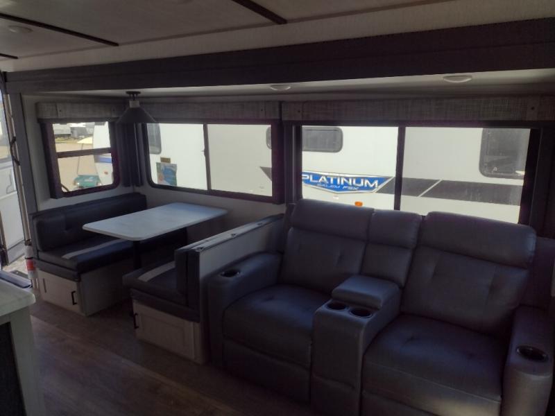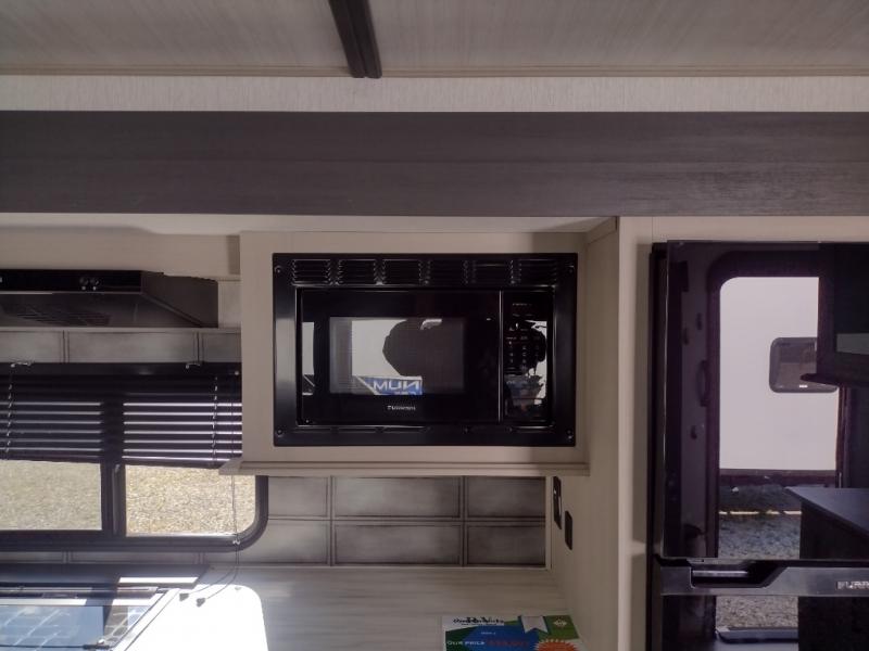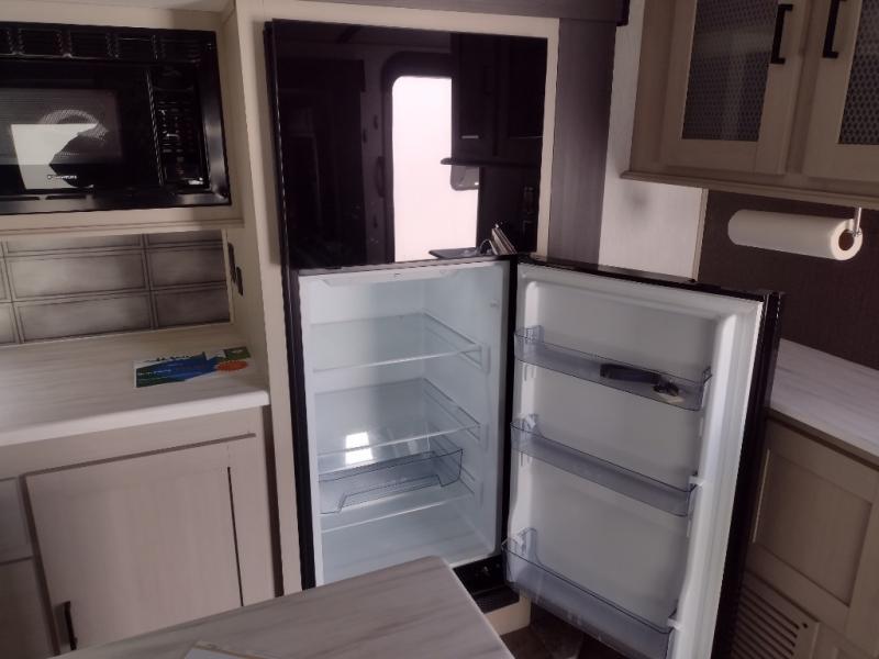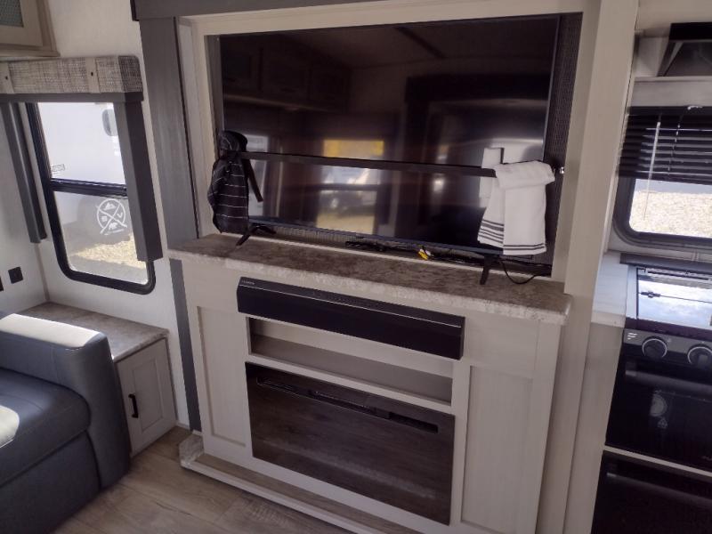 Step inside this luxurious travel trailer and see all that it has to offer! You will enjoy a good night's rest each night on the queen bed with wardrobes on either side to keep your clothes wrinkle free, and if you have a couple of guests then you can convert the rear tri-fold sofa or the booth dinette into a sleeping space. The 30" x 36" walk-in shower with a skylight above invites you to take a hot, steamy shower after a fun-filled day outdoors. Once you're cleaned up, you can grab some leftovers from the 10 cu. ft. 12V black refrigerator and warm it up in the microwave. There is also theatre seating across from the 50" LED TV with a 31" glass front electric fireplace below!