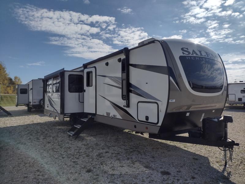 With each Forest River Salem Hemisphere fifth wheel and travel trailer, there are vacuum bonded "Aluma frame" sidewalls and floors, a heated and enclosed underbelly, and an extra large pass-through storage so you can bring along hiking gear, fishing poles, and more! Each model includes an Ivory Performance colored exterior fiberglass, a central switch center, a spare tire and carrier, and many more convenient features within the included Upgraded Options Package. There is also European Oak colored horizontal plank linoleum flooring, a Designer's Choice comforter, and saddle colored wood cabinetry to name a few at-home comforts. Power stabilizers comes standard with the VIP Package, along with 12V heat pads on all holding tanks, extra large Max-Tint panoramic window package, and the list goes on!
