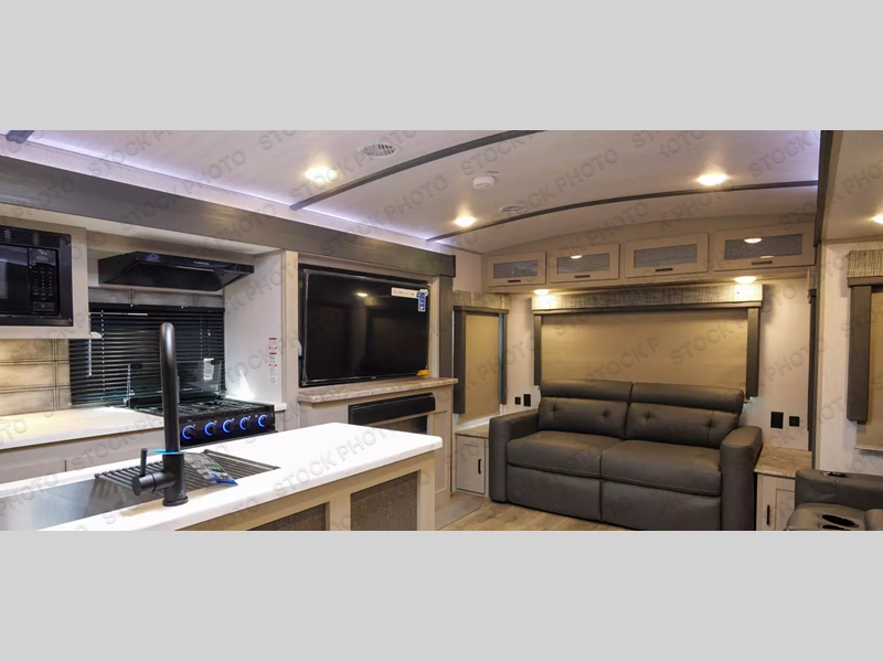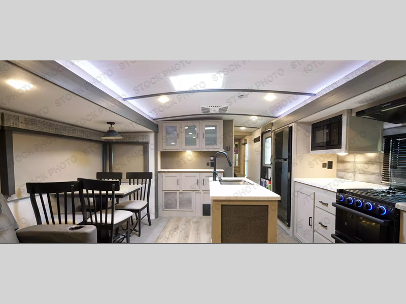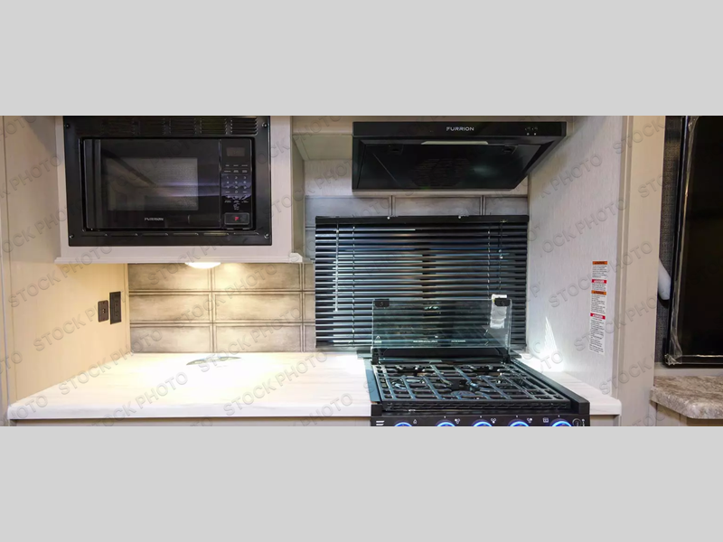 Once you step foot in this travel trailer, you won't want to camp any other way! There is plenty of entertainment and seating for everyone in the rear living area with the tri-fold sofa, the theatre seating with cupholders, and the 50" LED TV with a 31" glass front electric fireplace. You can cook your meals either indoors with the kitchen island or enjoy some fresh air at the outside kitchen/bar then head indoors and eat it comfortably at the booth dinette. There are plenty other convenient features like the hutch for your dishes, the 30" x 36" walk-in shower, and the Texas-sized exterior pass-through storage area!