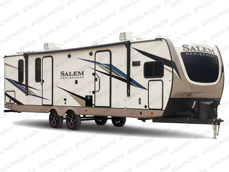 With each Forest River Salem Hemisphere fifth wheel and travel trailer, there are vacuum bonded "Aluma frame" sidewalls and floors, a heated and enclosed underbelly, and an extra large pass-through storage so you can bring along hiking gear, fishing poles, and more! Each model includes an Ivory Performance colored exterior fiberglass, a central switch center, a spare tire and carrier, and many more convenient features within the included Upgraded Options Package. There is also European Oak colored horizontal plank linoleum flooring, a Designer's Choice comforter, and saddle colored wood cabinetry to name a few at-home comforts. Power stabilizers comes standard with the VIP Package, along with 12V heat pads on all holding tanks, extra large Max-Tint panoramic window package, and the list goes on!