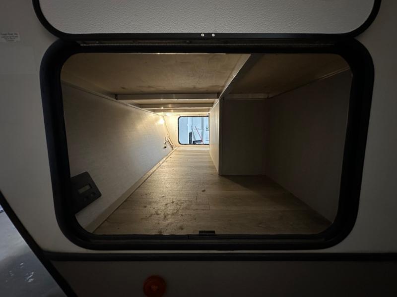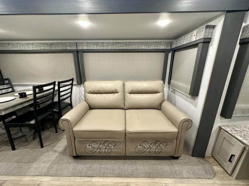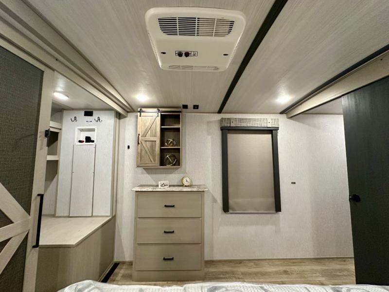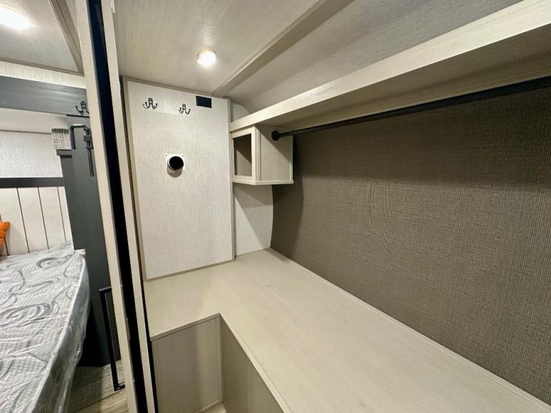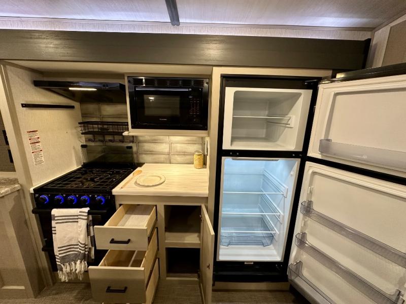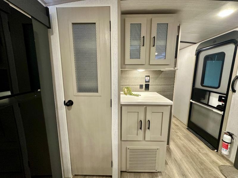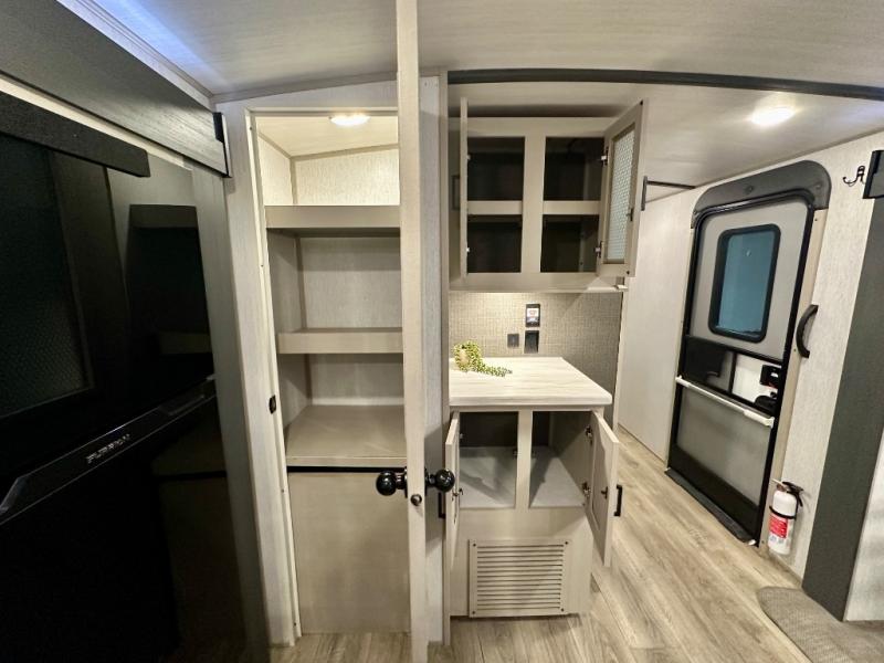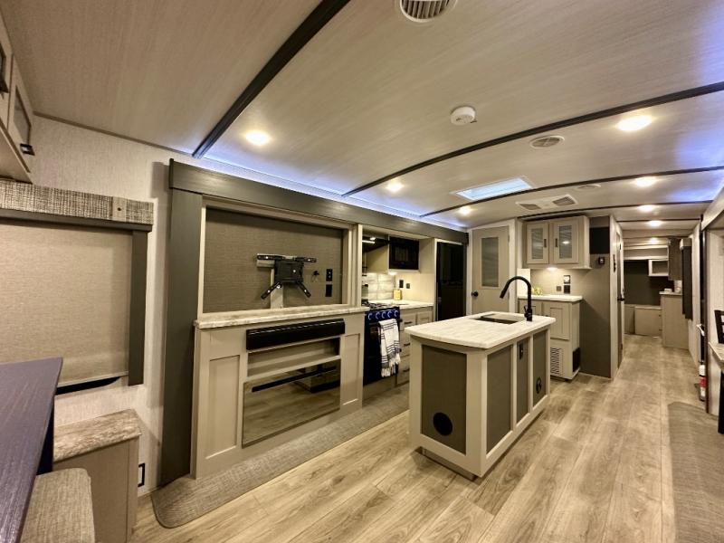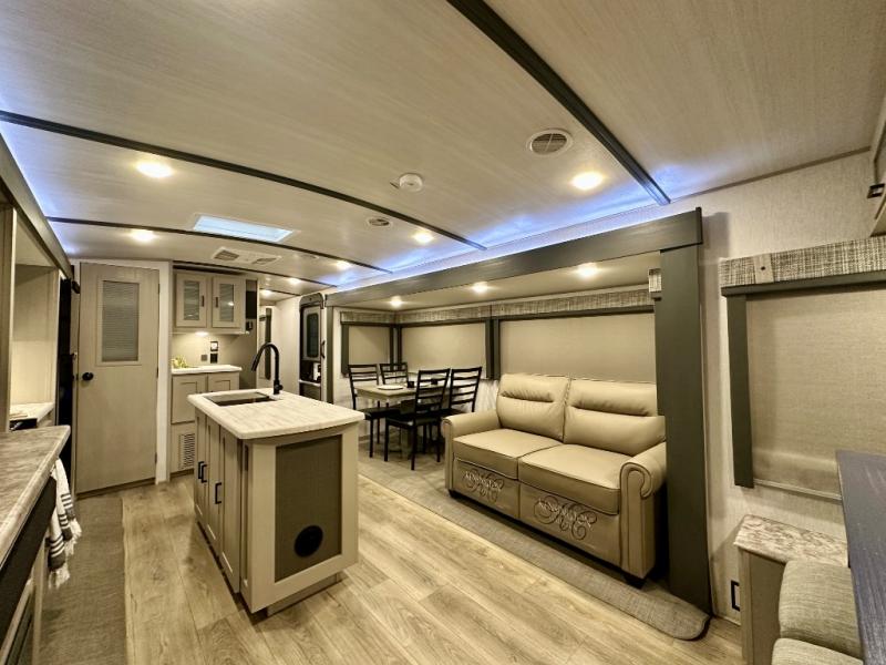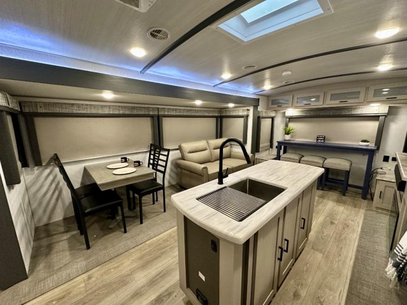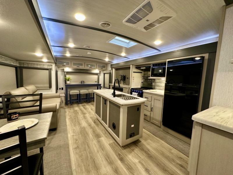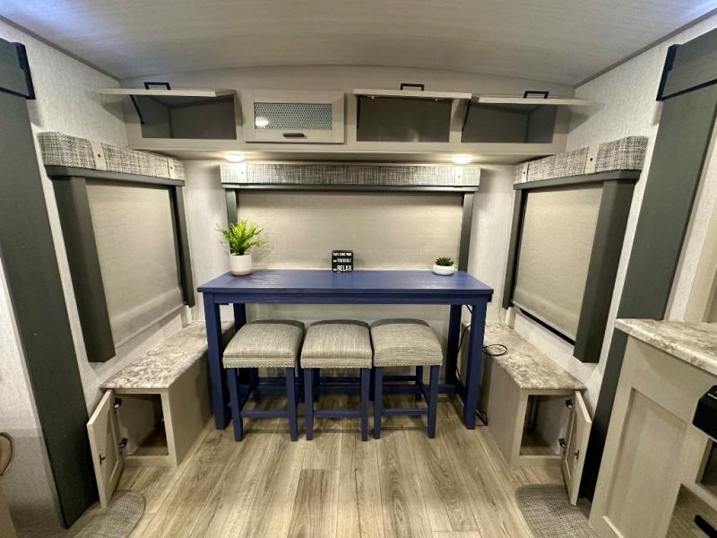This travel trailer is decked out in features you will love like the front walk-in wardrobe with a space prepped for the optional washer and dryer inside the front private bedroom! The full bathroom has everything you will need to get squeaky clean each morning including a residential walk-in shower with a skylight to let in some natural lighting. There is a hutch for you to store your dishes and a kitchen island to make meal prepping even easier. Once you have created a delicious meal, you can head to the booth dinette and enjoy eating it there comfortably while enjoying your view out of the panoramic window!