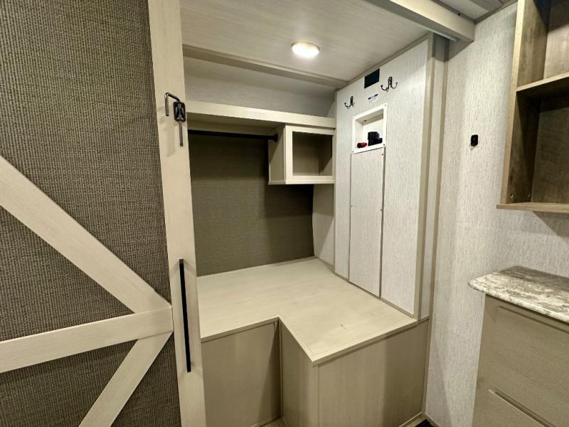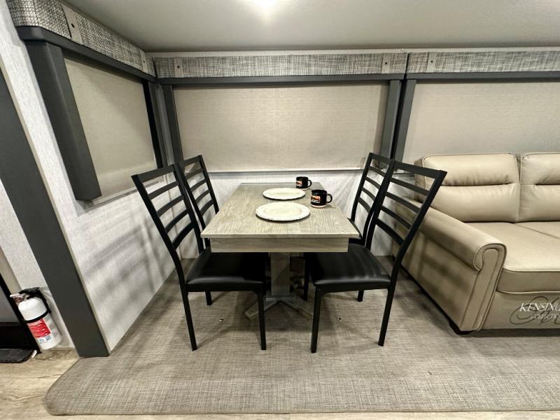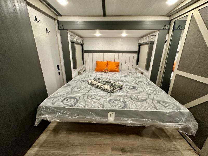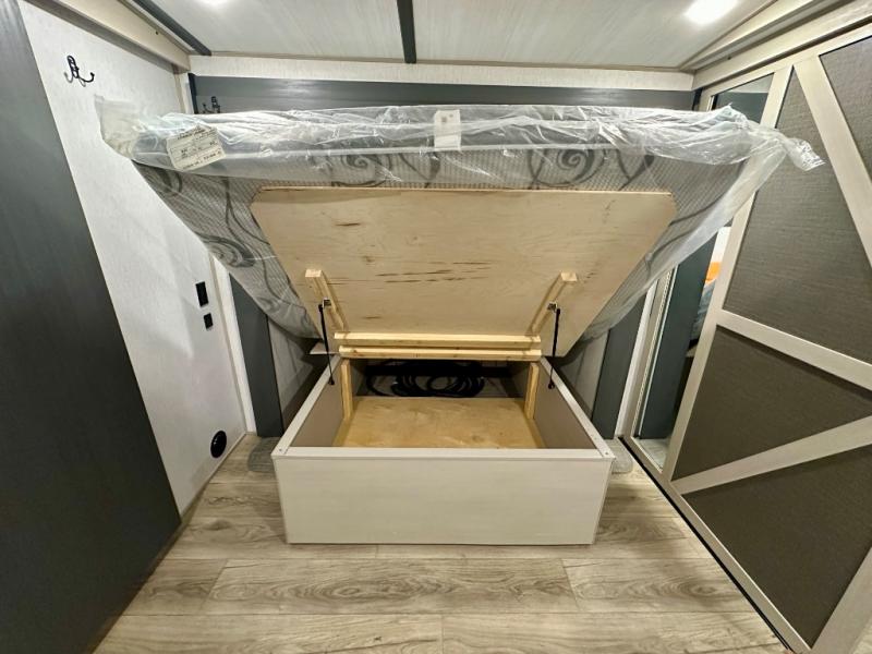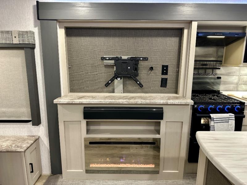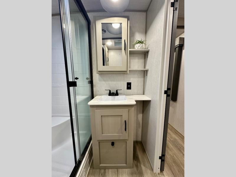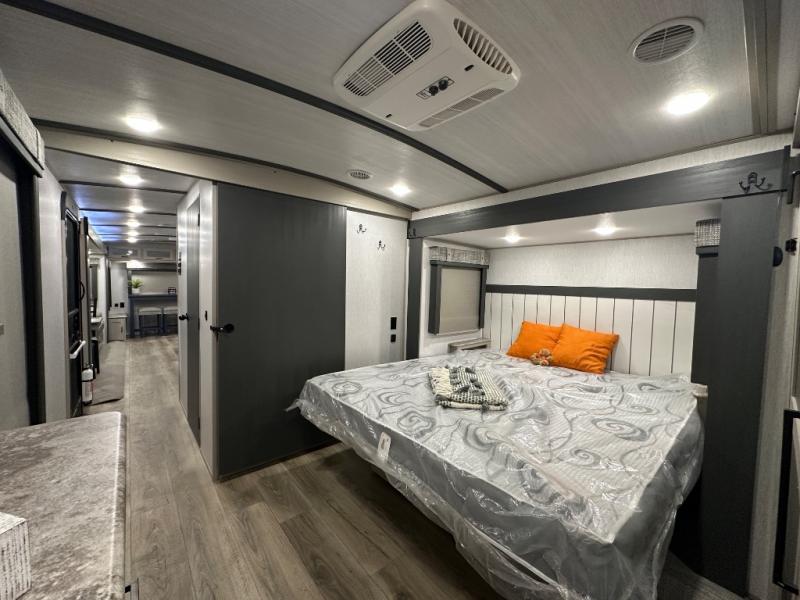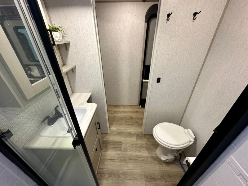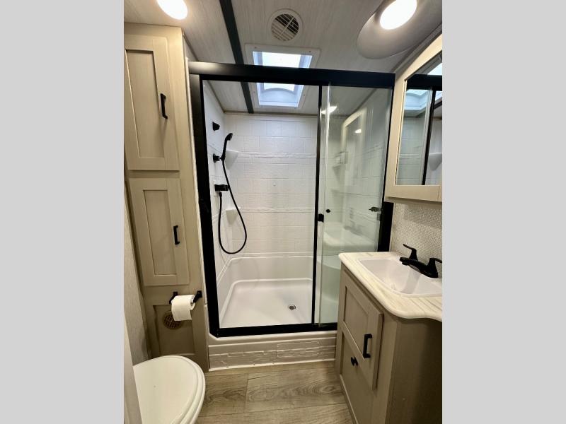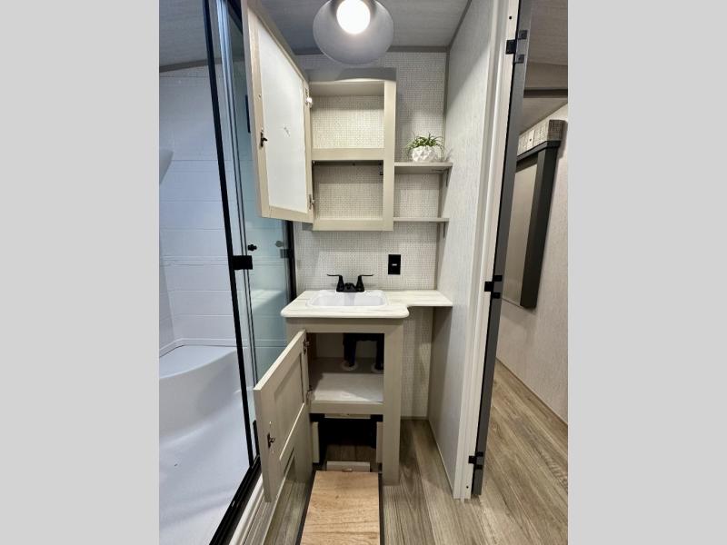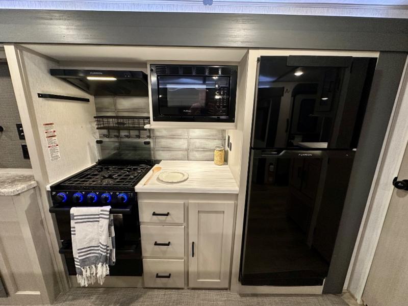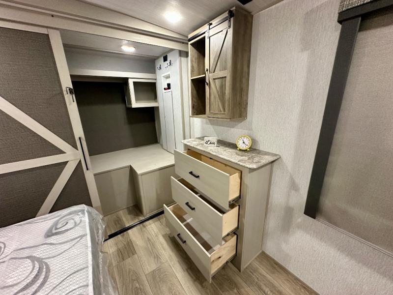 This travel trailer is decked out in features you will love like the front walk-in wardrobe with a space prepped for the optional washer and dryer inside the front private bedroom! The full bathroom has everything you will need to get squeaky clean each morning including a residential walk-in shower with a skylight to let in some natural lighting. There is a hutch for you to store your dishes and a kitchen island to make meal prepping even easier. Once you have created a delicious meal, you can head to the booth dinette and enjoy eating it there comfortably while enjoying your view out of the panoramic window!