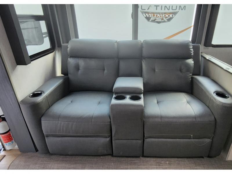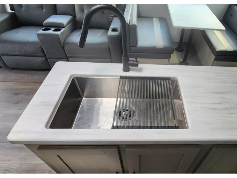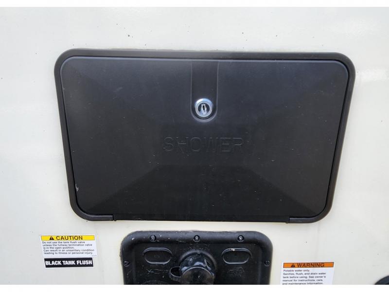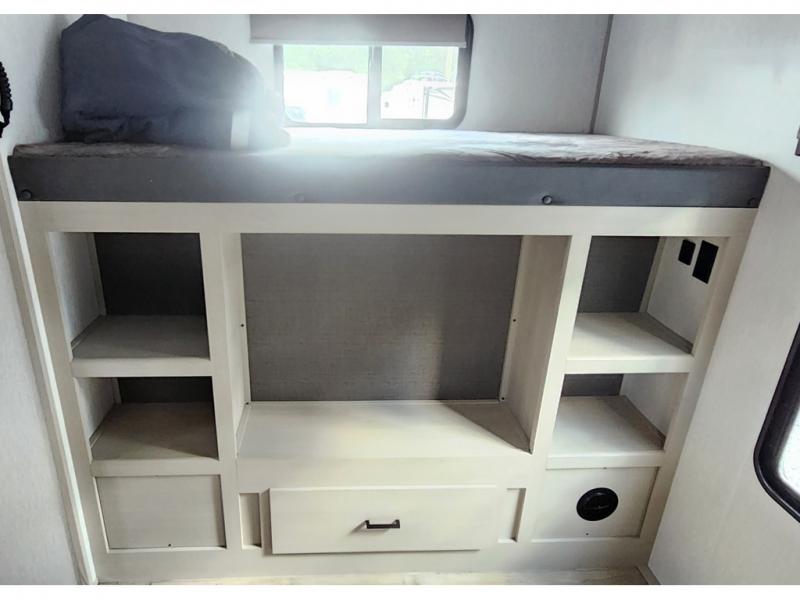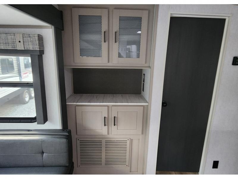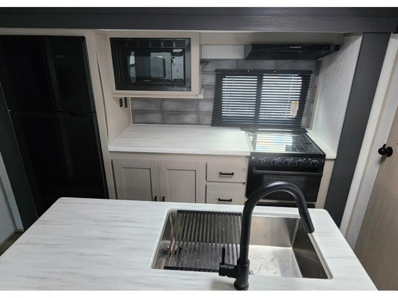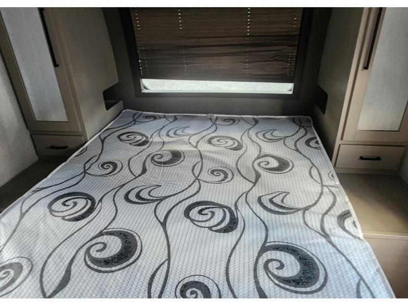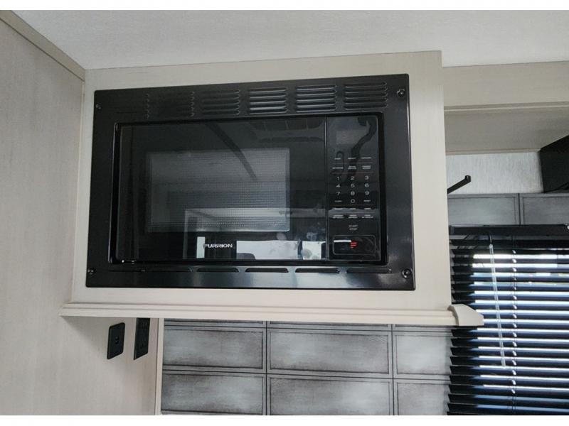 Your kids or friends are going to love camping in this travel trailer! It features a rear private bunkhouse with a bunk above a Versa queen convertible bed/sofa plus an additional bunk above an entertainment center with storage below. Just outside the bunkhouse is the kitchen with a 10 cu. ft. 12V black refrigerator, a microwave, a kitchen island, and a chef-sized walk-in pantry big enough to store everyone's favorite snacks. The booth dinette and the theatre seating are right next to panoramic windows so you can enjoy looking out at your beautiful scenery. You will also love taking a hot, steamy shower in the 30" x 36" shower with skylights and get a good night's rest on the queen bed in the front private bedroom!