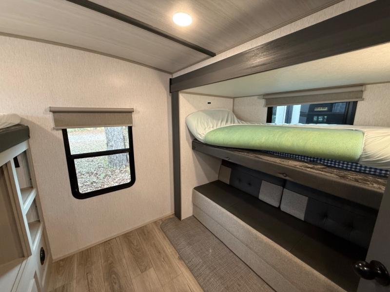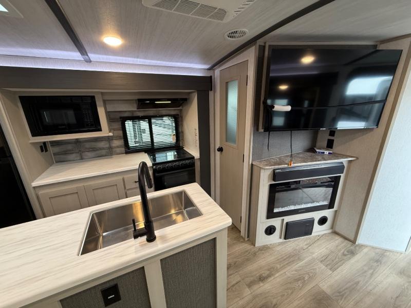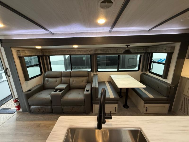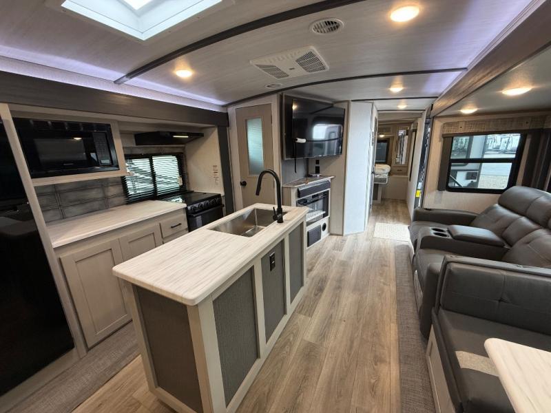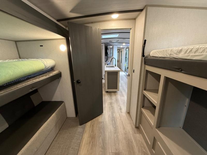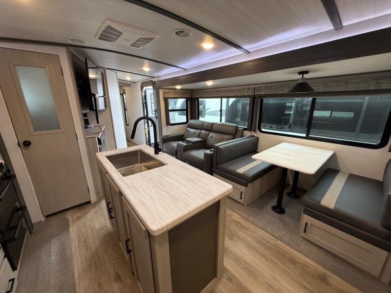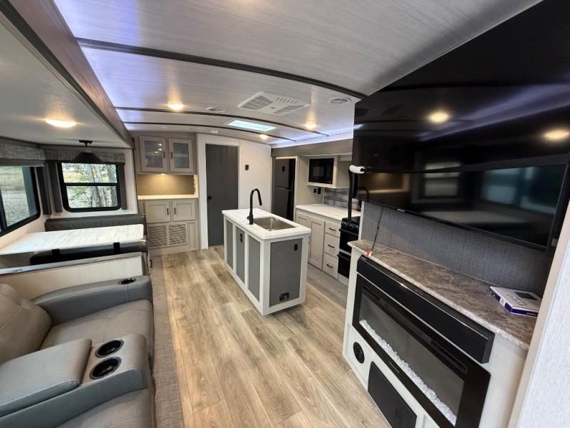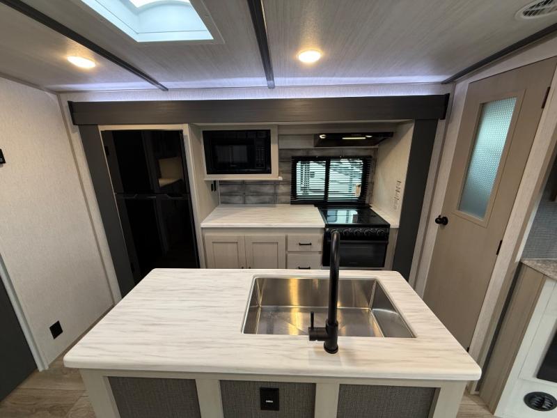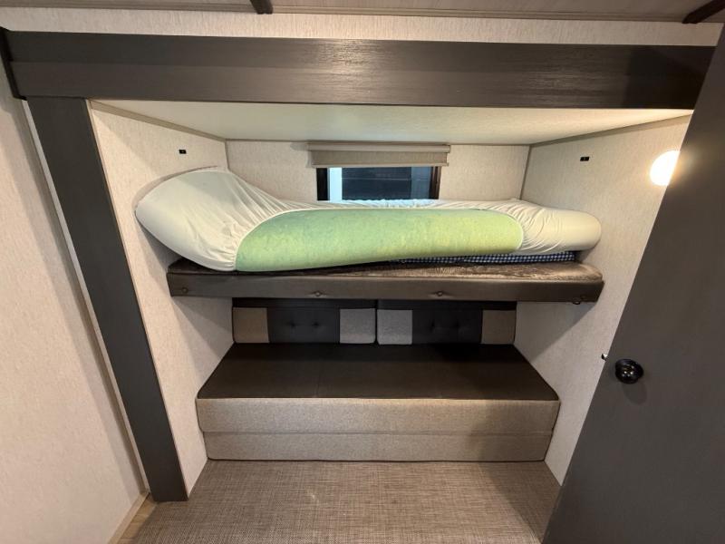 Your kids or friends are going to love camping in this travel trailer! It features a rear private bunkhouse with a bunk above a Versa queen convertible bed/sofa plus an additional bunk above an entertainment center with storage below. Just outside the bunkhouse is the kitchen with a 10 cu. ft. 12V black refrigerator, a microwave, a kitchen island, and a chef-sized walk-in pantry big enough to store everyone's favorite snacks. The booth dinette and the theatre seating are right next to panoramic windows so you can enjoy looking out at your beautiful scenery. You will also love taking a hot, steamy shower in the 30" x 36" shower with skylights and get a good night's rest on the queen bed in the front private bedroom!