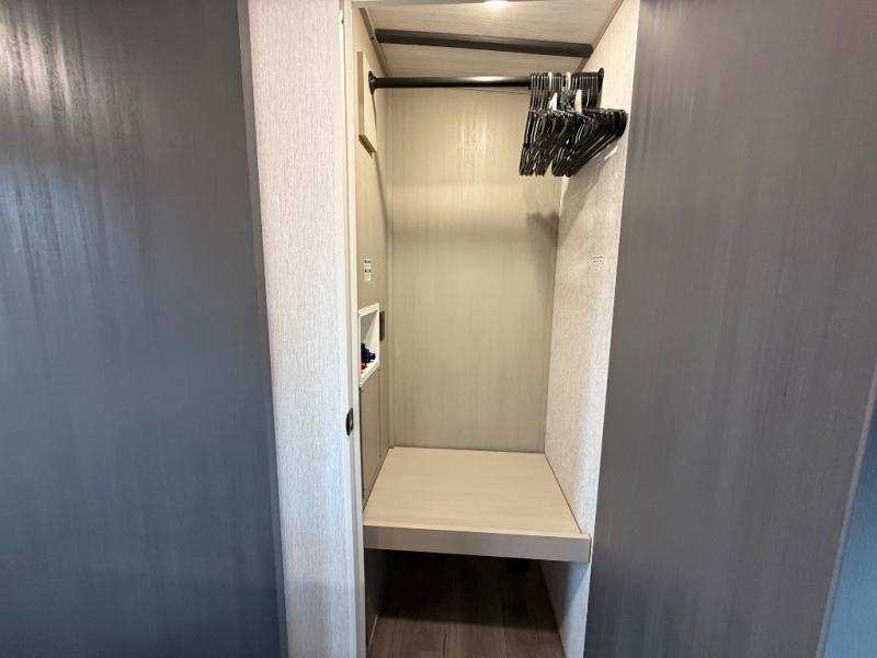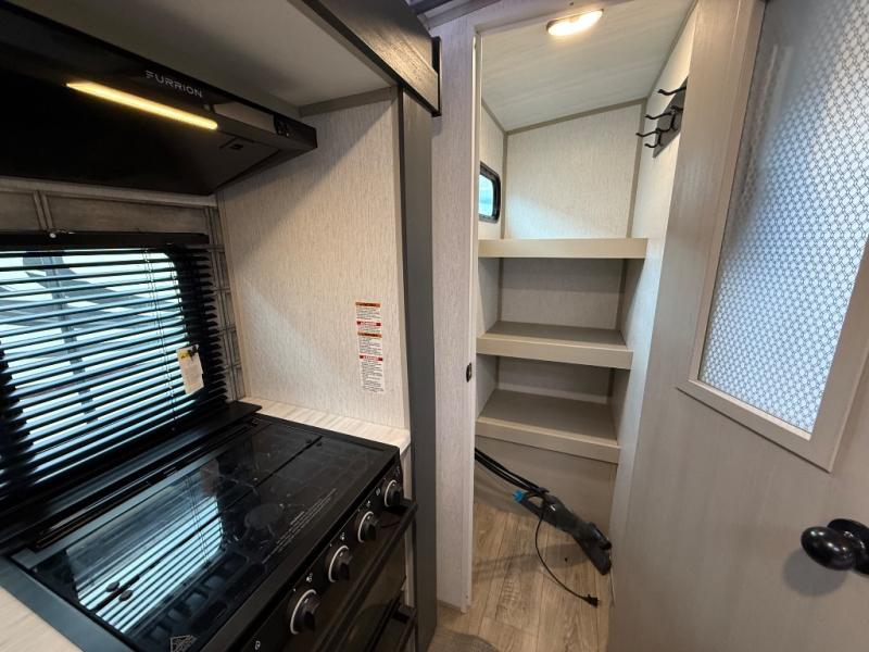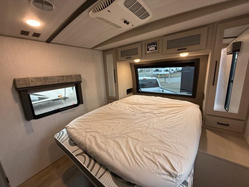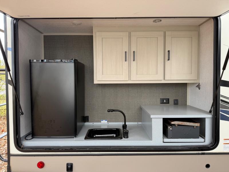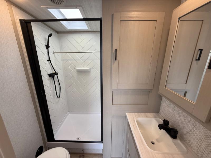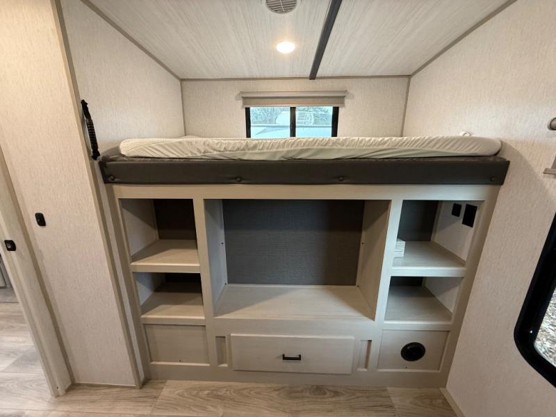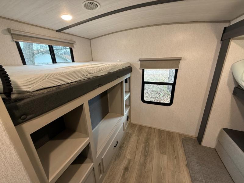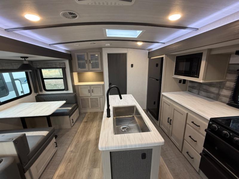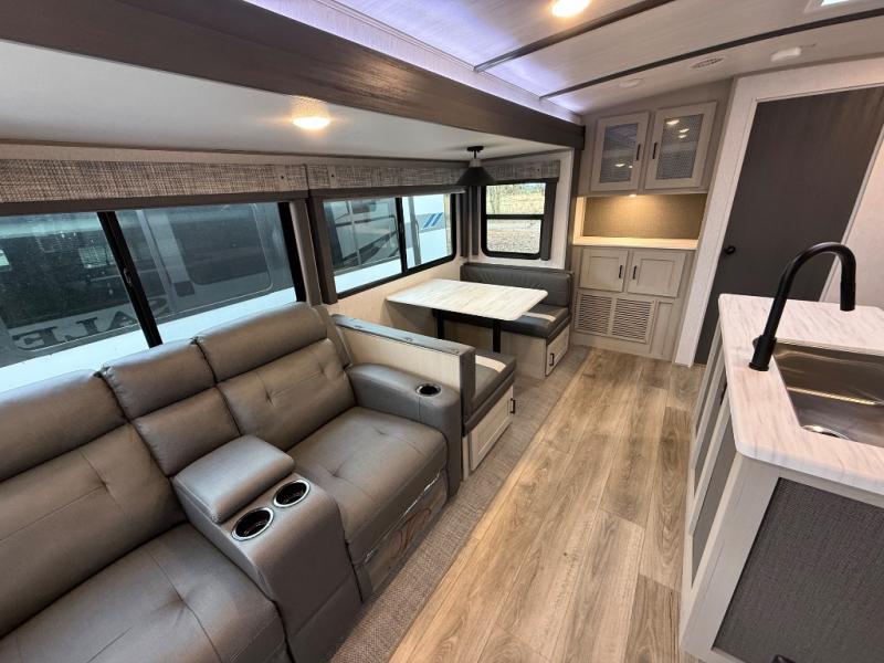 Your kids or friends are going to love camping in this travel trailer! It features a rear private bunkhouse with a bunk above a Versa queen convertible bed/sofa plus an additional bunk above an entertainment center with storage below. Just outside the bunkhouse is the kitchen with a 10 cu. ft. 12V black refrigerator, a microwave, a kitchen island, and a chef-sized walk-in pantry big enough to store everyone's favorite snacks. The booth dinette and the theatre seating are right next to panoramic windows so you can enjoy looking out at your beautiful scenery. You will also love taking a hot, steamy shower in the 30" x 36" shower with skylights and get a good night's rest on the queen bed in the front private bedroom!