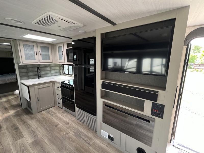 When you have this Salem Hemisphere Hyper-Lyte travel trailer, you will have everything you need for adventurous and accommodating getaways! Spend some time on the tri-fold sofa or the U-shaped dinette in front of the 40" LED TV and fireplace. If you need a little snack while you watch a movie, you can heat it up in the microwave or prepare it on the three-burner range. Grab some cold drinks from the 12V 10 cu. ft. refrigerator, and pull out the countertop extension if you need a little extra space to get your snacks ready. The rear bunkhouse is super sweet with its flip-up bunks and Versa convertible RV queen bed, and the front private bedroom will also be comfortable for you to spend your nights relaxing in.