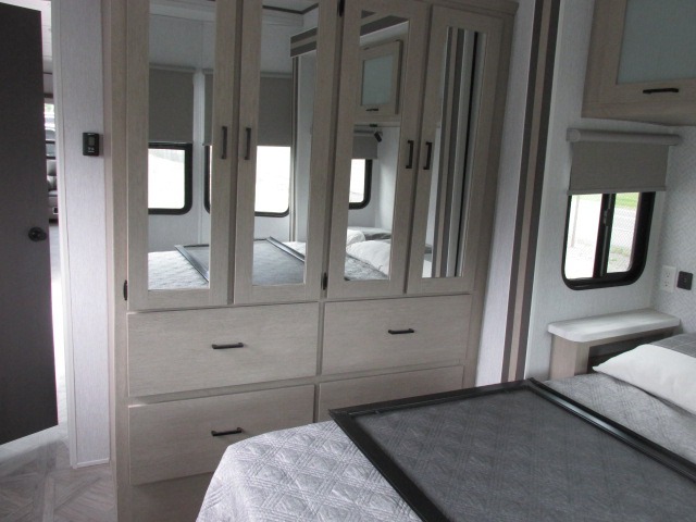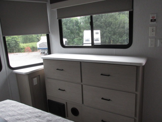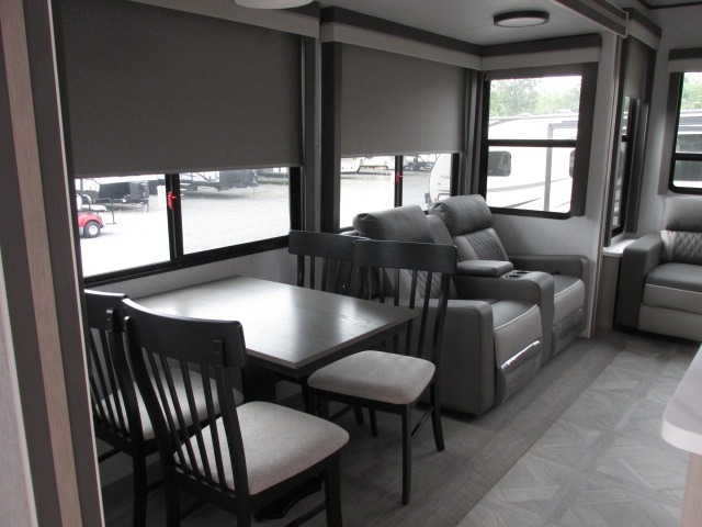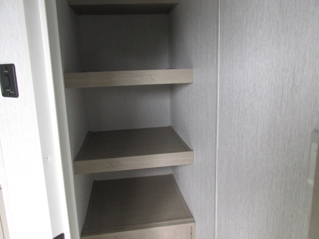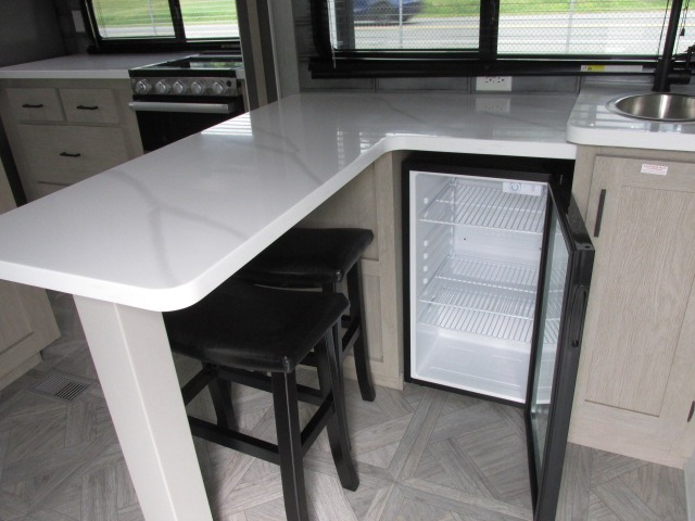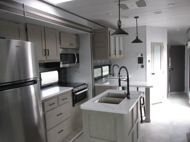 Head to your favorite place for a long weekend, or for the summer with this Salem Villa destination trailer. You are going to love the L-shaped bar area with two bar height chairs plus a sink and mini refrigerator for beverages. This will certainly be the hangout spot when entertaining. The rest of the kitchen area is wide open with dual opposing slides featuring stainless steel appliances, a kitchen island with double sink, and a dining table with four chairs. The living area, which is combined here, features a sofa and theater seating for movie night or just relaxing. Enjoy the added ambiance from the fireplace with mirrored front. Head to your right as you enter the main patio door and find a full bath with walk-in shower, toilet, plus a vanity with sink and medicine cabinet overhead. There is also a walk-in pantry for all of your storage needs. Continue on to the front master bedroom where you will enjoy a great night's rest on a custom king bed. There is also a nice closet that has been prepped for a washer and dryer if you choose to add that option.