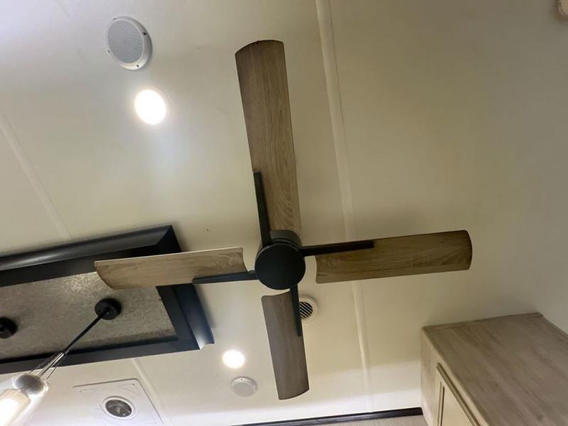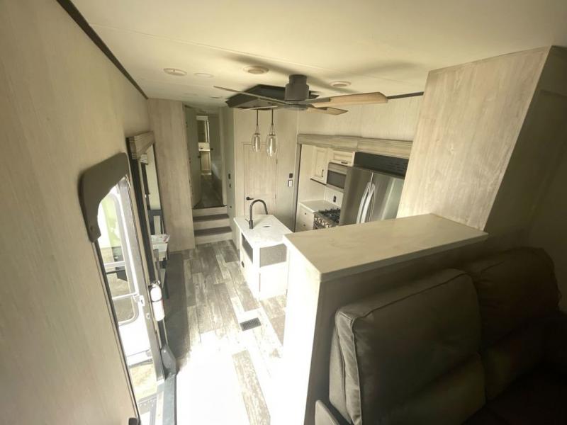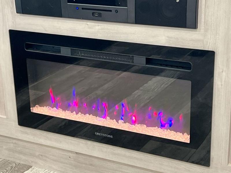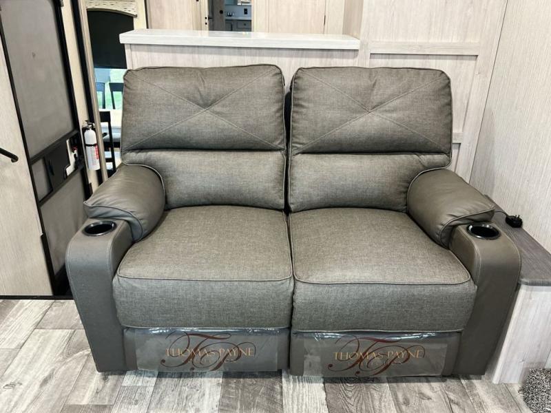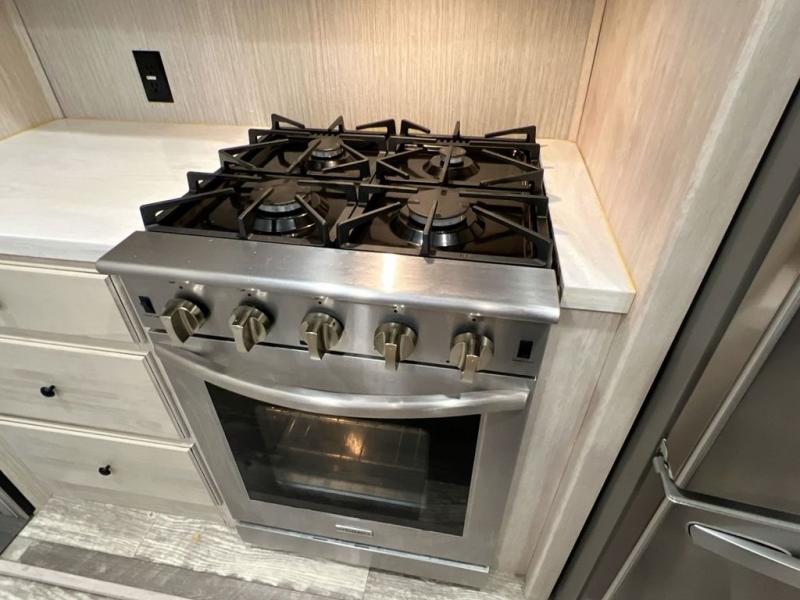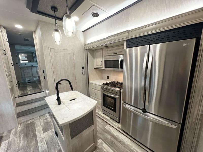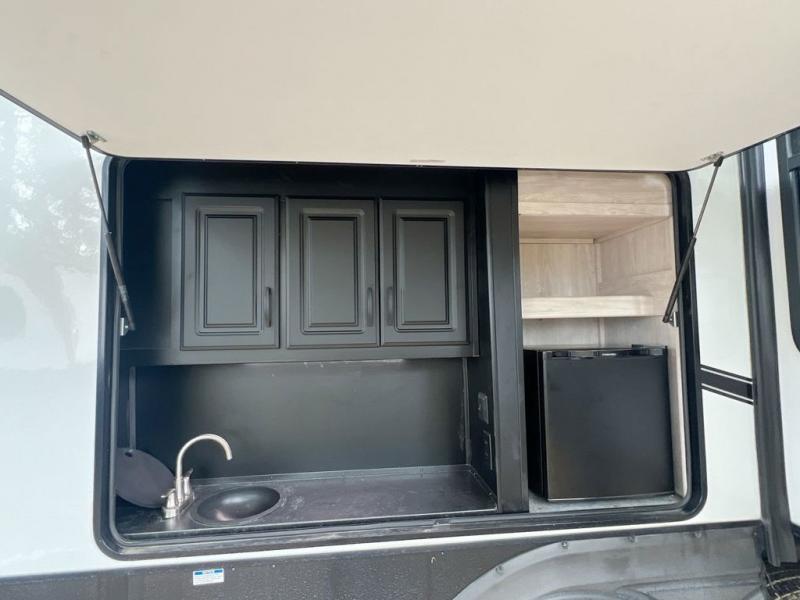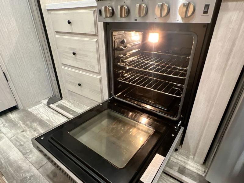 No vacation plan is complete without this Sandpiper Luxury fifth wheel! The master suite is the star of the show with its king bed slide and full bathroom with dual-sink vanity. There is another aspect of this unit that will also grab your attention, and that is the front separate living room. This room features a front entertainment center with fireplace and 50" flat screen LED HDTV, two opposing tri-fold hide-a-bed sofas, and theater seating. All of this makes the living room a perfect place to sit down with friends, and the sofas allow you to offer your friends a sleeping space if they choose to spend the night. The kitchen is centrally located, and it contains the half bathroom. As you work up a sweat cooking dinner on the four-burner range, you'll be able to switch on the ceiling fan to cool down, and you'll be able to store practically anything in the 22-cubic foot residential refrigerator.