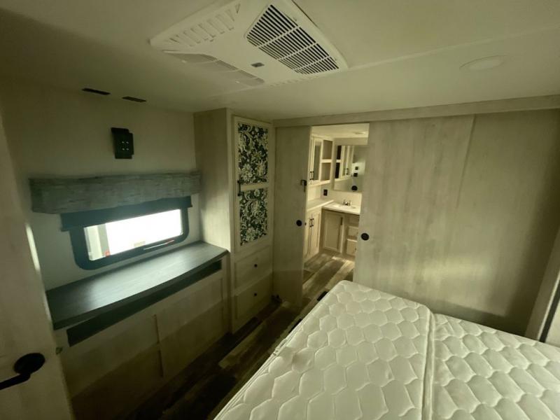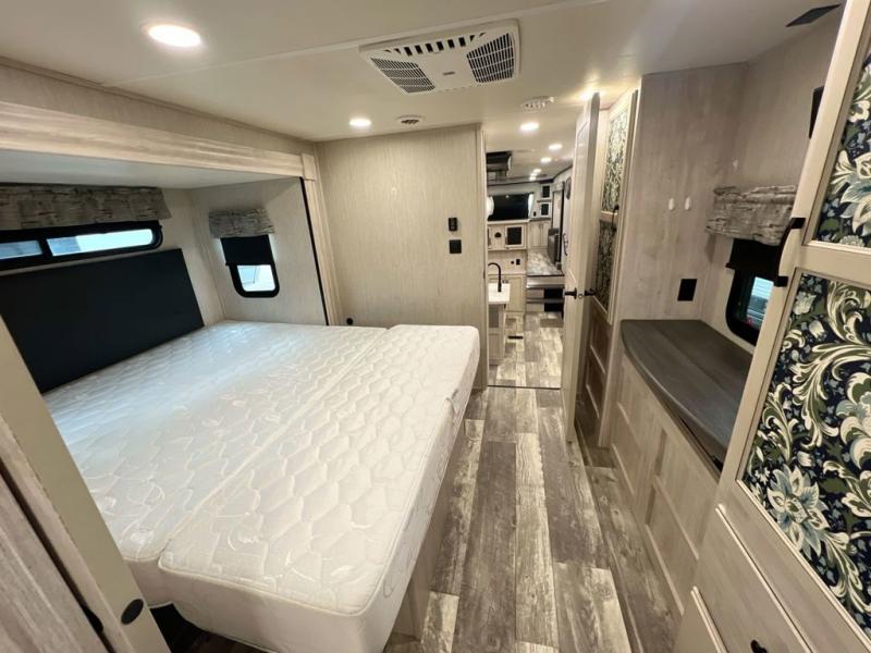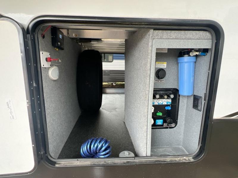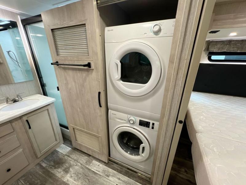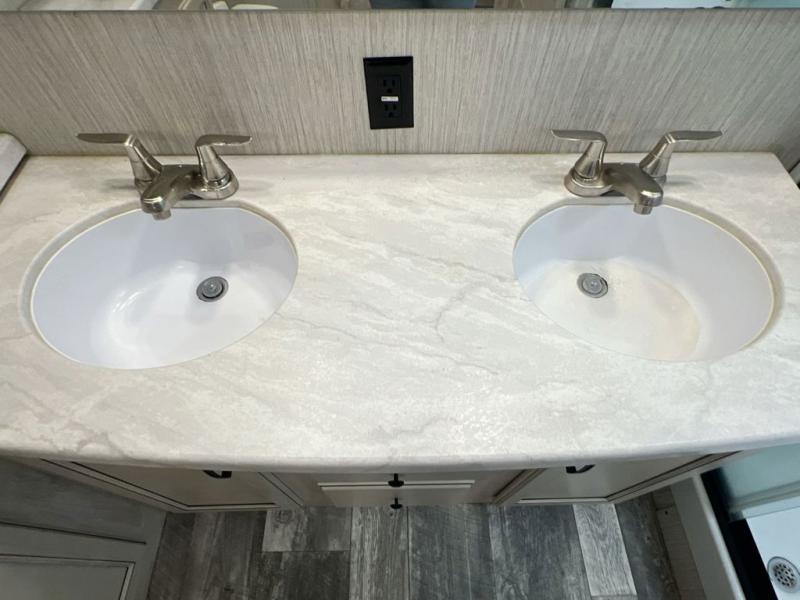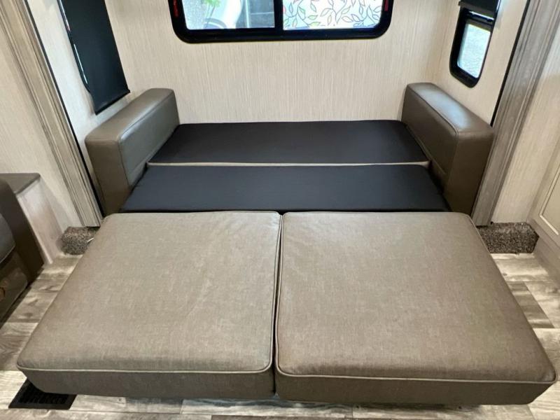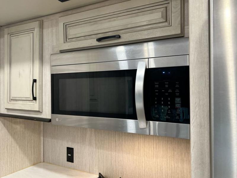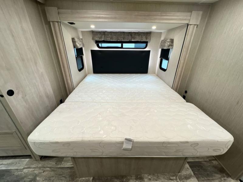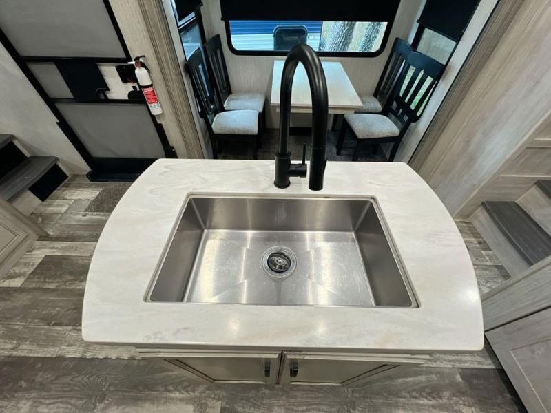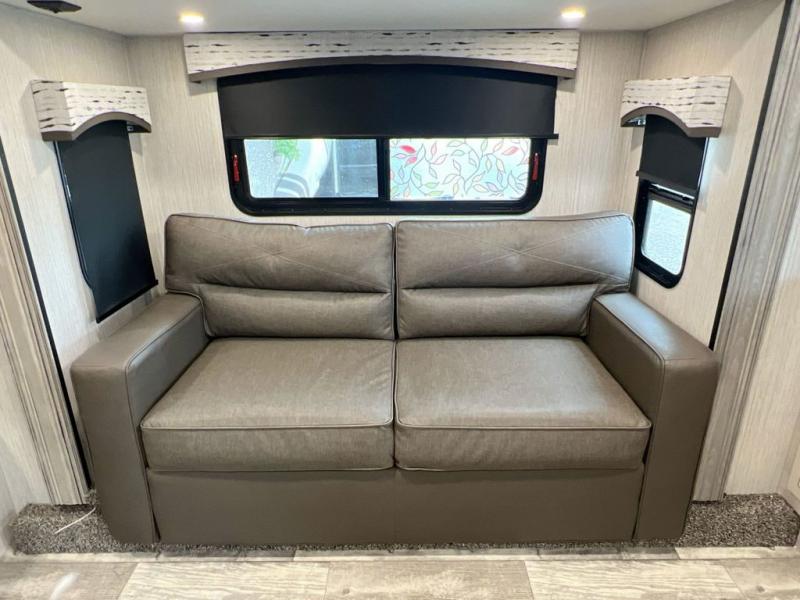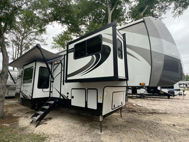 When a brand claims to be luxurious, you expect true luxury, and the Forest River Sandpiper Luxury fifth wheel delivers! The list of included features is outstanding, and the construction itself is top notch. Everything comes together on a welded aluminum-framed, vacuum-bonded laminated superstructure and a cambered powder-coated frame with rust prohibitor. There is a fully enclosed, heated underbelly and an unobstructed drop-frame pass-through storage area with cable jacks and 110V outlet. Two LED-lit exterior speakers add some fun to the outside, and the docking station includes easy winterization, hot and cold spray port, black tank flush, and pull valves for tanks. But the true luxury is found inside with the 84" interior height, residential countertops, recessed residential lighting, extra-large picture windows, LED-lit headboard, and premium sound bar with built-in flush-mount DVD player. Each unit has also been prepped for a washer/dryer so that you can extend every trip and make your Sandpiper Luxury feel more like home.
