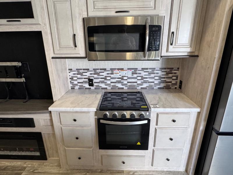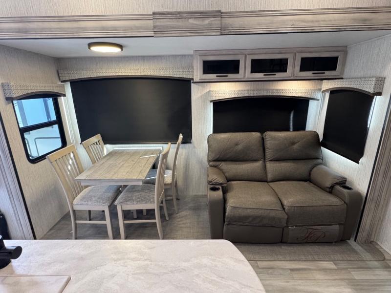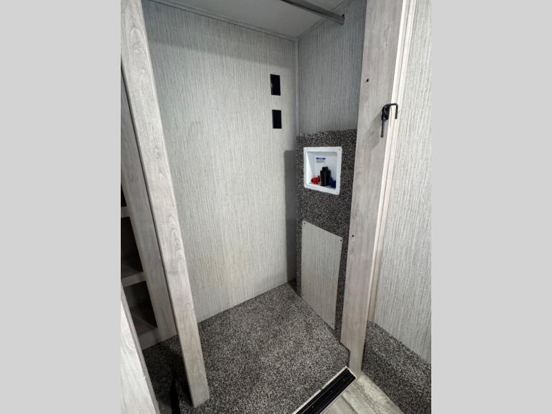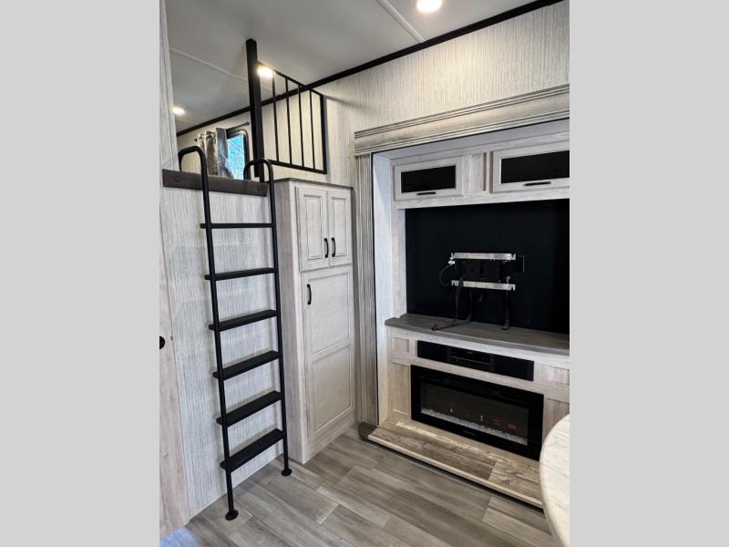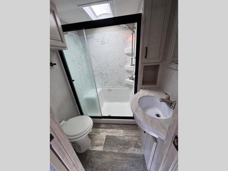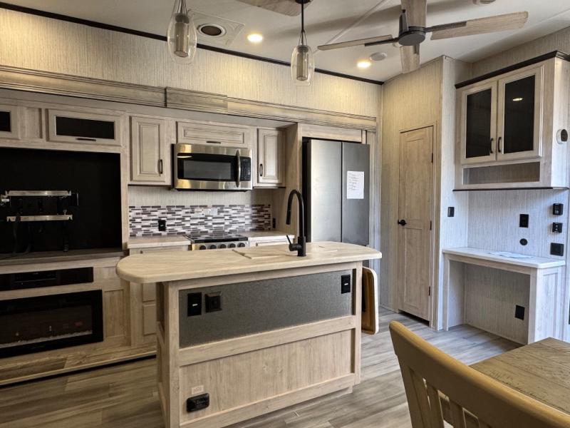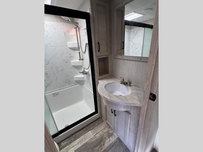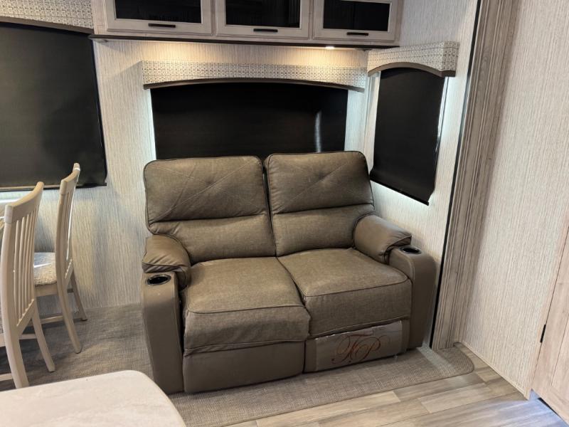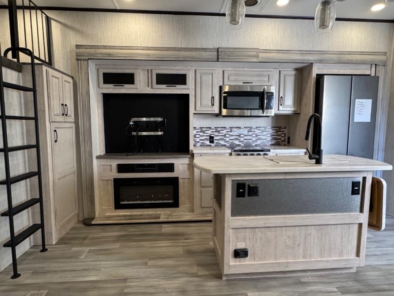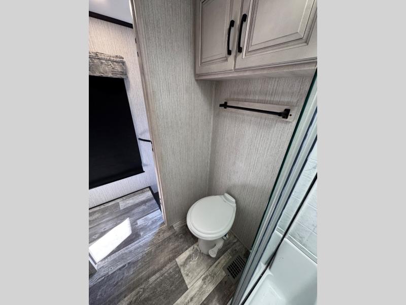 Weekend camping trips and full-time RV living is made complete in this quad slide out fifth wheel. Your crew can relax under the 15' electric awning, or head inside to enjoy the fireplace. There is also a 50" flat screen TV across from the theater seating, plus a free-standing dinette to dine at. There are two full baths with the front bath including a walk-in shower with a seat for your comfort, and the front private bedroom will feel just like home with its queen bed and large front wardrobe. There is even washer and dryer prep to make laundry day easier than ever. The rear full bath has another convenience with it's exterior entry door. This bath features a tub/shower, toilet and vanity with sink and overhead storage.
