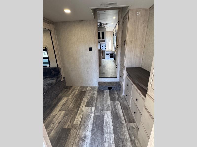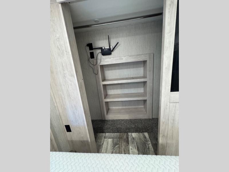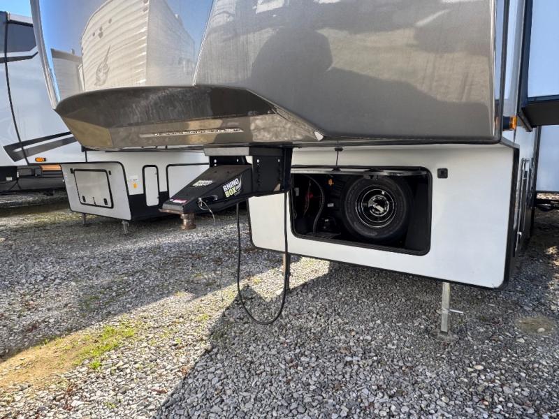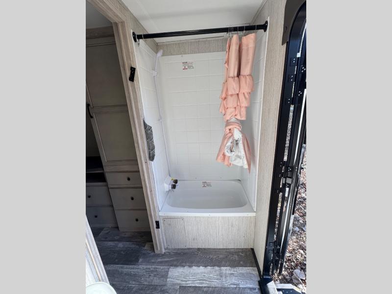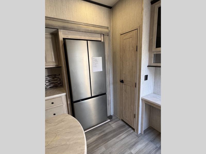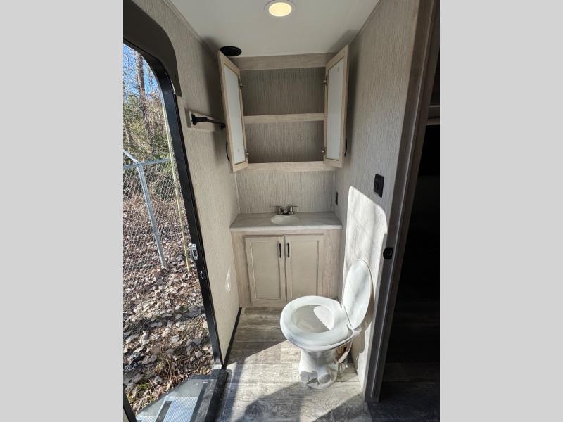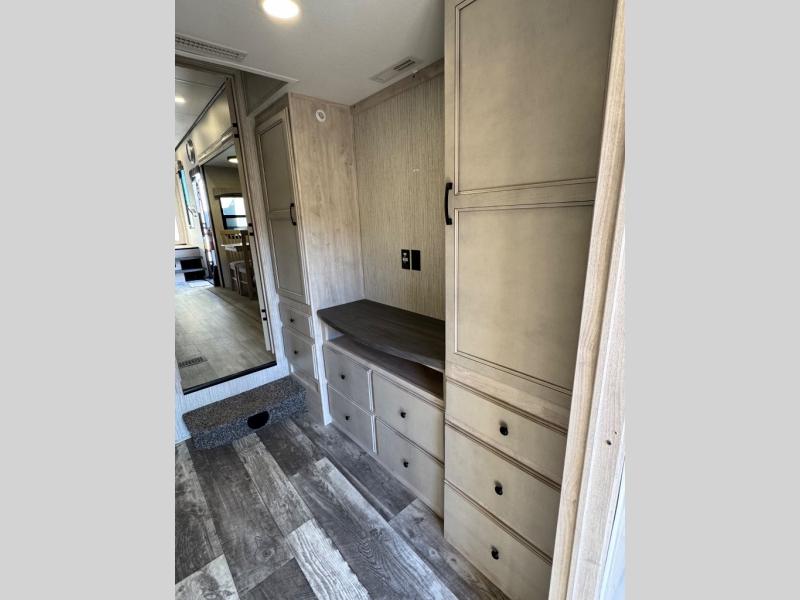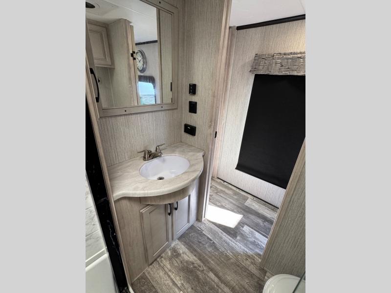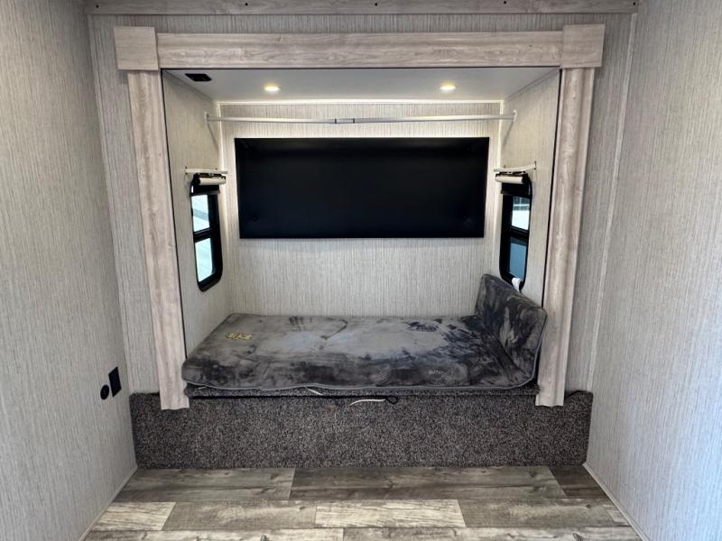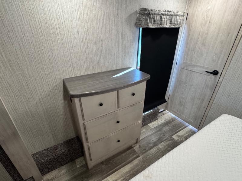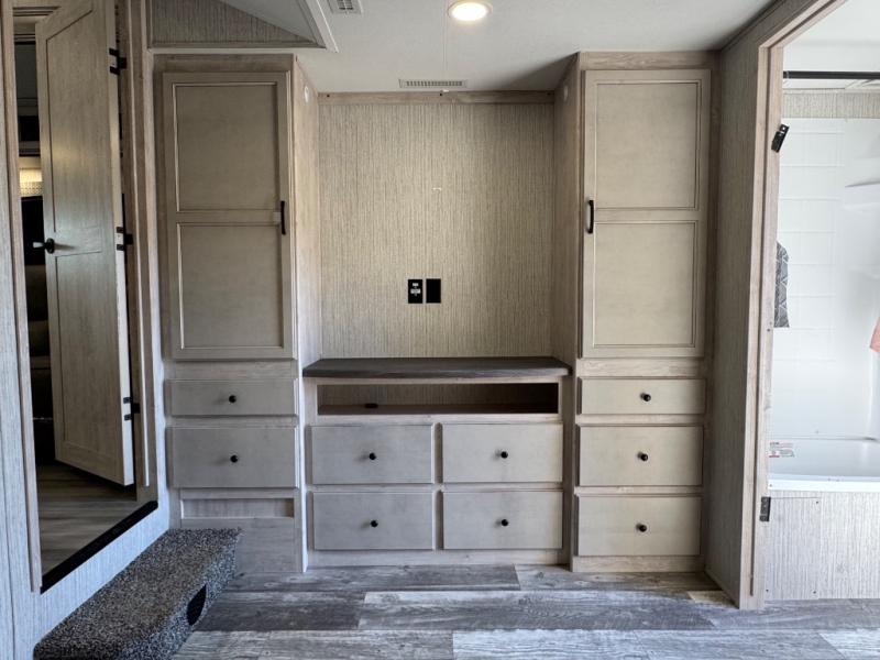 Weekend camping trips and full-time RV living is made complete in this quad slide out fifth wheel. Your crew can relax under the 15' electric awning, or head inside to enjoy the fireplace. There is also a 50" flat screen TV across from the theater seating, plus a free-standing dinette to dine at. There are two full baths with the front bath including a walk-in shower with a seat for your comfort, and the front private bedroom will feel just like home with its queen bed and large front wardrobe. There is even washer and dryer prep to make laundry day easier than ever. The rear full bath has another convenience with it's exterior entry door. This bath features a tub/shower, toilet and vanity with sink and overhead storage.