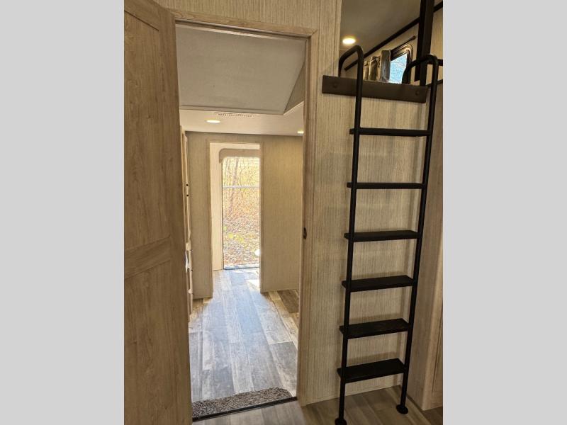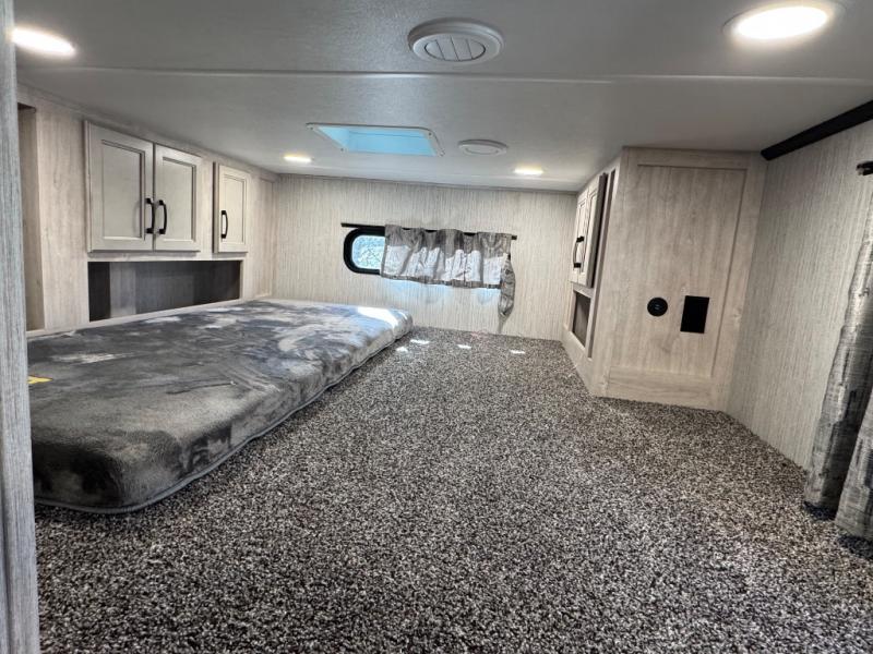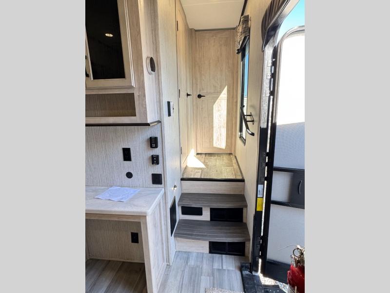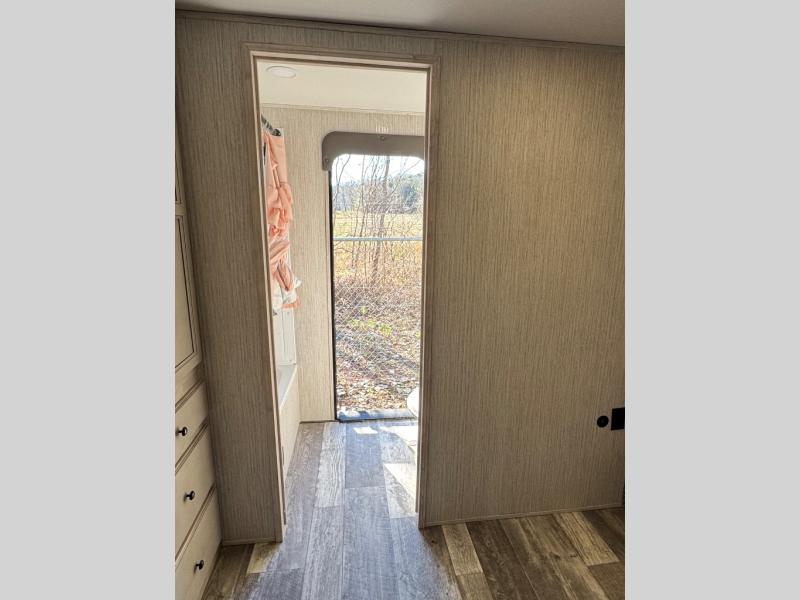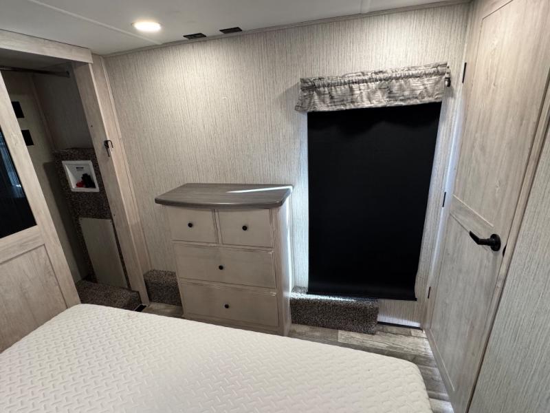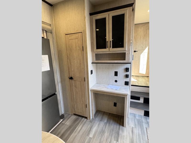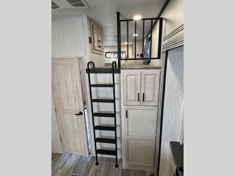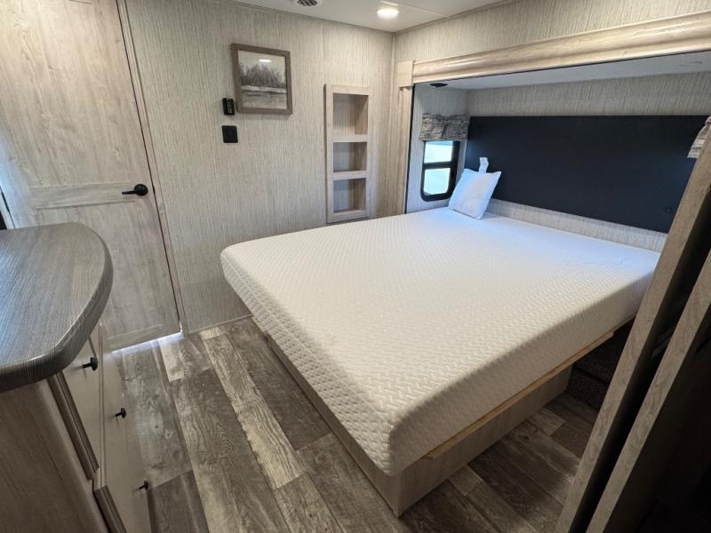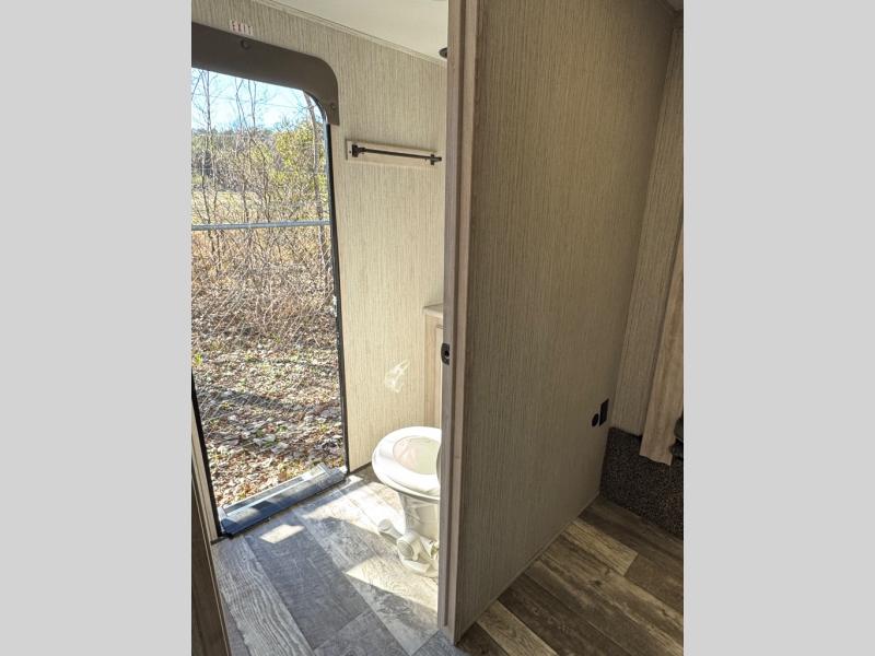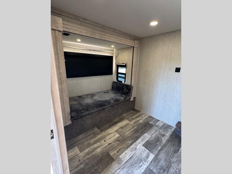 Weekend camping trips and full-time RV living is made complete in this quad slide out fifth wheel. Your crew can relax under the 15' electric awning, or head inside to enjoy the fireplace. There is also a 50" flat screen TV across from the theater seating, plus a free-standing dinette to dine at. There are two full baths with the front bath including a walk-in shower with a seat for your comfort, and the front private bedroom will feel just like home with its queen bed and large front wardrobe. There is even washer and dryer prep to make laundry day easier than ever. The rear full bath has another convenience with it's exterior entry door. This bath features a tub/shower, toilet and vanity with sink and overhead storage.