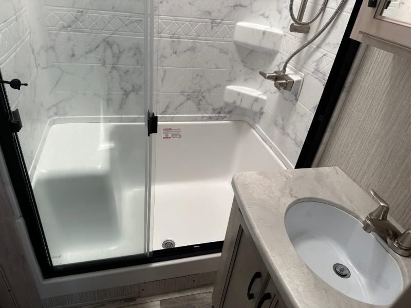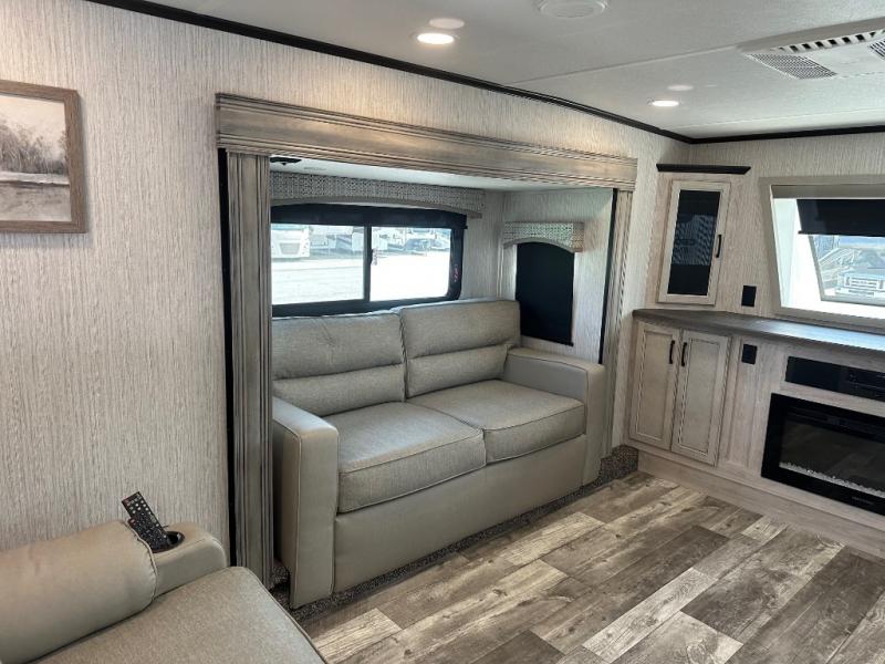 When a brand claims to be luxurious, you expect true luxury, and the Forest River Sandpiper Luxury fifth wheel delivers! The list of included features is outstanding, and the construction itself is top notch. Everything comes together on a welded aluminum-framed, vacuum-bonded laminated superstructure and a cambered powder-coated frame with rust prohibitor. There is a fully enclosed, heated underbelly and an unobstructed drop-frame pass-through storage area with cable jacks and 110V outlet. Two LED-lit exterior speakers add some fun to the outside, and the docking station includes easy winterization, hot and cold spray port, black tank flush, and pull valves for tanks. But the true luxury is found inside with the 84" interior height, residential countertops, recessed residential lighting, extra-large picture windows, LED-lit headboard, and premium sound bar with built-in flush-mount DVD player. Each unit has also been prepped for a washer/dryer so that you can extend every trip and make your Sandpiper Luxury feel more like home.
