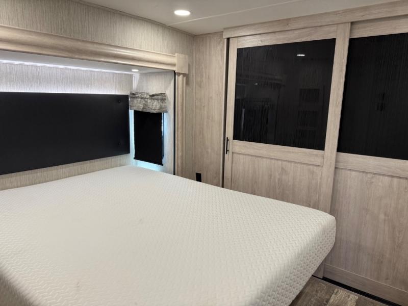 When a brand claims to be luxurious, you expect true luxury, and the Forest River Sandpiper Luxury fifth wheel delivers! The list of included features is outstanding, and the construction itself is top notch. Everything comes together on a welded aluminum-framed, vacuum-bonded laminated superstructure and a cambered powder-coated frame with rust prohibitor. There is a fully enclosed, heated underbelly and an unobstructed drop-frame pass-through storage area with cable jacks and 110V outlet. Two LED-lit exterior speakers add some fun to the outside, and the docking station includes easy winterization, hot and cold spray port, black tank flush, and pull valves for tanks. But the true luxury is found inside with the 84" interior height, residential countertops, recessed residential lighting, extra-large picture windows, LED-lit headboard, and premium sound bar with built-in flush-mount DVD player. Each unit has also been prepped for a washer/dryer so that you can extend every trip and make your Sandpiper Luxury feel more like home.