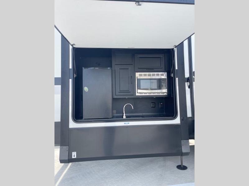 You'll want to book another weekend at the campsite after staying one time in this Sierra Luxury fifth wheel! There is lots of comfort and convenience with all of the amenities and features found on this unit. The front kitchen is a dream for any chef with its opposing slides, kitchen island, four-burner range, 22-cubic foot refrigerator, buffet cabinet, and dinette overlooking the living room. The living room has a ceiling fan to circulate some air, and the theater seating sits directly across from the 50" flat screen LED HDTV and fireplace for easy viewing. Not only is there an entertainment center in the living room, but there is also a bedroom entertainment center with fireplace too. You'll be able to use two entry doors to get in and out of this unit, and the rear private bedroom has a king bed slide for great comfort.