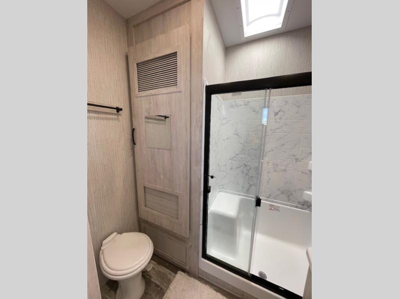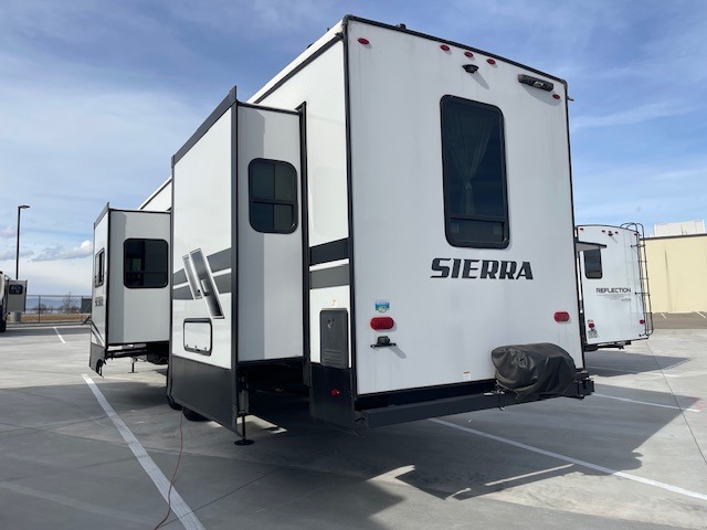 Are you looking to add a little glamour to your camping life? The Forest River Sierra Luxury fifth wheels are luxury units that bring all the fun. These models have an Underbelly Armor, a friction-hinge entry door, an exterior docking station, a high-gloss gel-coat fiberglass exterior, a six-point hydraulic leveling system, and high-efficiency radiant foil for the roof and floor. The interior is stylish and modern with its stainless steel appliances, decorative backsplash, rustic wood plank linoleum, handmade cabinetry, crown molding over the kitchen cabinets, and recessed residential lighting. There is a satellite and cable hookup as well as a King Wi-Fi extender system, and the premium sound bar with built-in flush-mounted DVD player will be great to have when you want to watch a movie.