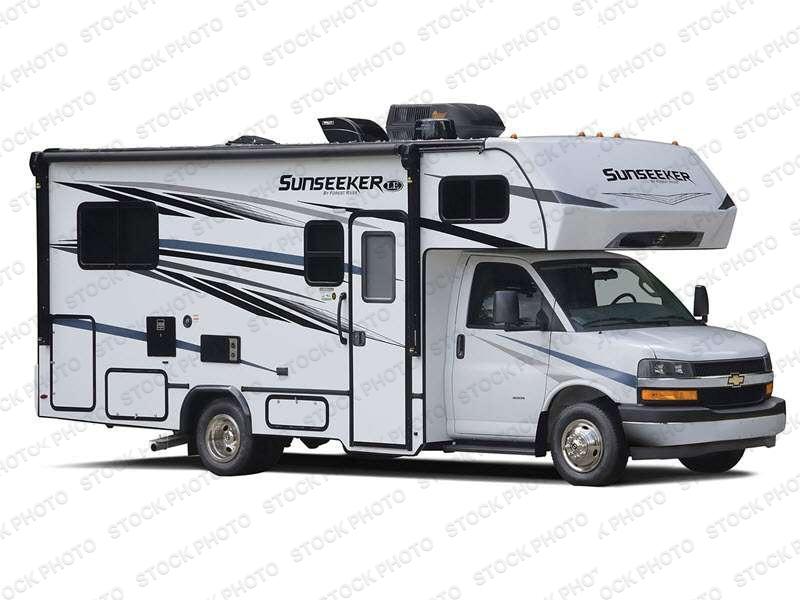 This Sunseeker LE Class C gas motorhome offers you quite a bit of sleeping space with its RV queen bed, kid's sofa sleeper, flip-down bunk, booth dinette, sofa, and 60" x 80" bunk over the cab. There are also two slides on this coach so that you can have more space for all of those travelers, and the great kitchen amenities, like the recessed three-burner range and convection microwave, will make it easy to feed all of those people. You will also have a full bathroom for everyone to use when they need to clean up, and the shower skylight will add some brightness to the bathroom. Head outside for an evening together underneath the 11' electric awning with LED lights.