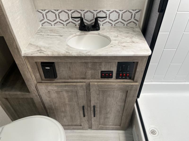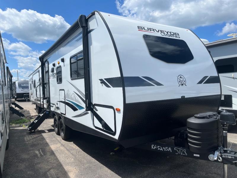 With any Surveyor Legend travel trailer by Forest River you will enjoy quality craftsmanship, convenient amenities, and at-home comforts. The Azdel composite panels provide a longer-lasting trailer, and the power tongue jack will get you back on the road in no-time. Each model includes the Surveyor Legend Package that comes standard with pleated night shades, an automotive style tinted front windshield, a multi-zone Bluetooth stereo, and more. You'll enjoy the one-touch electric awning with LED lights outdoors, plus rooftop solar prep and rear camera prep to make parking easier than ever. The inside will have you feeling right at home with Surf(x) seamless countertops, Congoleum designer carefree linoleum, residential faucets in the bath and kitchen, plus many more essentials you won't want to camp without.