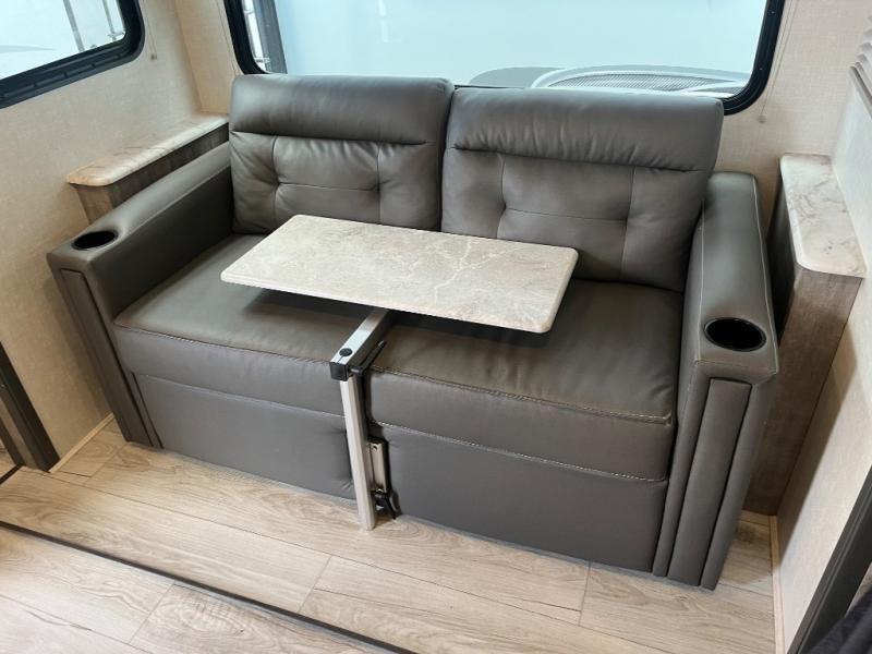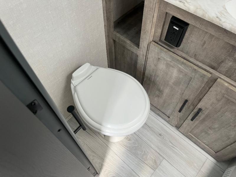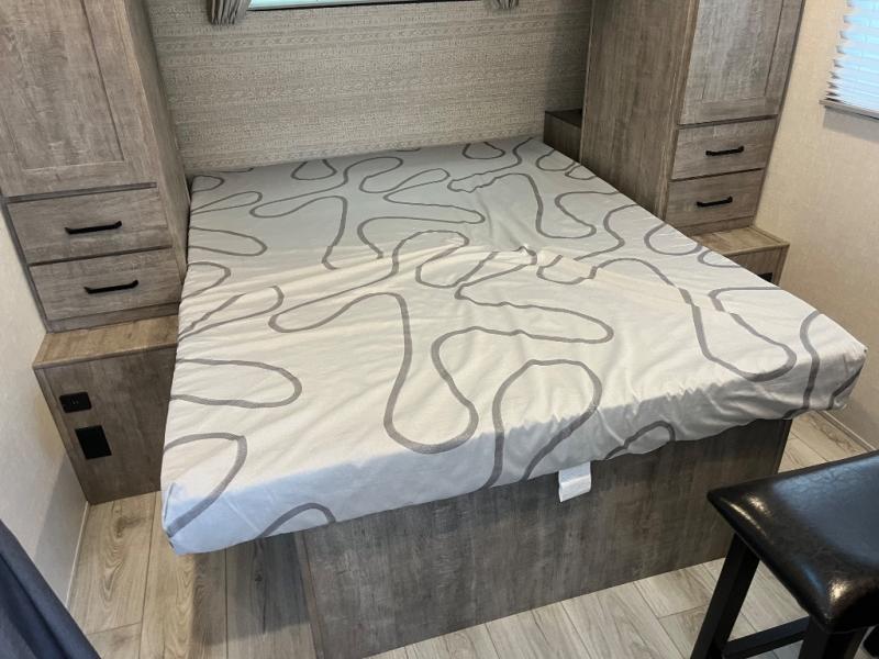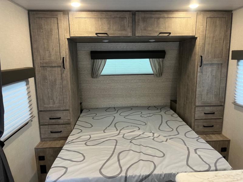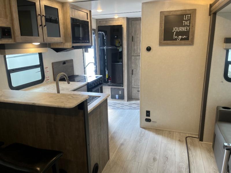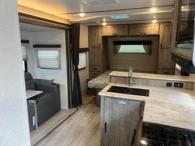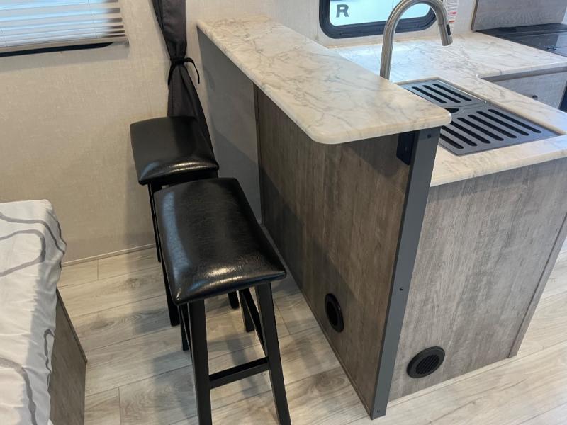 You're going to love every minute spent in this 25' travel trailer! The counter with stools will be the perfect place to enjoy your morning coffee at, plus there is a dinette slide for more seating space. You will get a great night's rest on the queen bed in the front bedroom, and the two wardrobes allow you to keep your clothes tidy. Further customize this trailer by adding the theater seating option or tri-fold sofa option in place of the dinette, and you'll enjoy the standard HD LED TV for late-night movies!