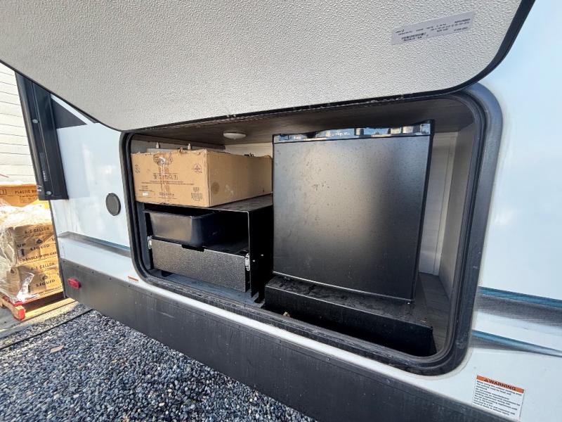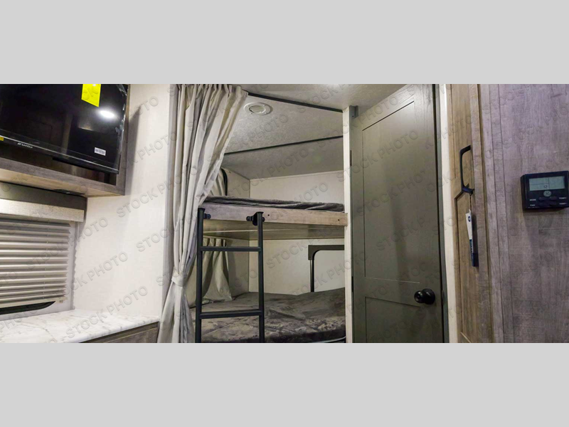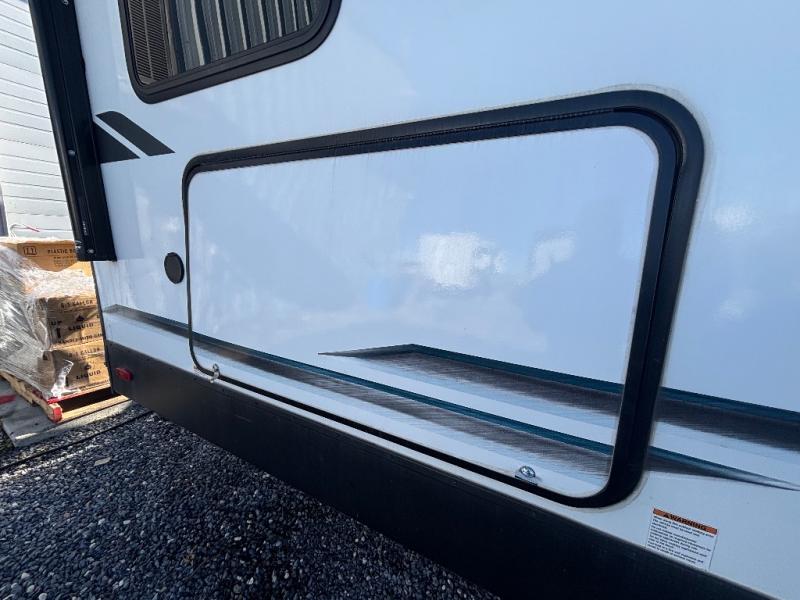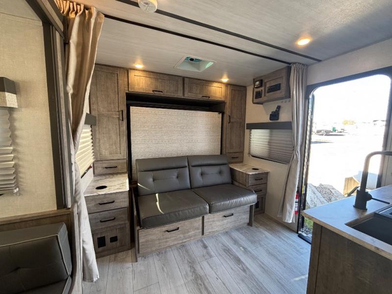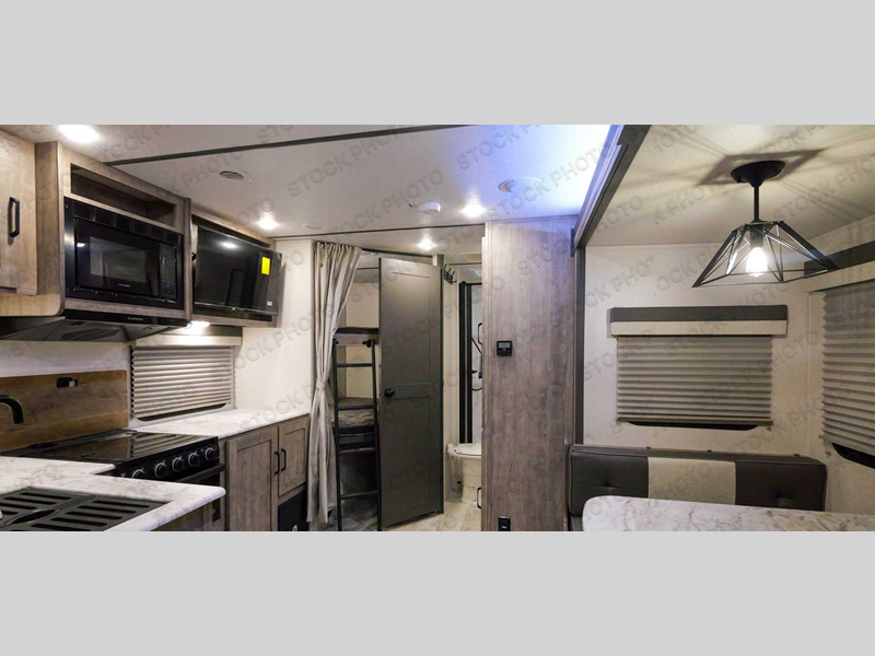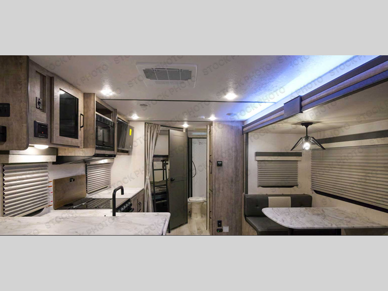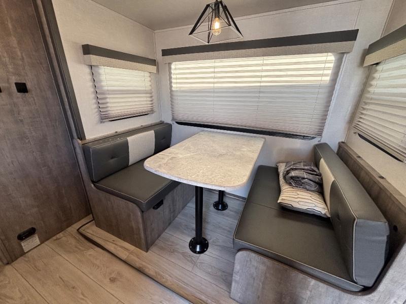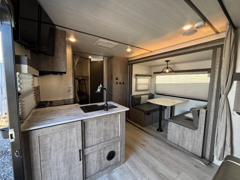 Every trip to the campground will be spent in comfort with this single slide out travel trailer. Once you arrive at the site, remove the kayaks or bikes from the rear storage door, start lunch on the outside kitchen, and put out the 15' power awning with LED lights. The interior includes a booth dinette slide with EZ access storage, a bar top with stools, plus an HD LED TV for movie nights. After a day of fun, head to the front private bedroom for a great night's rest on the queen bed, and you can store your belongings in the dual bedroom wardrobes!