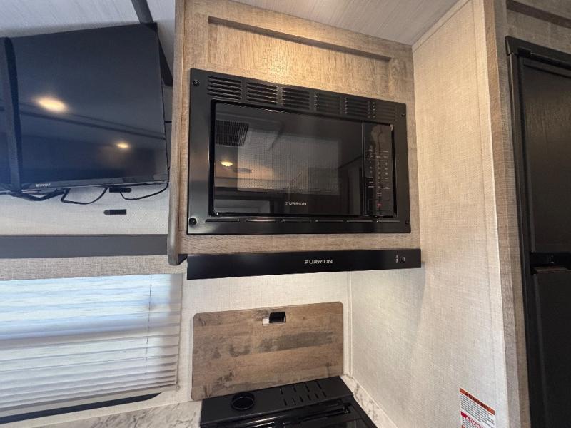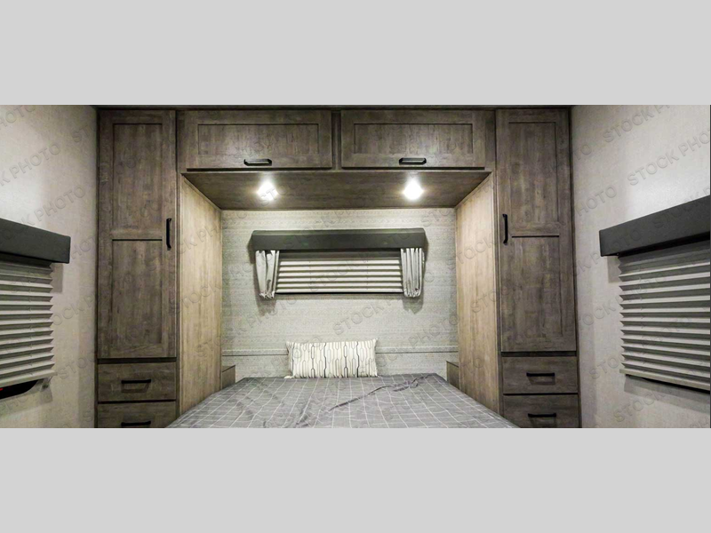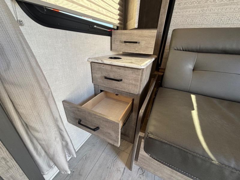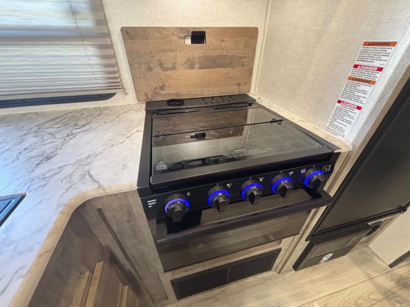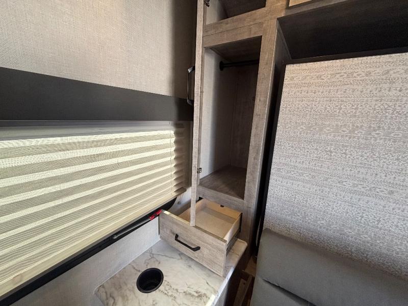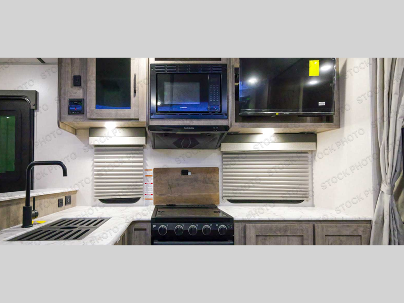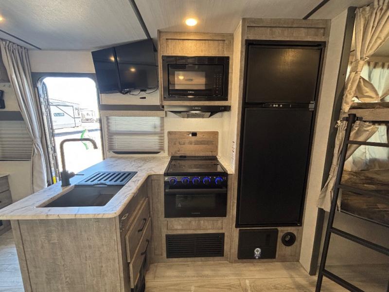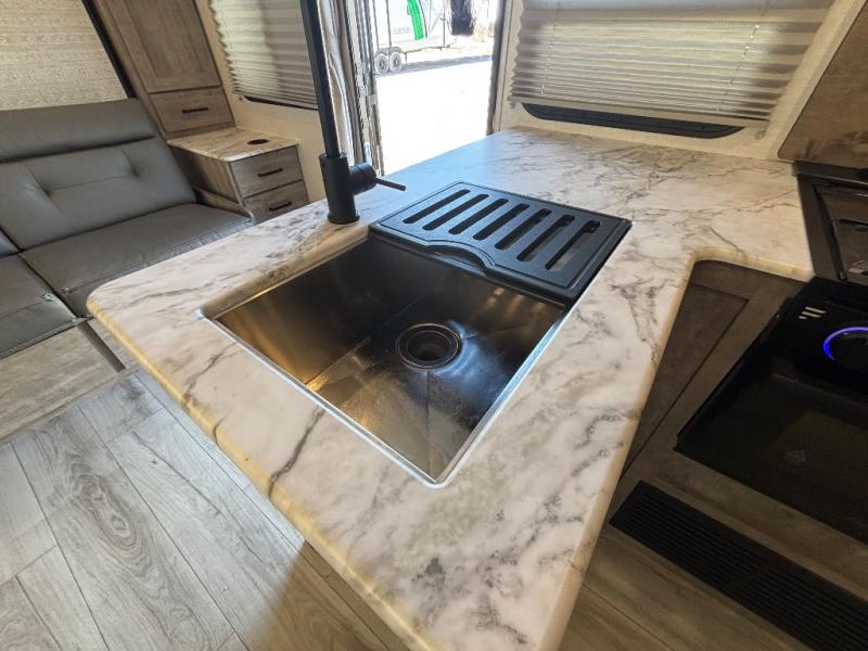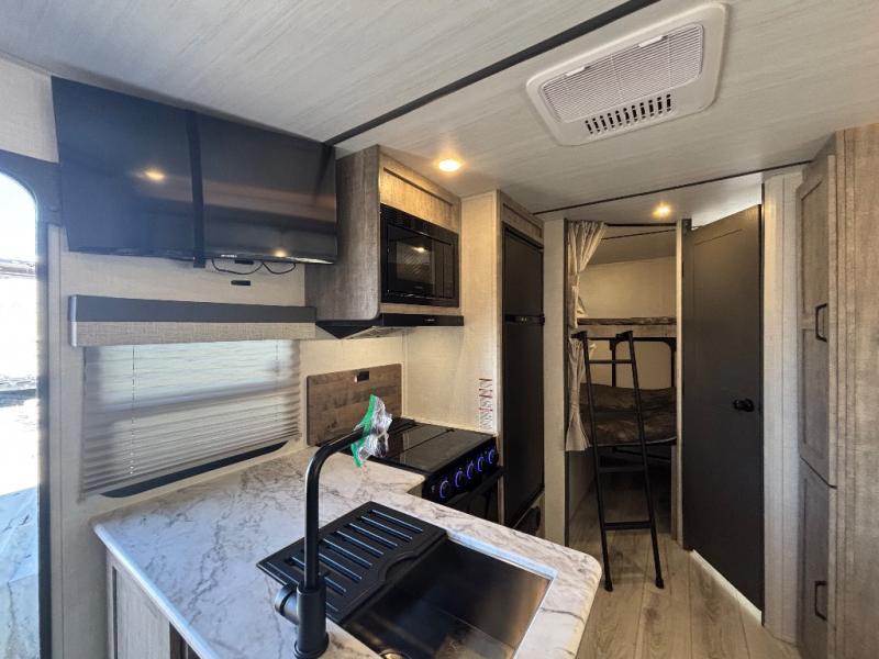 Every trip to the campground will be spent in comfort with this single slide out travel trailer. Once you arrive at the site, remove the kayaks or bikes from the rear storage door, start lunch on the outside kitchen, and put out the 15' power awning with LED lights. The interior includes a booth dinette slide with EZ access storage, a bar top with stools, plus an HD LED TV for movie nights. After a day of fun, head to the front private bedroom for a great night's rest on the queen bed, and you can store your belongings in the dual bedroom wardrobes!