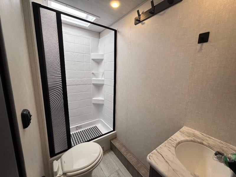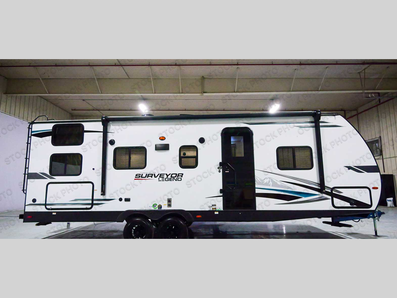 With any Surveyor Legend travel trailer by Forest River you will enjoy quality craftsmanship, convenient amenities, and at-home comforts. The Azdel composite panels provide a longer-lasting trailer, and the power tongue jack will get you back on the road in no-time. Each model includes the Surveyor Legend Package that comes standard with pleated night shades, an automotive style tinted front windshield, a multi-zone Bluetooth stereo, and more. You'll enjoy the one-touch electric awning with LED lights outdoors, plus rooftop solar prep and rear camera prep to make parking easier than ever. The inside will have you feeling right at home with Surf(x) seamless countertops, Congoleum designer carefree linoleum, residential faucets in the bath and kitchen, plus many more essentials you won't want to camp without.