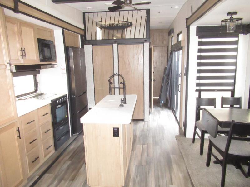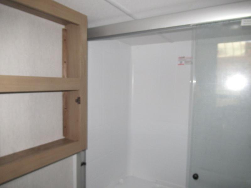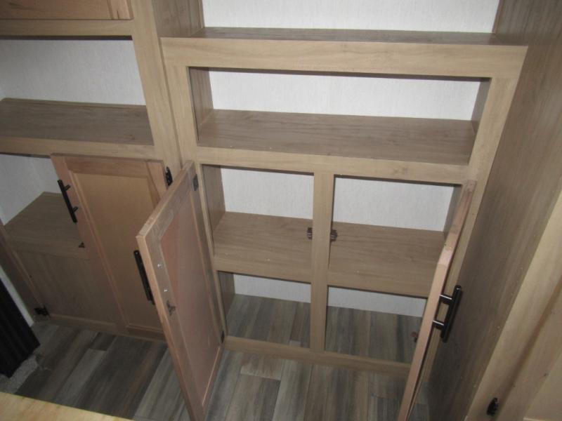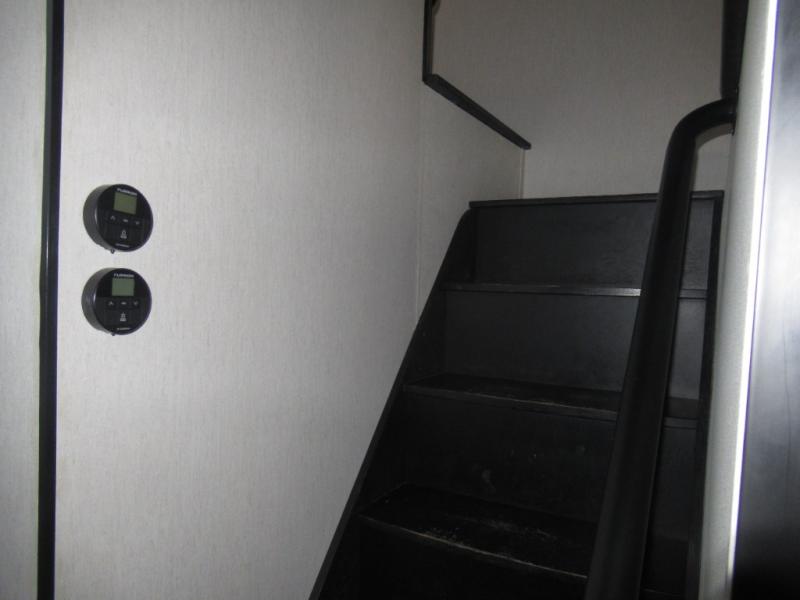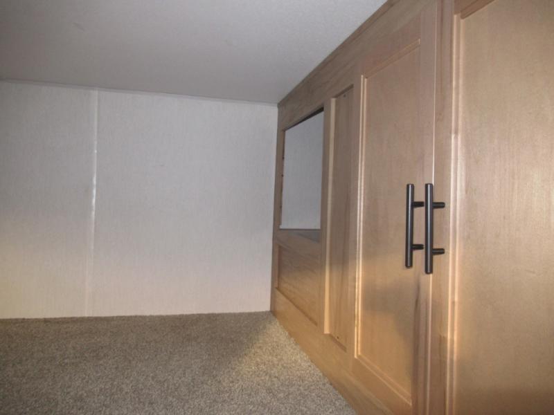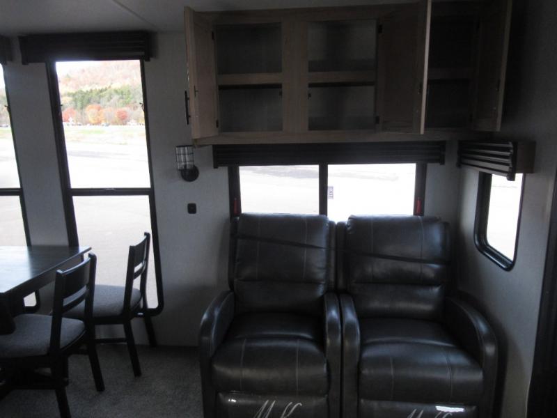 This Timberwolf destination trailer is an excellent and accommodating trailer that will make you feel right at home as soon as you enter through one of the two entry doors. The front private bedroom has a queen bed slide and lots of storage with two wardrobes and a linen closet. There is also an entertainment center where you can add your own TV thanks to the TV mount, and the bedroom even has a second exterior entry door so that you can come and go as you please. Above the bedroom is where the huge loft is located. When you take the stairs up to the loft, you'll find two 36" x 74" bunk mats, a nightstand, a long cabinet, and a large open area with railing. The main living area has a free-standing dinette with chairs, two lounge chairs, and a sofa, so you will have plenty of seating as you watch the main entertainment center.