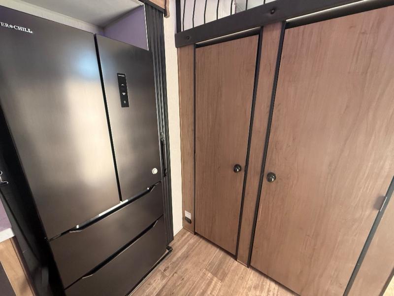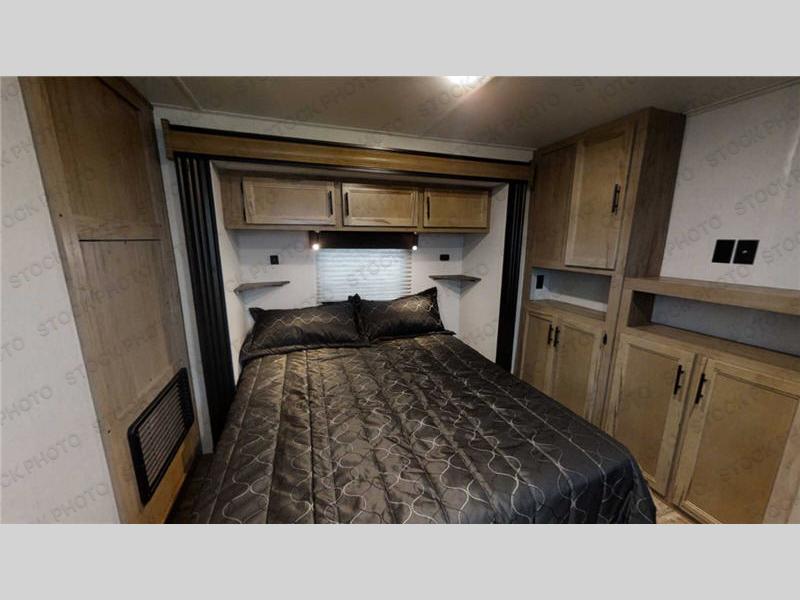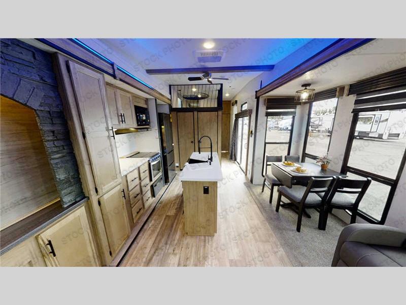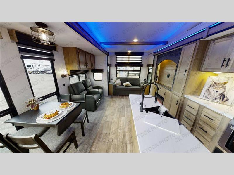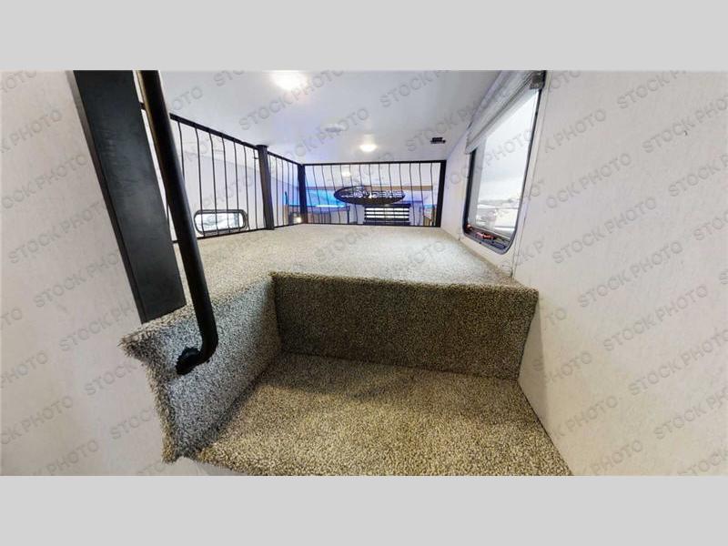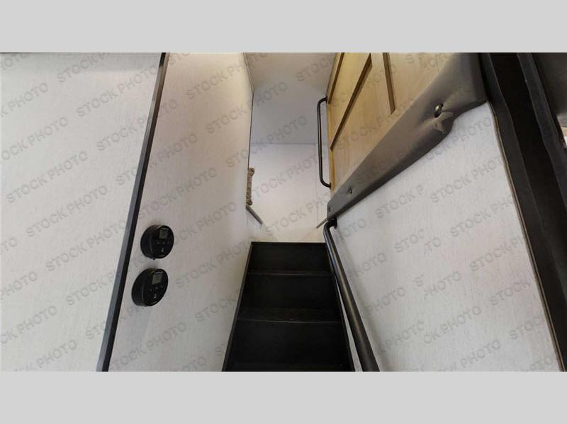 This Timberwolf destination trailer is an excellent and accommodating trailer that will make you feel right at home as soon as you enter through one of the two entry doors. The front private bedroom has a queen bed slide and lots of storage with two wardrobes and a linen closet. There is also an entertainment center where you can add your own TV thanks to the TV mount, and the bedroom even has a second exterior entry door so that you can come and go as you please. Above the bedroom is where the huge loft is located. When you take the stairs up to the loft, you'll find two 36" x 74" bunk mats, a nightstand, a long cabinet, and a large open area with railing. The main living area has a free-standing dinette with chairs, two lounge chairs, and a sofa, so you will have plenty of seating as you watch the main entertainment center.