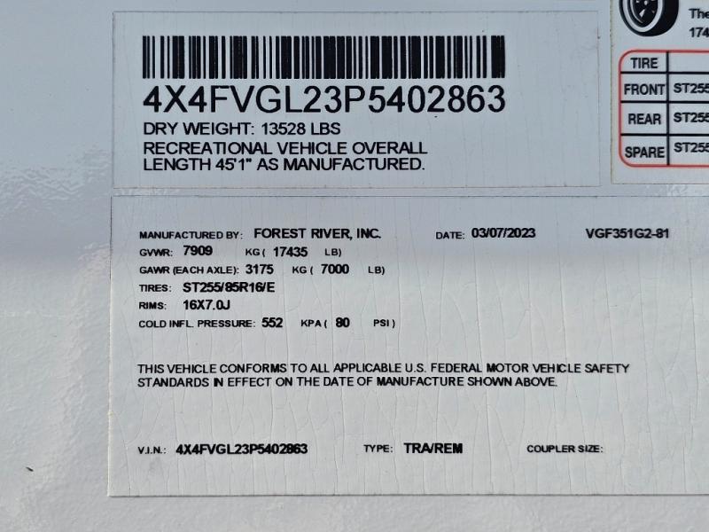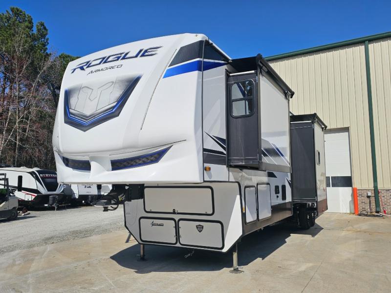 Pre-Owned 2023 Forest River Vengeance Rogue Armored VGF351G2 Fifth Wheel Toy Hauler – Bath & a Half with Loft and Garage Living