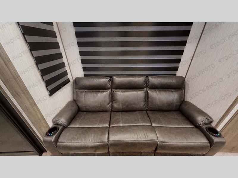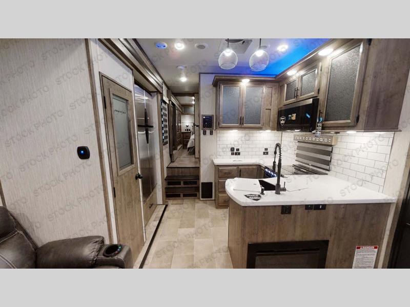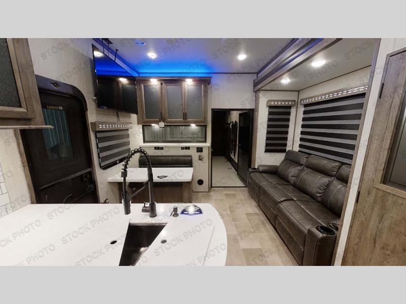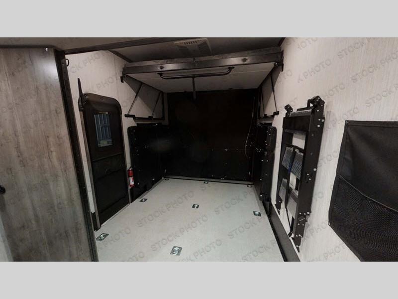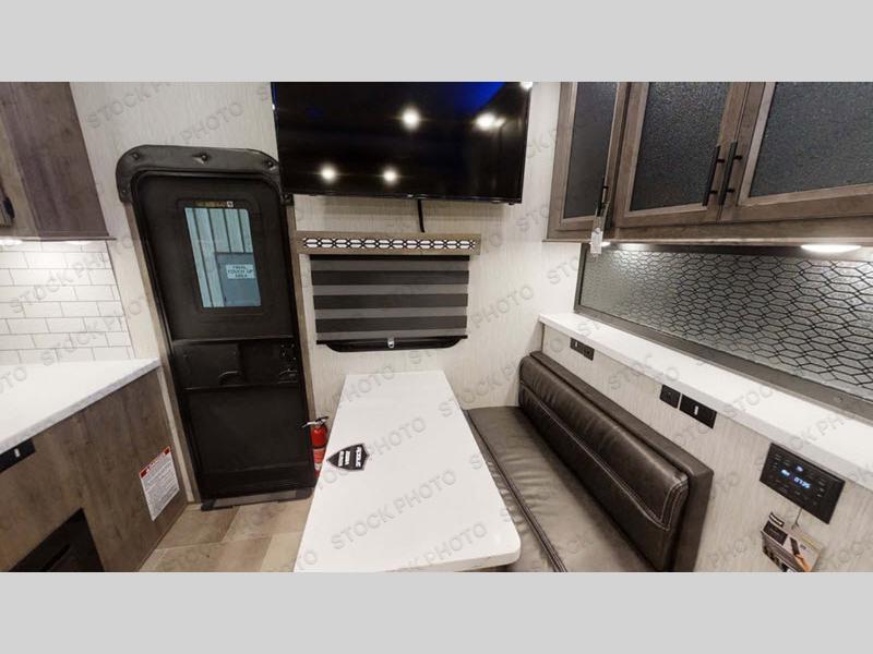 The whole gang can join in on the fun with this fifth wheel toy hauler! Everyone will have a comfortable place to sleep between the king bed in the front private bedroom, the raised queen bed above the flip-up sofas as well as loft space in the garage area, plus you can even use the sofa in the living area if needed. The large kitchen pantry is big enough to hold your favorite snacks and the dinette with bench seat is another place to enjoy your meals comfortably. You are sure to appreciate that this unit features two entry/exit doors as well as the rear ramp making it easy to load and unload, and when needing access to the garage space with all of your gear you don't have to come through the main living area. Two awnings offer you plenty of protected outdoor space so you can enjoy the fresh air as much as you like, even if the weather isn't perfect.