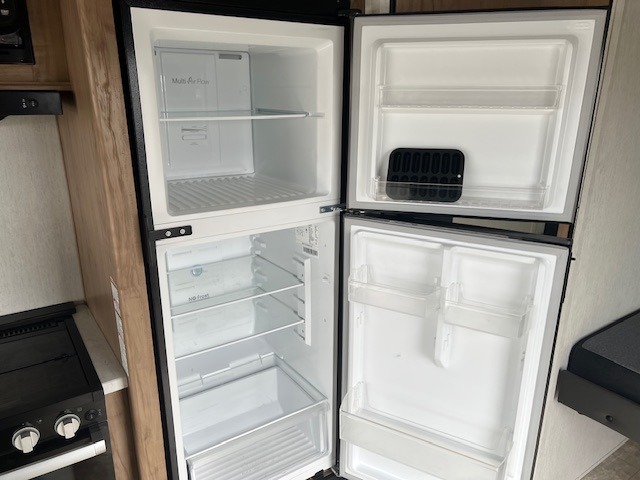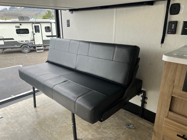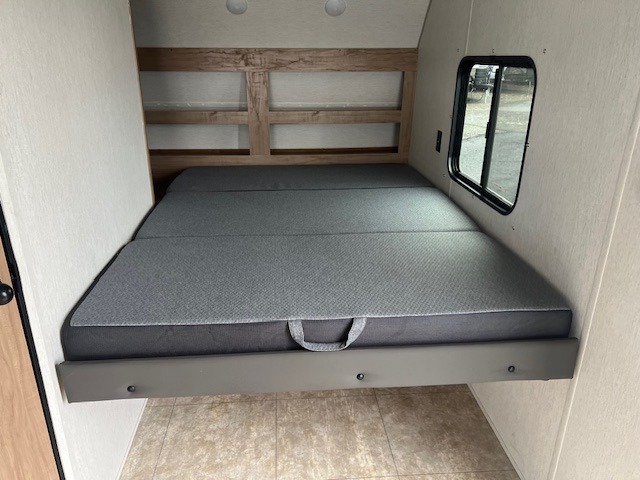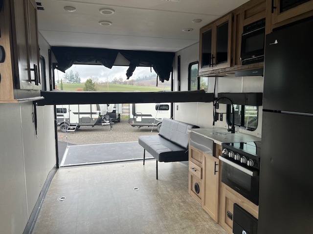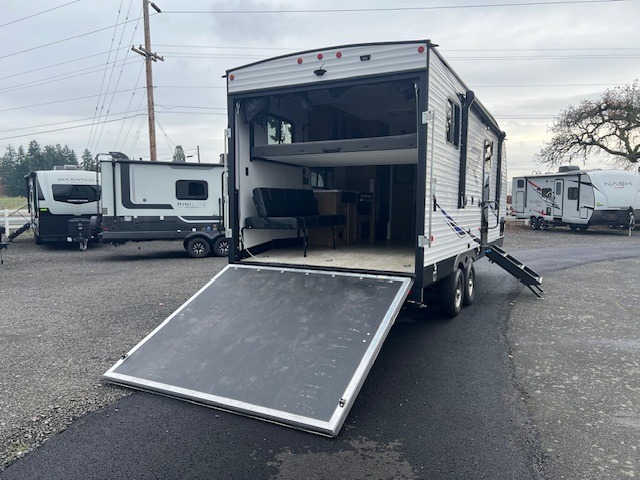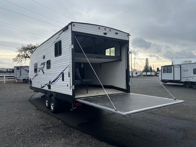 Enjoy each trip to the campground with this toy hauler that can sleep six people each night. When you arrive at your destination, set up the 12' patio awning, grab the lawn chairs from the outside storage compartment, and enjoy some fresh air. Inside, you can make lunch on the three burner cooktop or in the microwave oven, and there is a refrigerator here for your perishables. The full bath will allow you to clean up after trail riding, and the flip-up bed up front will provide a great night's rest. There is a quick set queen bed system in the garage area, plus dual flip-up sofas for your guests!