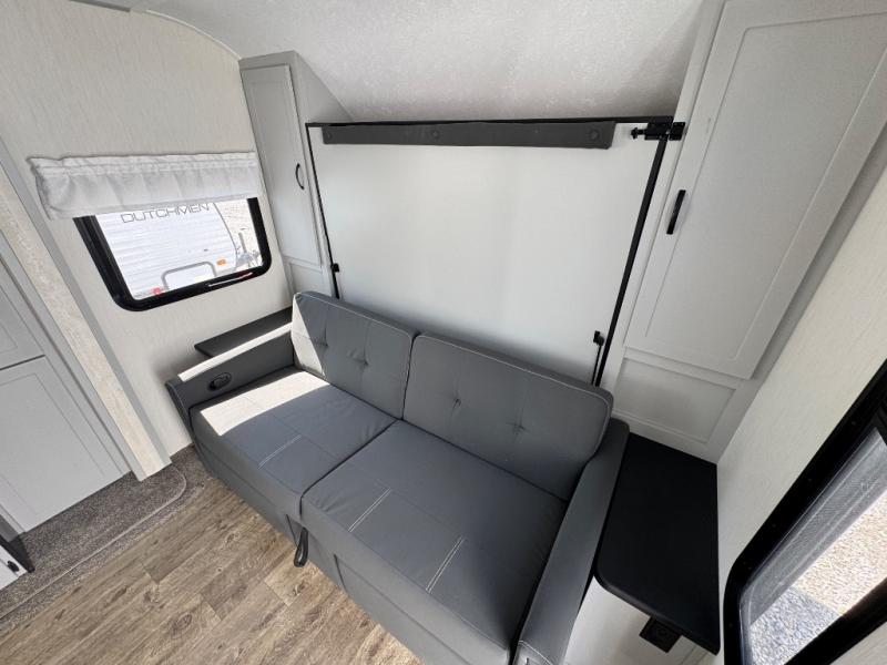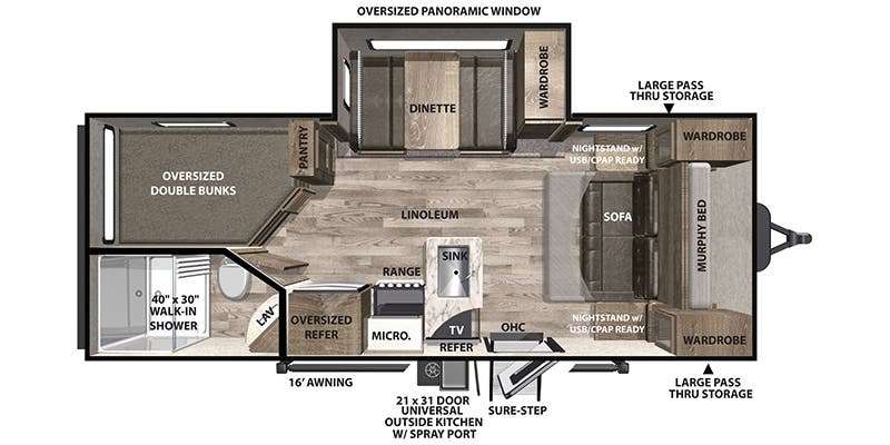 This double axle travel trailer will comfortably be your home away from home on all your adventures. Once you arrive at your destination, grab the fishing pole from the pass-through storage, then head down to the river. When you return, the chef of your group can prepare lunch on the three burner cooktop or use the exterior kitchen option that includes an outdoor grill. You will find sleeping space on the Murphy bed when the jackknife sofa in front isn't being used, and the kids will love having double-size bunks. There is also a booth dinette that will be perfect for meal times, game night, and additional sleeping space.