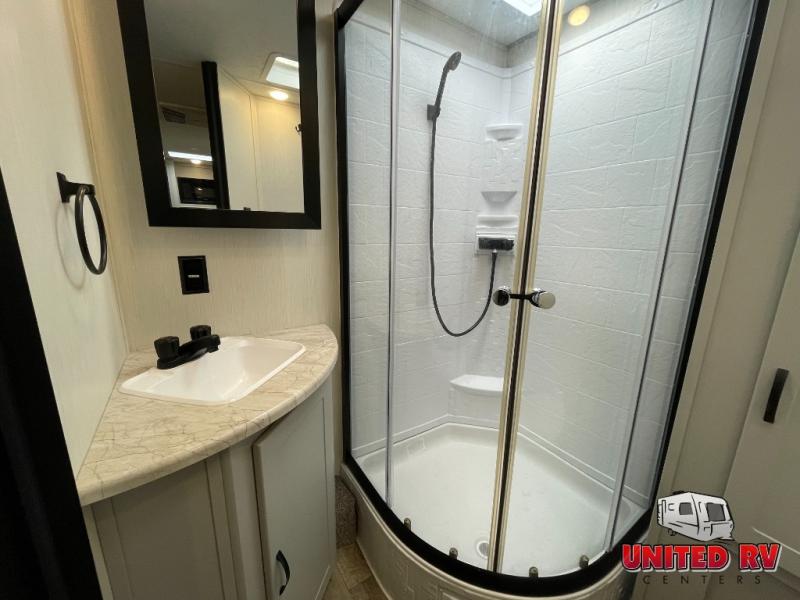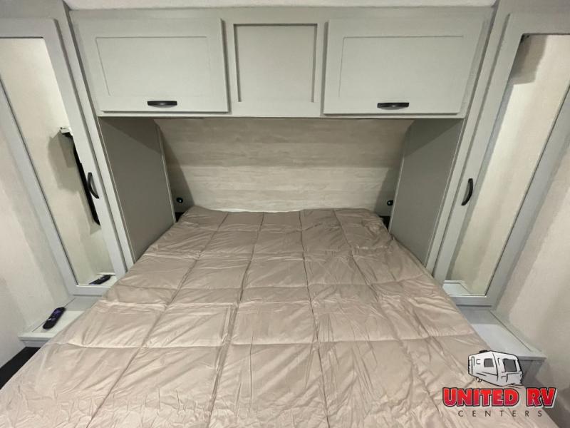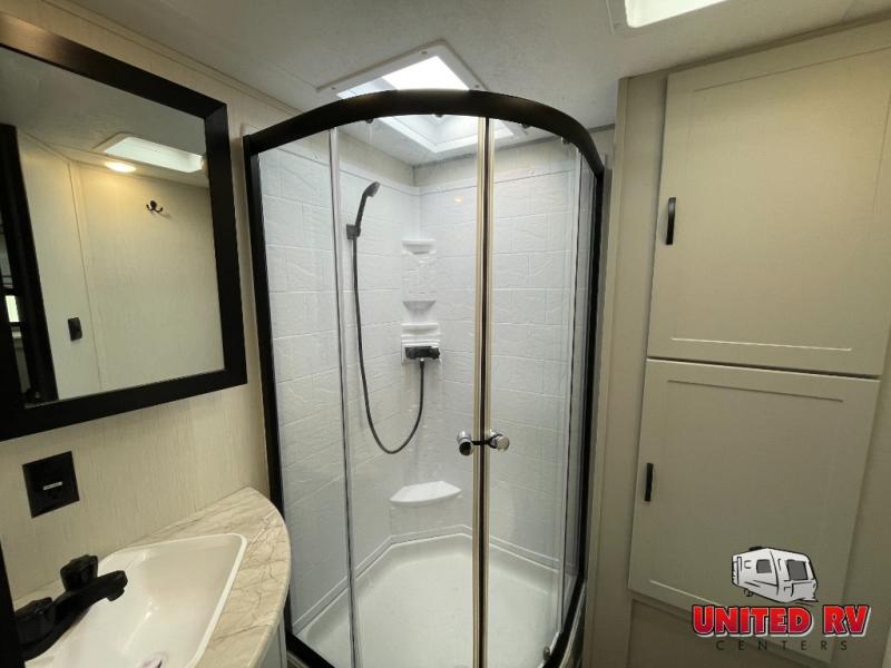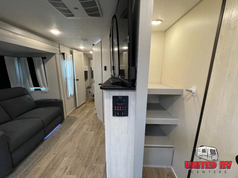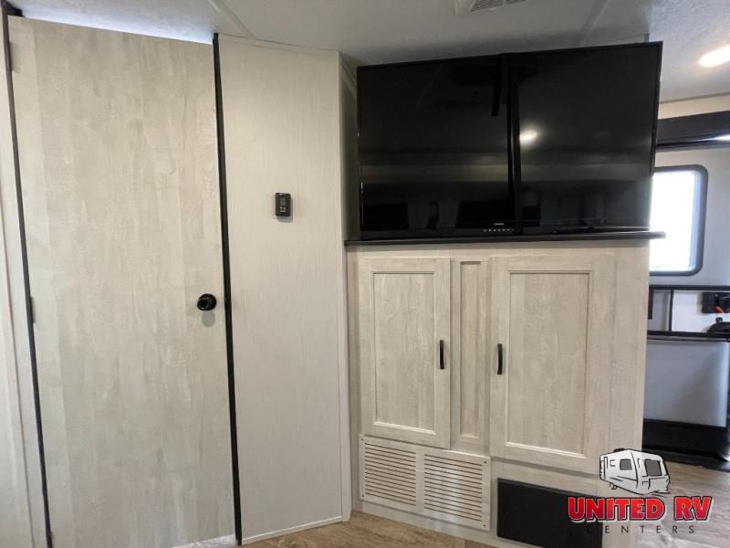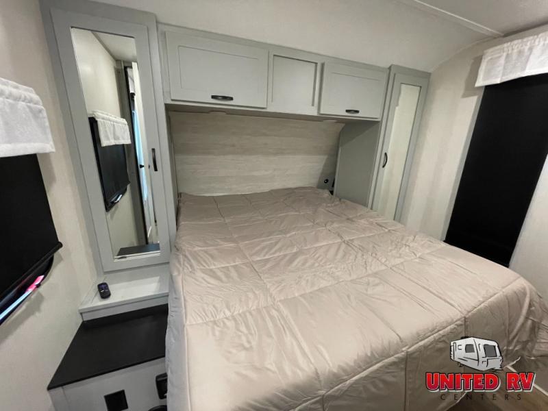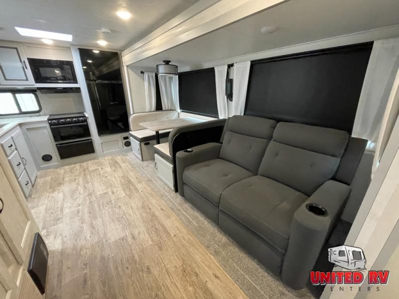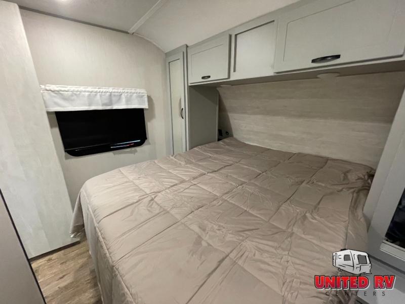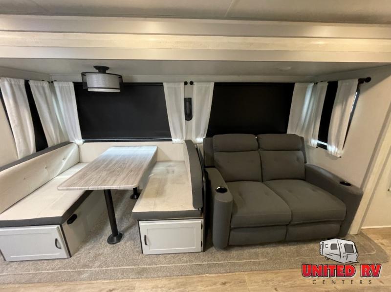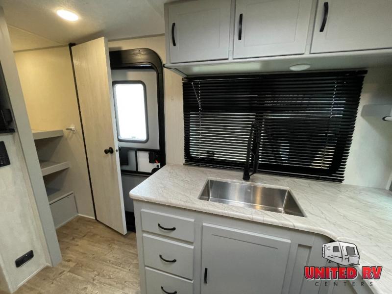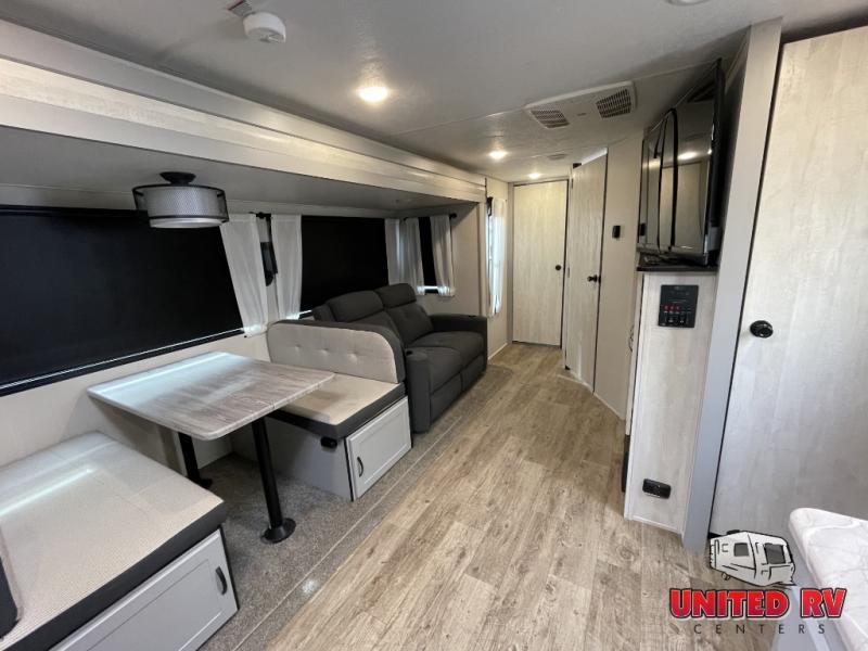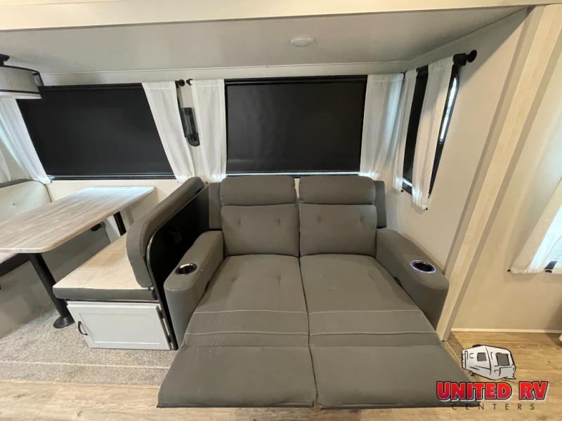 Your family will enjoy every camping trip in this cozy travel trailer. Whether you're cooking on the outside kitchen or indoors in the rear kitchen, you will have all the appliances needed for yummy meals each day. The large slide out with the booth dinette and sofa provide comfortable seating space during the day, and this area can become the kids' sleeping space at night. You and your spouse can take the front private bedroom with a queen bed and dual wardrobes for your clothes. And the full bath is conveniently located in the middle of the trailer for easy access each day. This model also includes tons of storage space for all your belongings, including an exterior large pass-through storage, and an interior walk-in pantry with shelves to store dry goods and snacks!