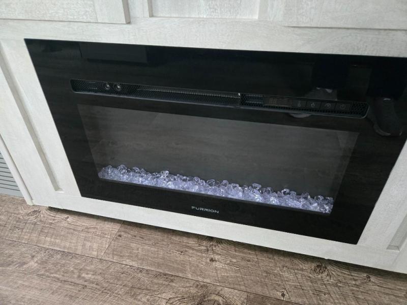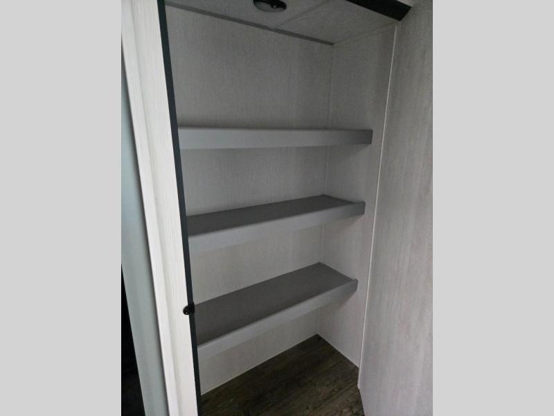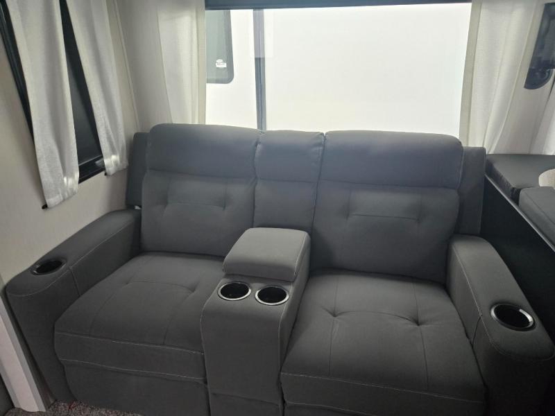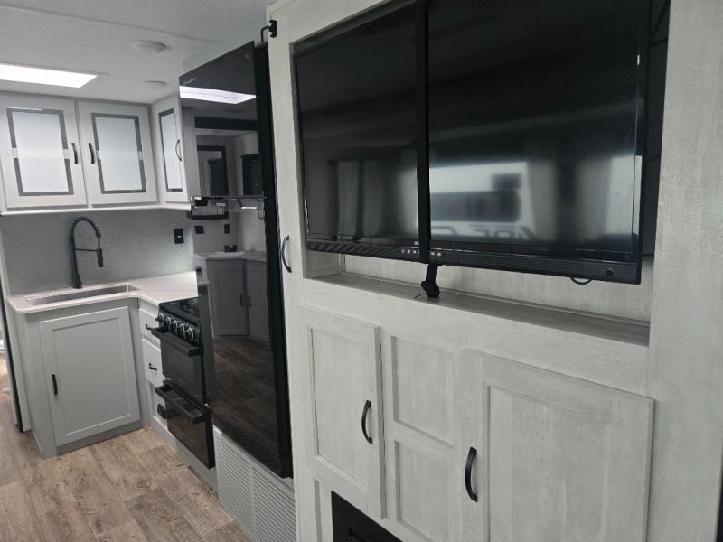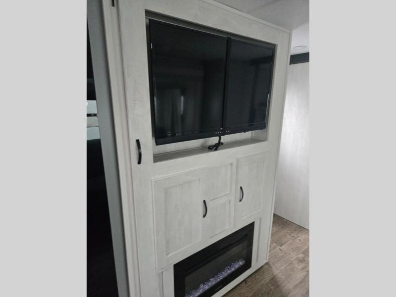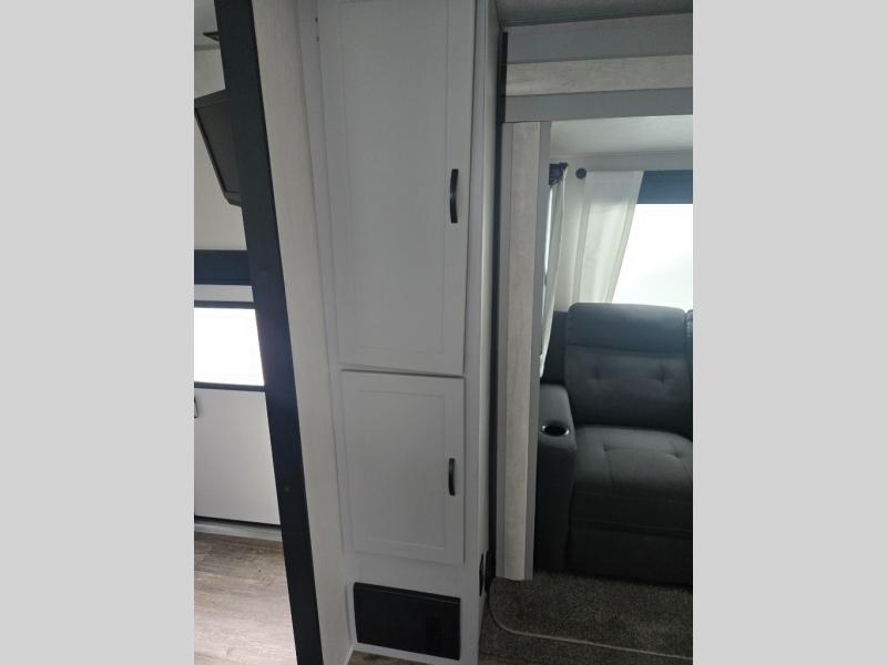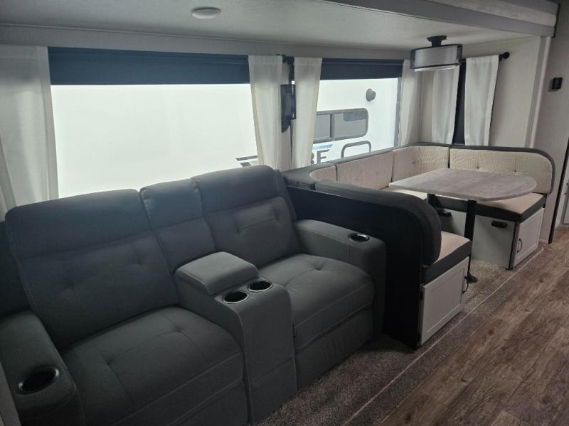 This travel trailer is decked out in features you will love having on your next family camping trip! Starting with the rear private bunkhouse that has an entertainment center, a 60" x 74" versa queen bed with 30" x 74" flip-down upper bunk and a 30" x 32" flip-down bunk with a cabinet below, and a cargo door below it all. The living area has theater seating across from a recessed TV that swings open and has a storage cubby behind it so you can store your games and movies. After you have prepared a delicious meal with the cooktop or at the outside kitchen with spray port and 21" x 31" universal door, you can head to the 49" x 78" U-shaped dinette to enjoy it there. The separated bathroom has a 36" x 30" walk-in shower, and leads directly into the front private bedroom which has a queen bed with storage underneath!