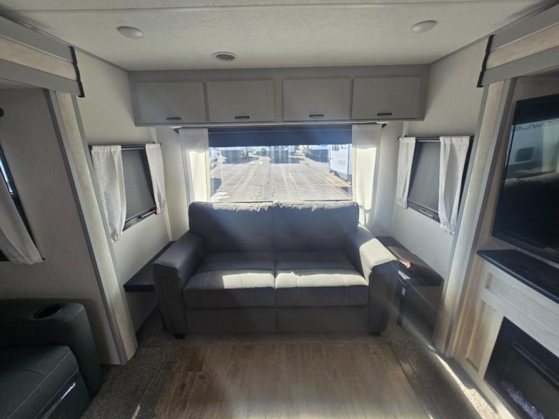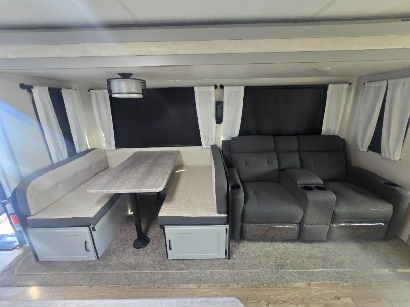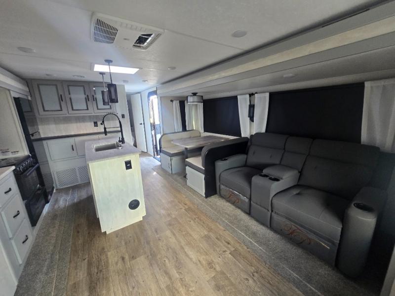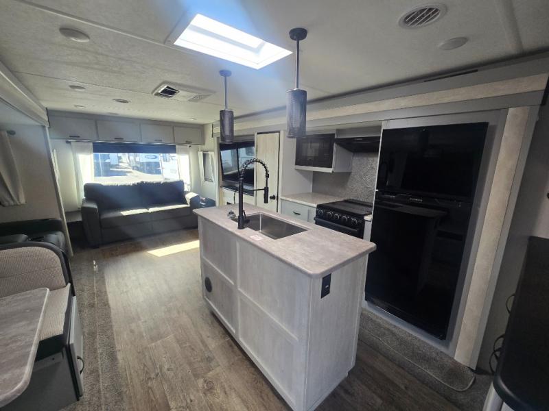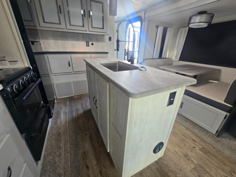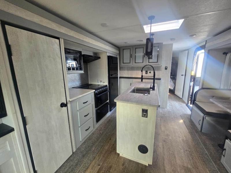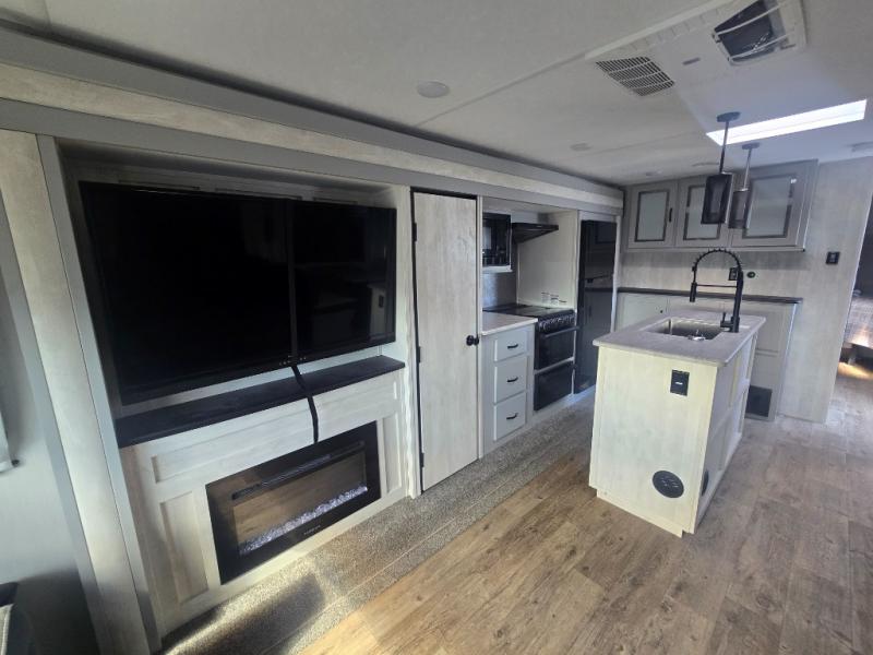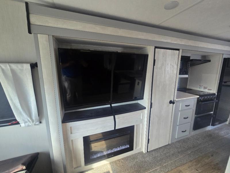 This travel trailer allows you to enjoy the Great Outdoors without having to give up your creature comforts. The dual opposing slides provide the chef space to work around the kitchen island, and there is plenty of seating space for your guests on the dual recliners, the sleeper sofa, and the booth dinette. The fireplace and LCD TV will be perfect for those rainy days, and there is even a living area skylight to let natural light in. This model also includes Sure-Step entry steps, a large pass-through storage, plus two power awnings with LED lights so you can spend more time outdoors with friends and family!