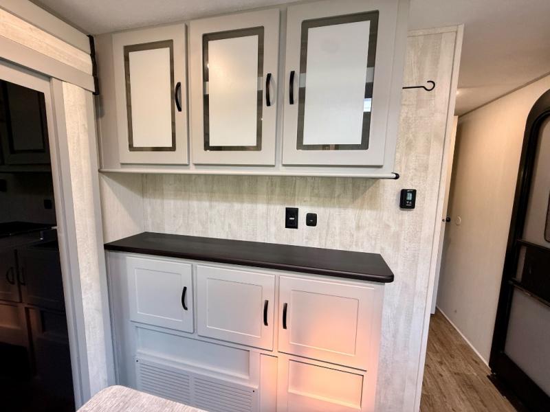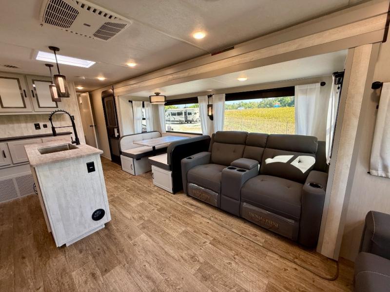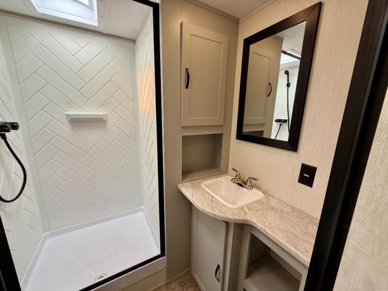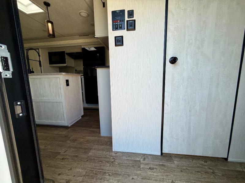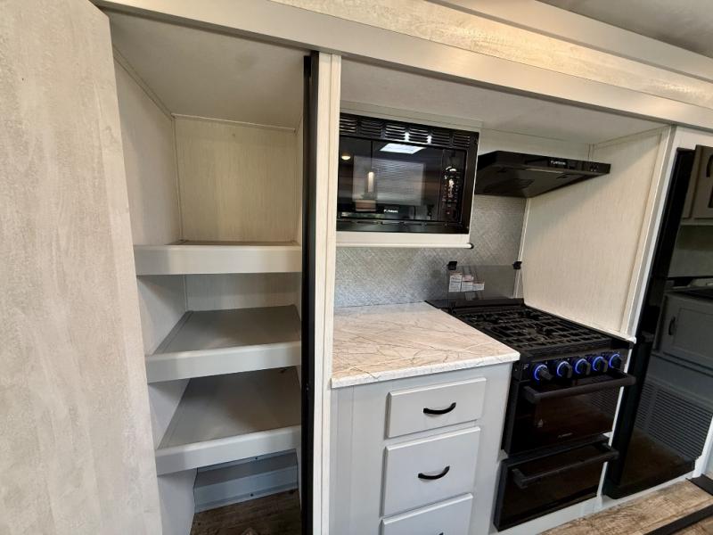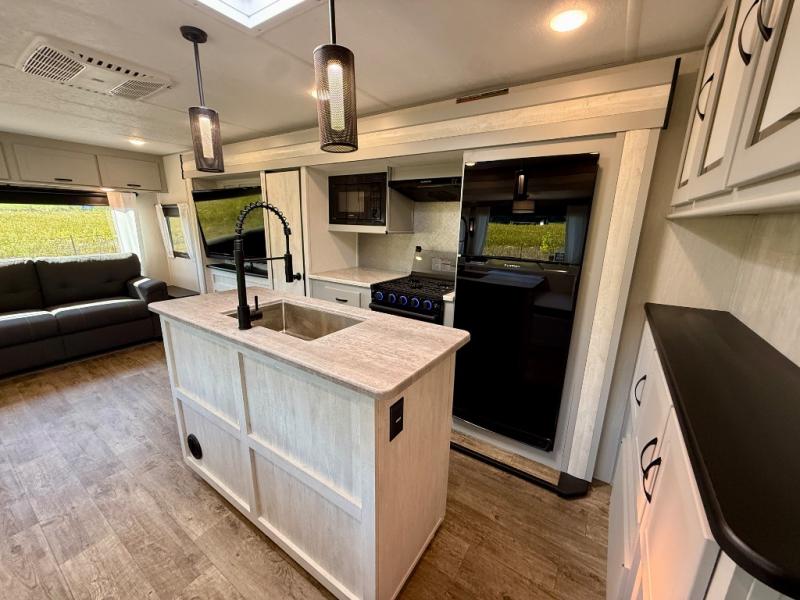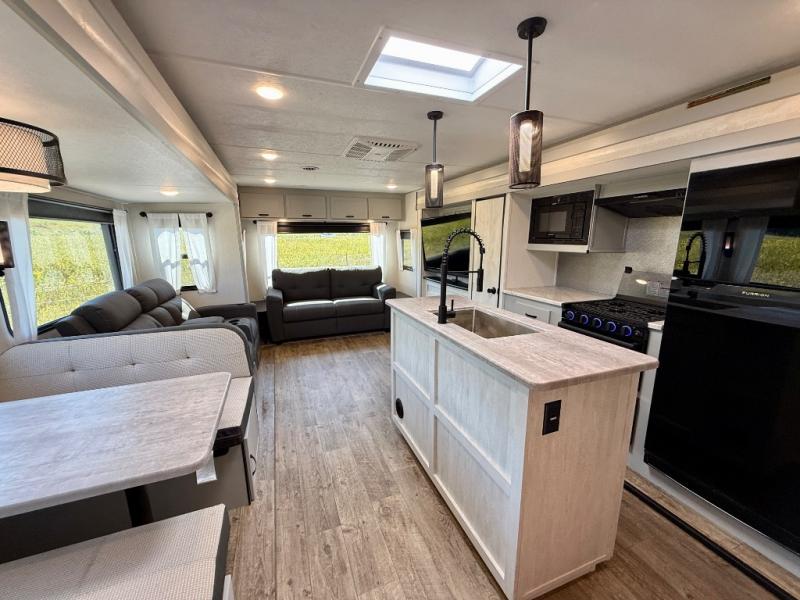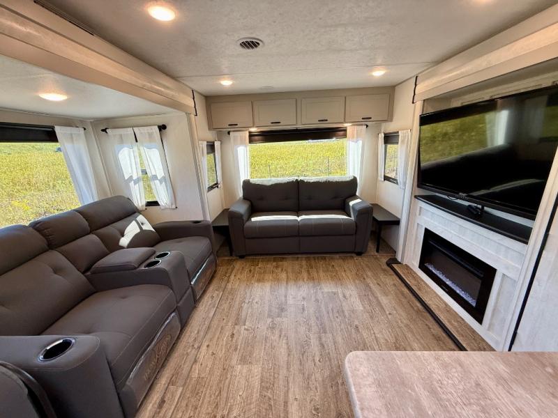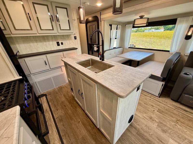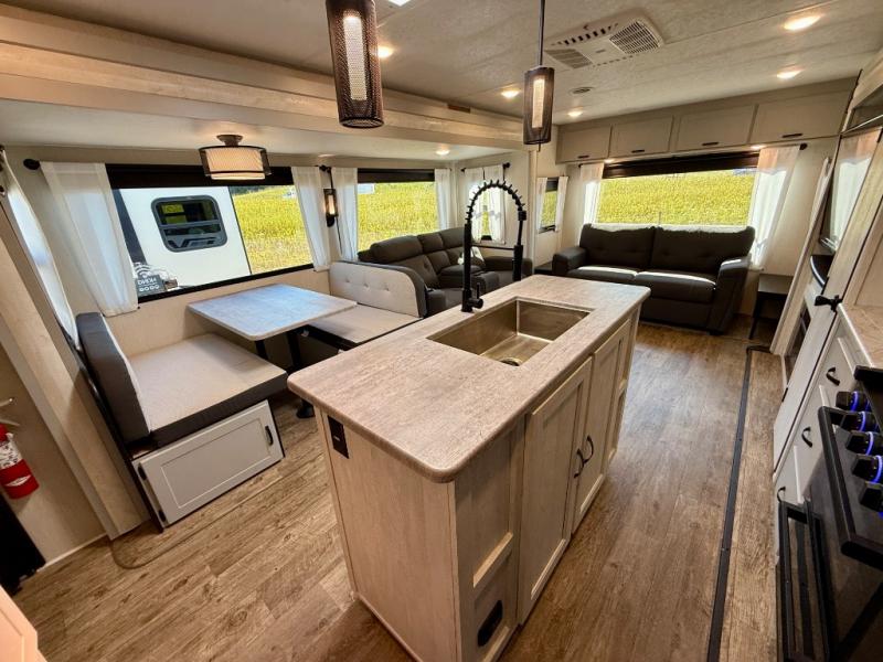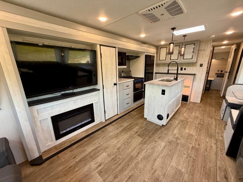 This travel trailer allows you to enjoy the Great Outdoors without having to give up your creature comforts. The dual opposing slides provide the chef space to work around the kitchen island, and there is plenty of seating space for your guests on the dual recliners, the sleeper sofa, and the booth dinette. The fireplace and LCD TV will be perfect for those rainy days, and there is even a living area skylight to let natural light in. This model also includes Sure-Step entry steps, a large pass-through storage, plus two power awnings with LED lights so you can spend more time outdoors with friends and family!