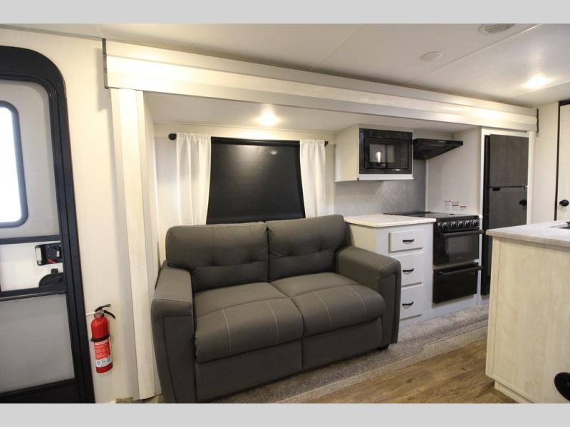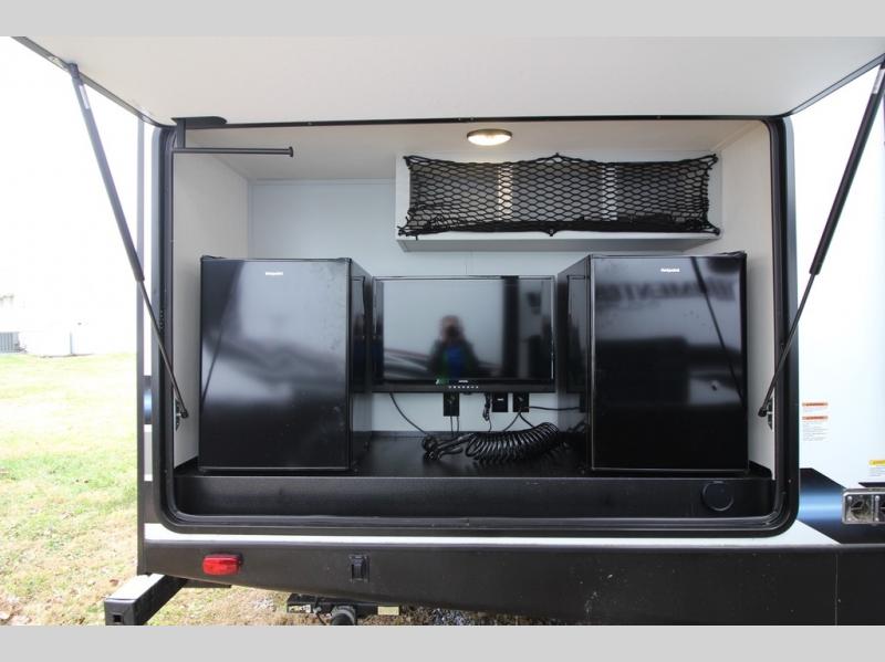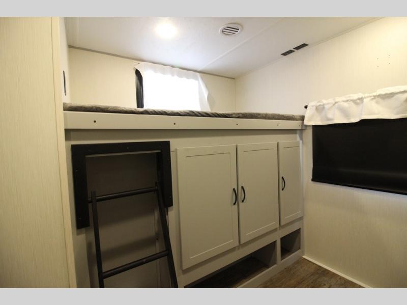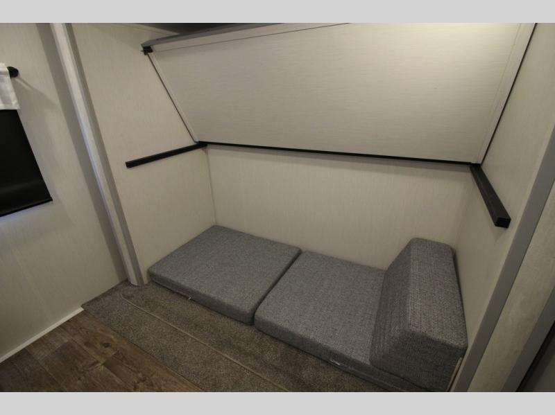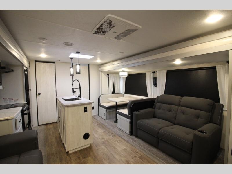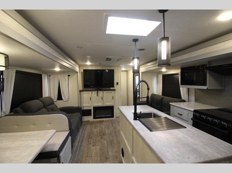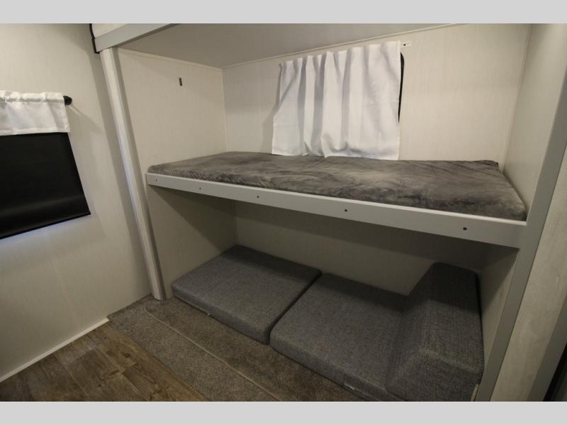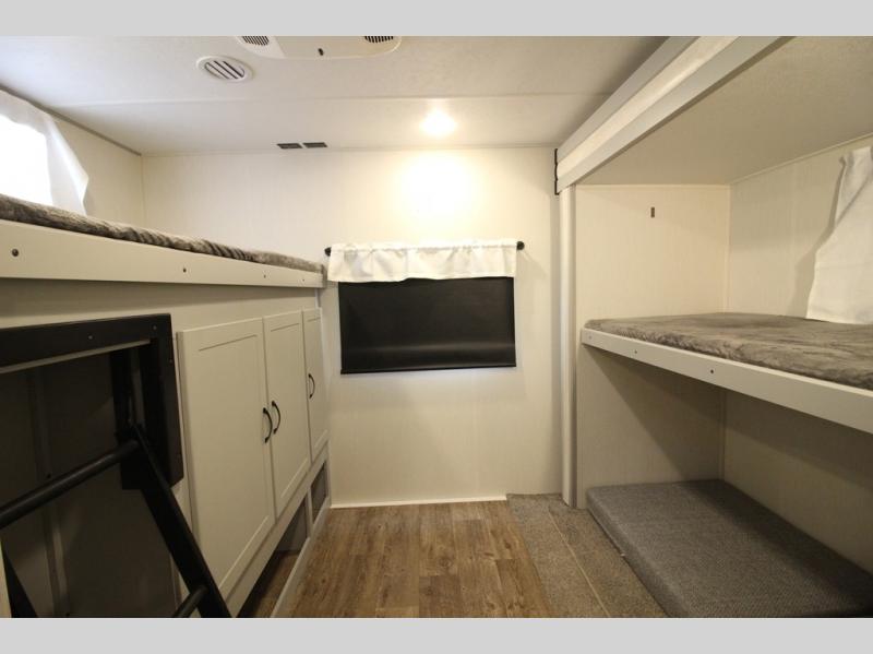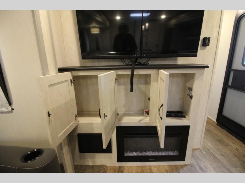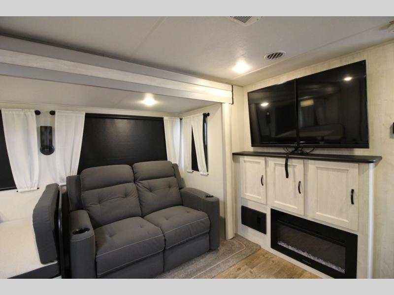 Whether you enjoy spending time outdoors or indoors, there is something for everyone in this travel trailer. The large pass-through storage can store your fishing poles, and the 20' electric awning with LED lights will create an outdoor living space. There is even an exterior baggage door with two exterior refrigerators, a TV, a spray port, and storage for snacks! You will love all the interior space thanks to the dual opposing slides in the main living area, which will give the chef space to work around the kitchen island. Your crew can visit on the two tri-fold sofas and booth dinette while the fireplace is going, but you'll probably find the kids spending most of their time in the private bunkhouse! They will have two bunks, Vibe cubes, a slide out for more space, plus a wardrobe to store all their clothes. What more could you want in a travel trailer?!