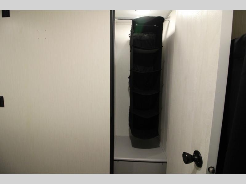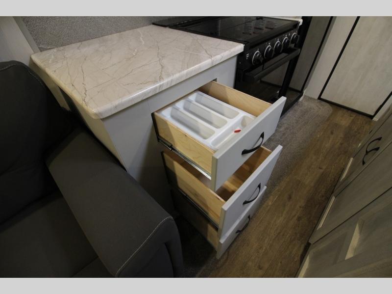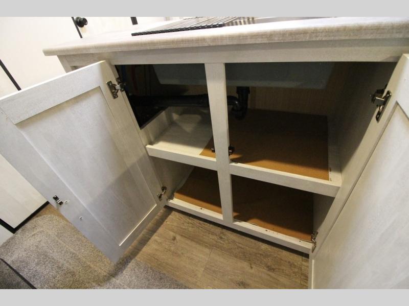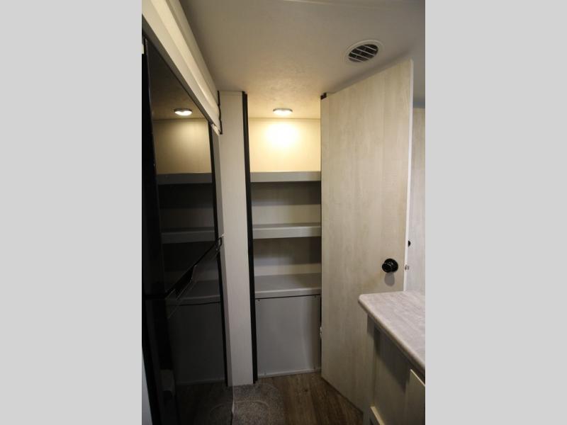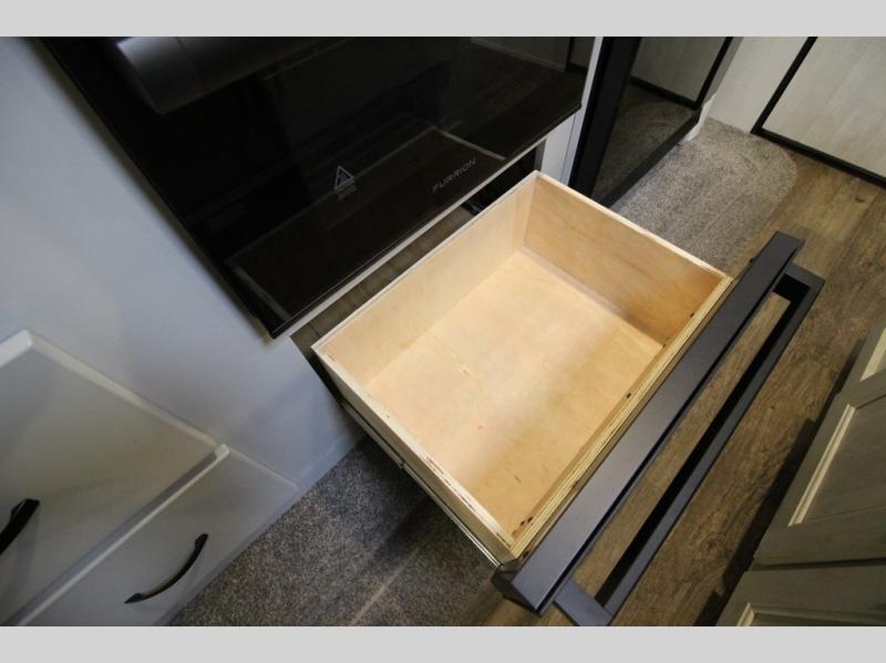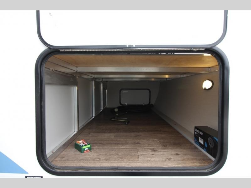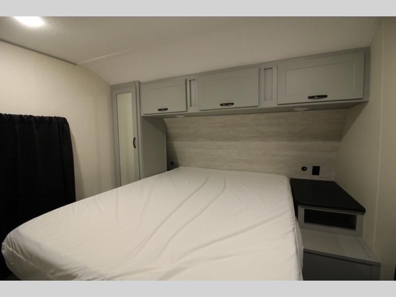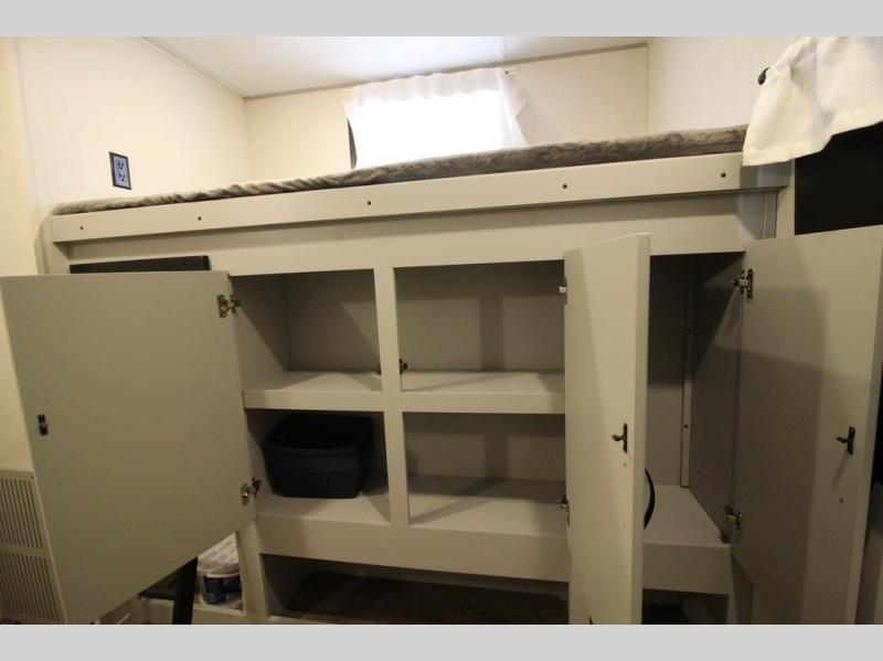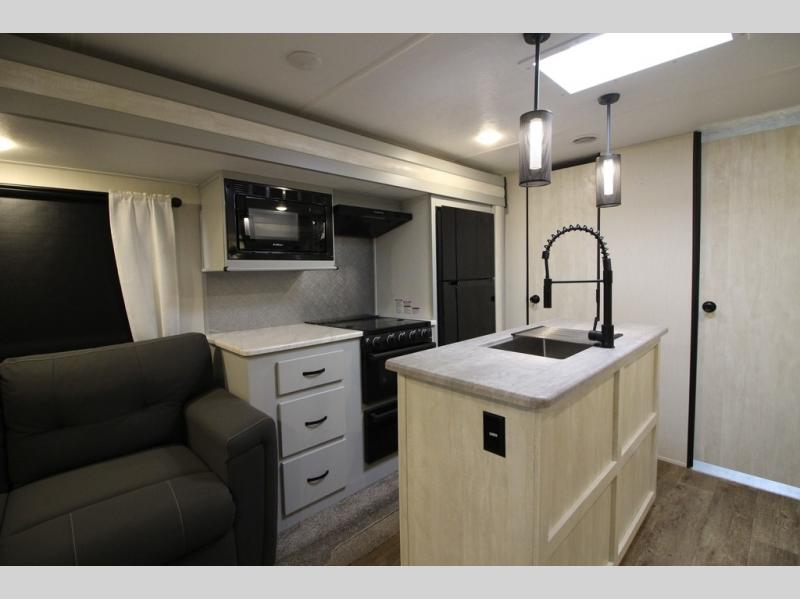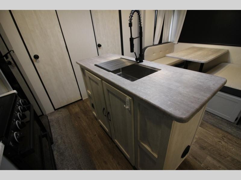 Whether you enjoy spending time outdoors or indoors, there is something for everyone in this travel trailer. The large pass-through storage can store your fishing poles, and the 20' electric awning with LED lights will create an outdoor living space. There is even an exterior baggage door with two exterior refrigerators, a TV, a spray port, and storage for snacks! You will love all the interior space thanks to the dual opposing slides in the main living area, which will give the chef space to work around the kitchen island. Your crew can visit on the two tri-fold sofas and booth dinette while the fireplace is going, but you'll probably find the kids spending most of their time in the private bunkhouse! They will have two bunks, Vibe cubes, a slide out for more space, plus a wardrobe to store all their clothes. What more could you want in a travel trailer?!