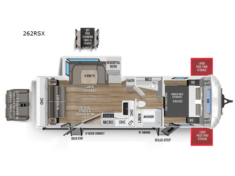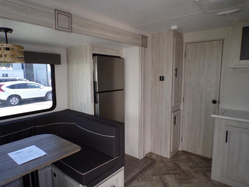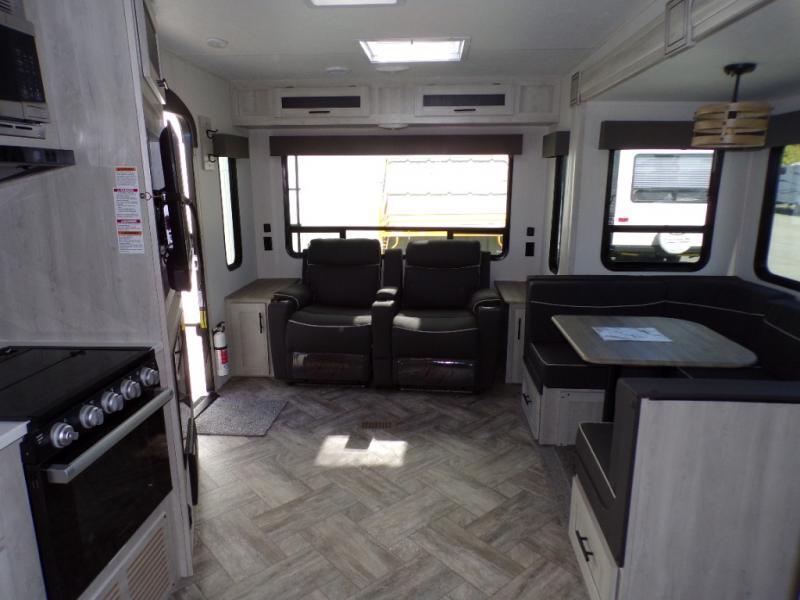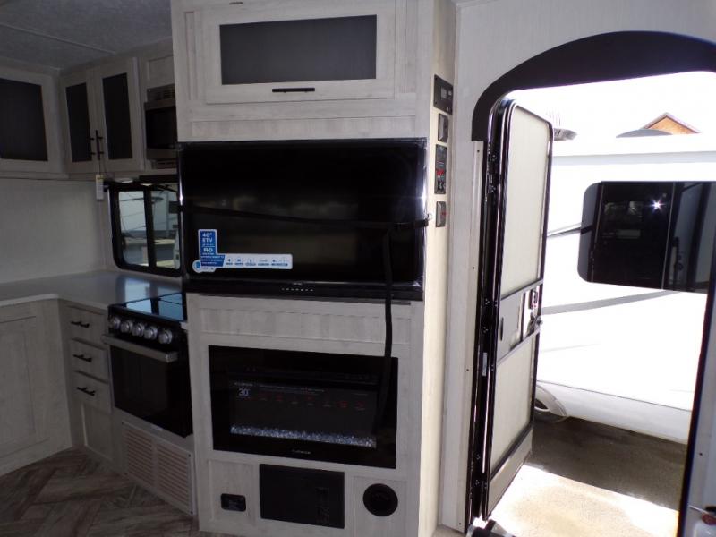 This dual entry travel trailer is perfect for the group of six looking for adventures. The U-shaped dinette slide out will provide more space to relax, and the tri-fold sofa by the fireplace will give a more at-home feel. You'll appreciate the pantry for storing dry goods and snacks, plus there are large drawers under the dinette for even more storage. This model includes a walk-through bath that will create a front master bedroom you are sure to love. The king bed includes under-bed storage for extra blankets, plus there are dual nightstands and dual shirt closets for all your items. This model can easily become a couple's trailer by choosing the optional free-standing table and the optional theater seating in place of the U-shaped dinette and sofa!