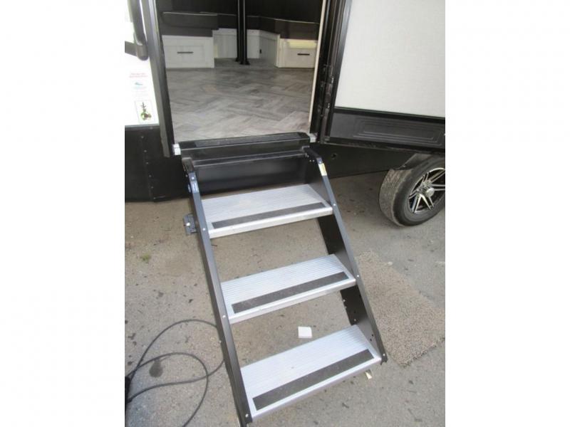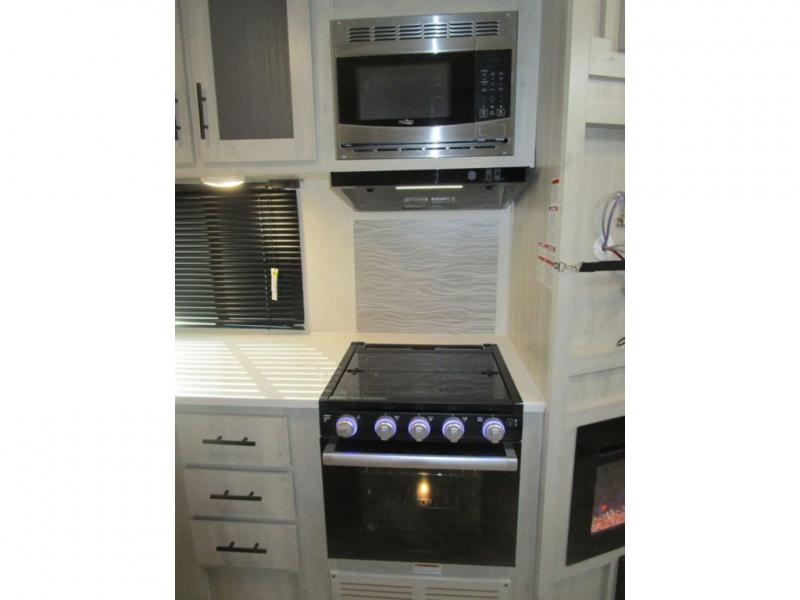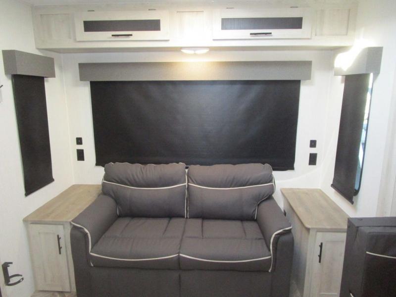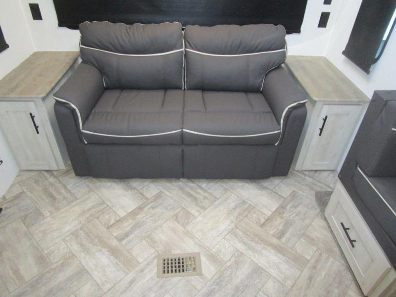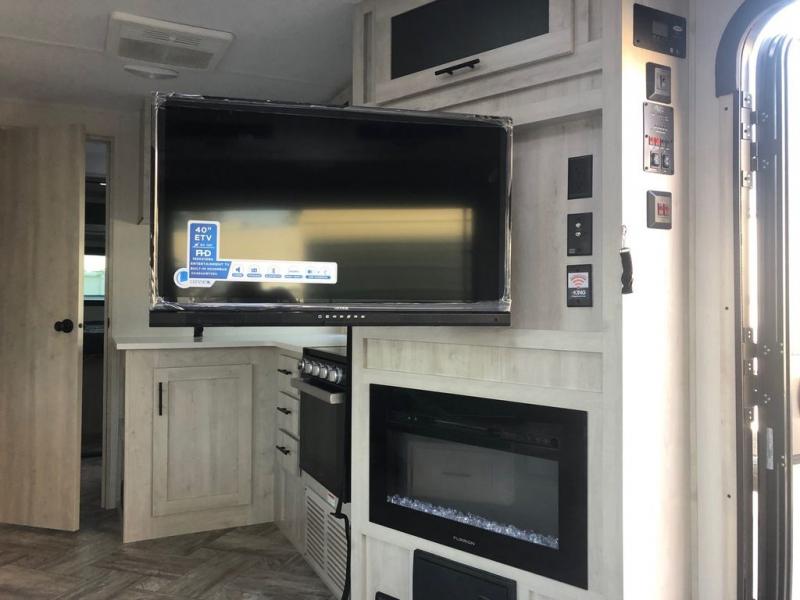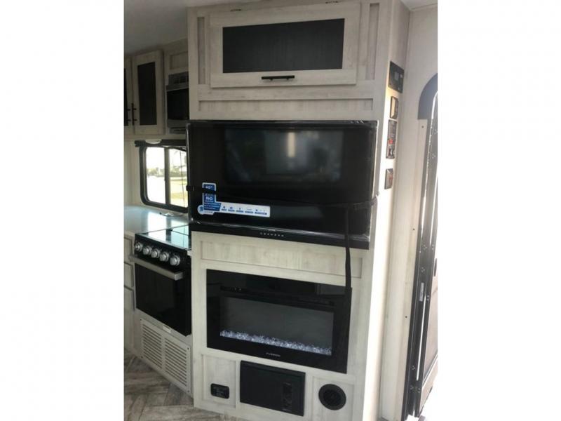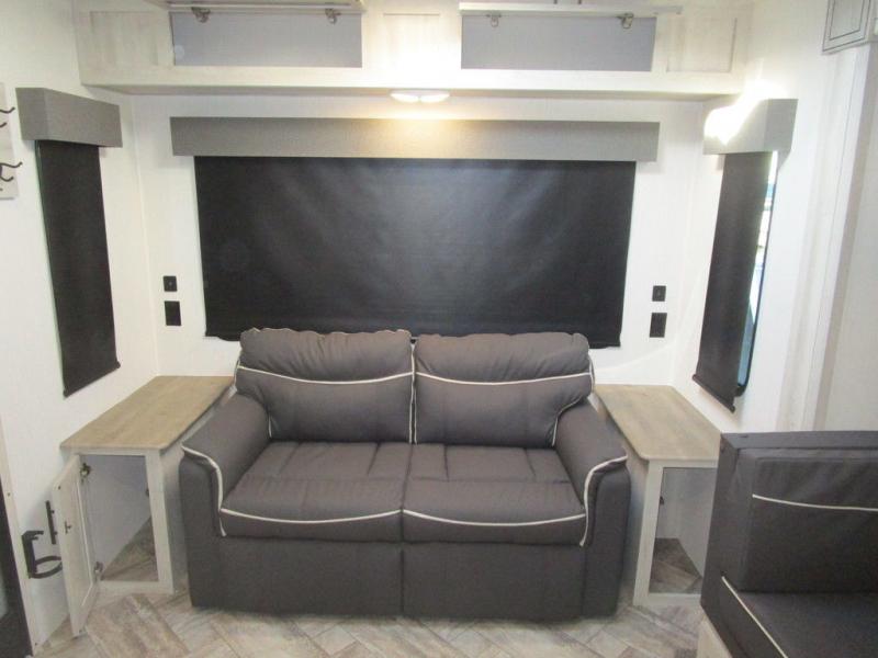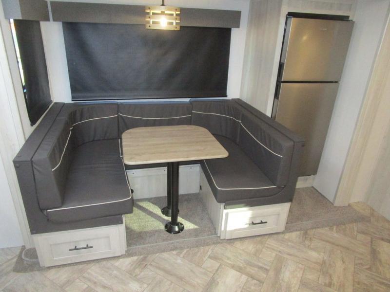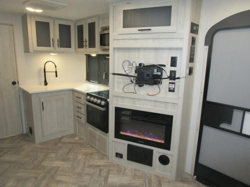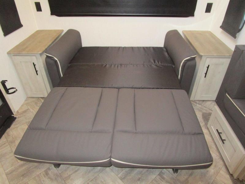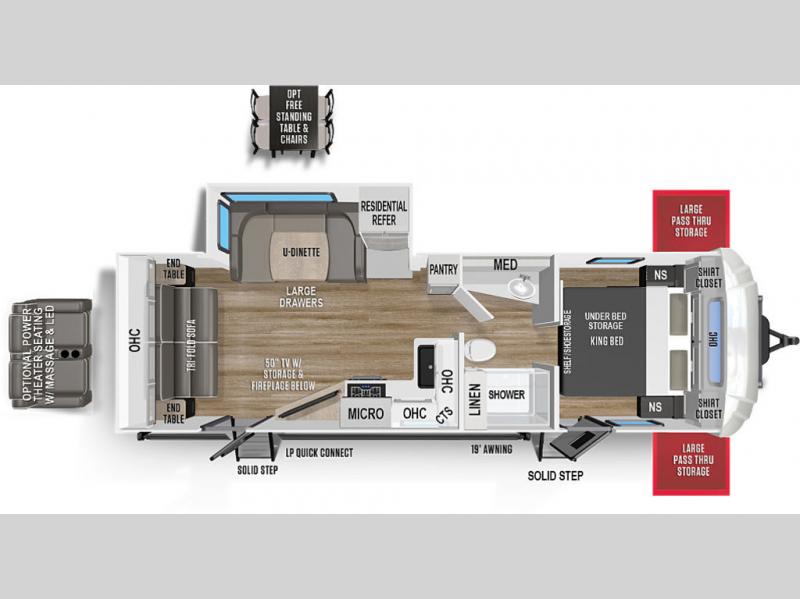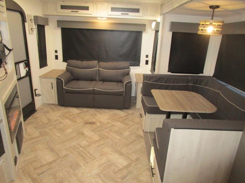 This dual entry travel trailer is perfect for the group of six looking for adventures. The U-shaped dinette slide out will provide more space to relax, and the tri-fold sofa by the fireplace will give a more at-home feel. You'll appreciate the pantry for storing dry goods and snacks, plus there are large drawers under the dinette for even more storage. This model includes a walk-through bath that will create a front master bedroom you are sure to love. The king bed includes under-bed storage for extra blankets, plus there are dual nightstands and dual shirt closets for all your items. This model can easily become a couple's trailer by choosing the optional free-standing table and the optional theater seating in place of the U-shaped dinette and sofa!