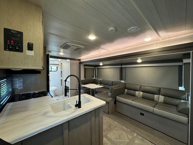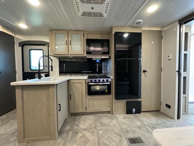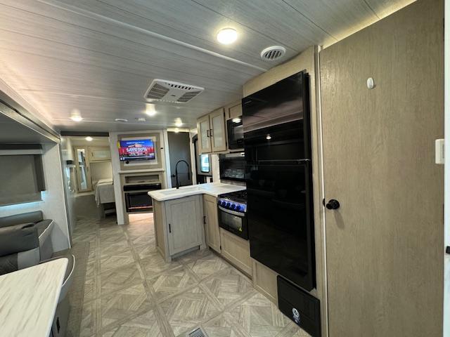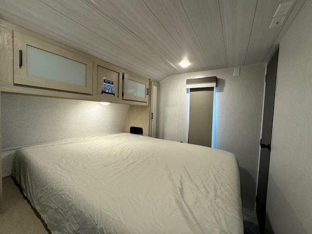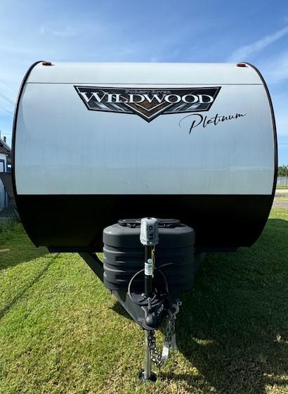 The wildwood weighs 6721 lbs., is 31' 9" long, and sleeps 4 to 6. Come in the front door and you are in the living area with a 32" TV, AM, FM, Bluetooth radio, sofa that makes a bed and behind the TV wall is a pantry/ closet. Come in the front door and turn left and you are in the kitchen area with a 3 -burner stove with oven, large frig and freezer, microwave, and plenty of drawers and cabinets for storage. Across from the kitchen is a bench seat dinette that can make a bed. Continue toward the back and you are in a larger than normal bathroom with a large shower, toilet, vanity with sink, and medicine chest. Come in the front door and turn right you are in the bedroom with a Queen Walk around bed and a closet on each side for hanging clothes.