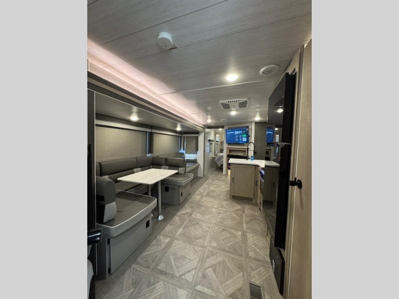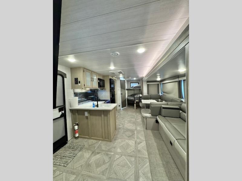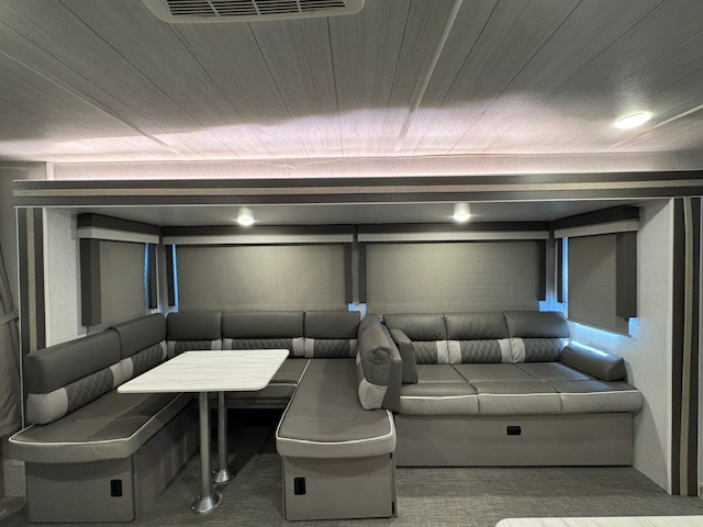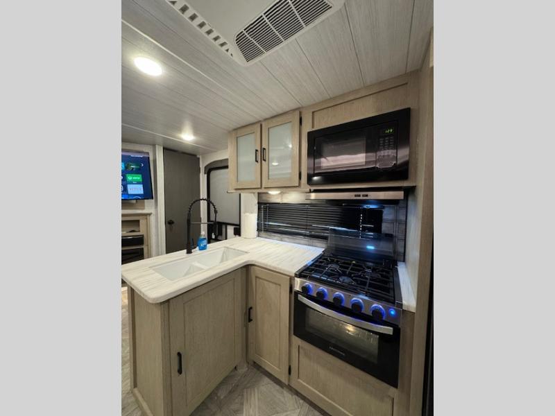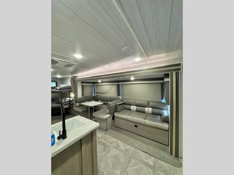 The Kitchen is in the middle of the RV with an oversized frig and freezer, walk in pantry, 3-burner stove, microwave, double sink, and plenty of cabinets an drawers for storage. Eat your meals at your bench seat dinette that can go down to a bed.